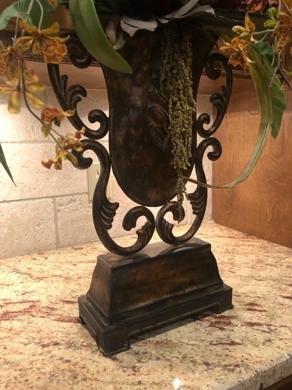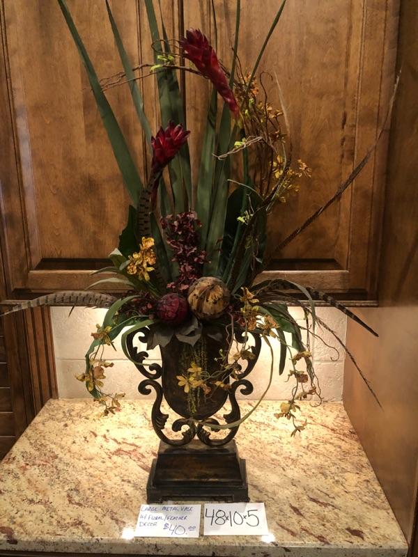 Large Metal Vase w/floral/feather decor