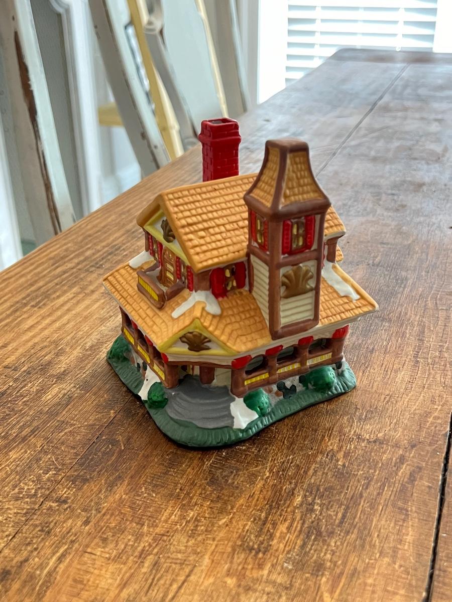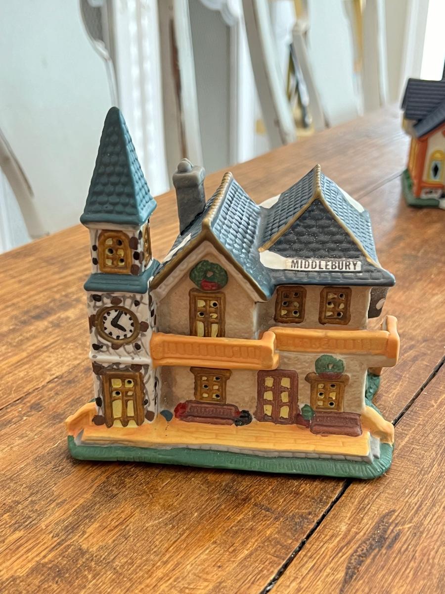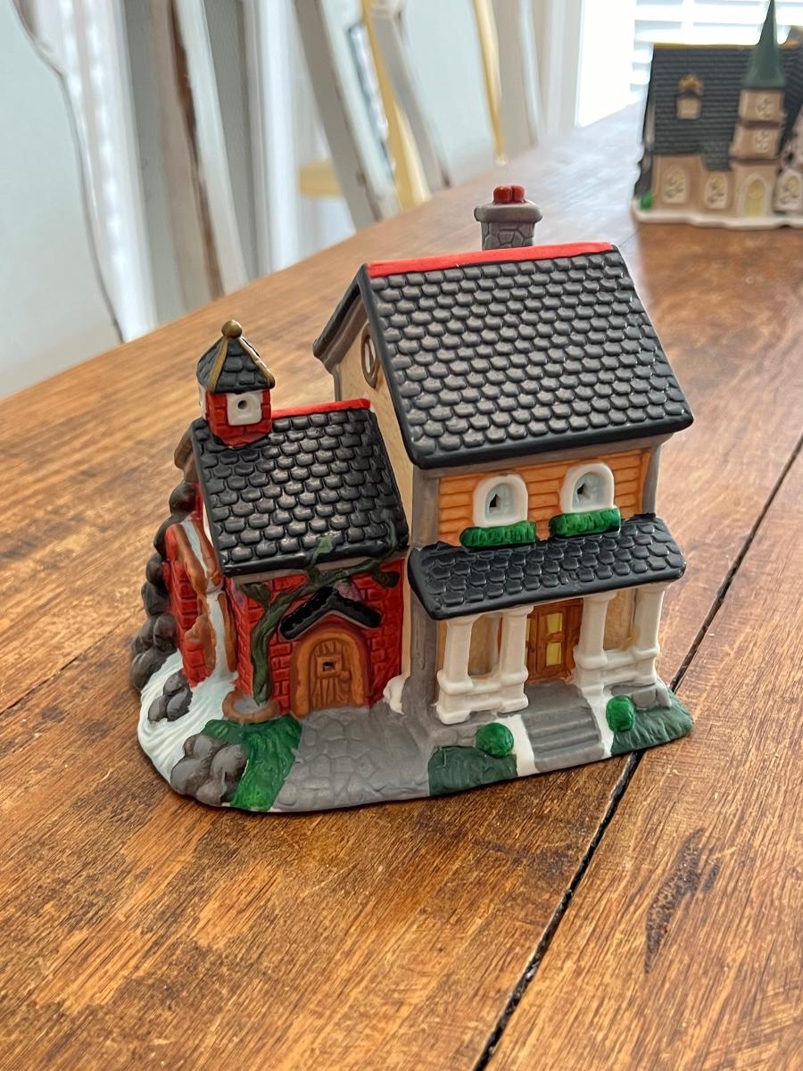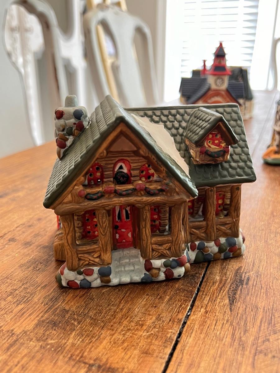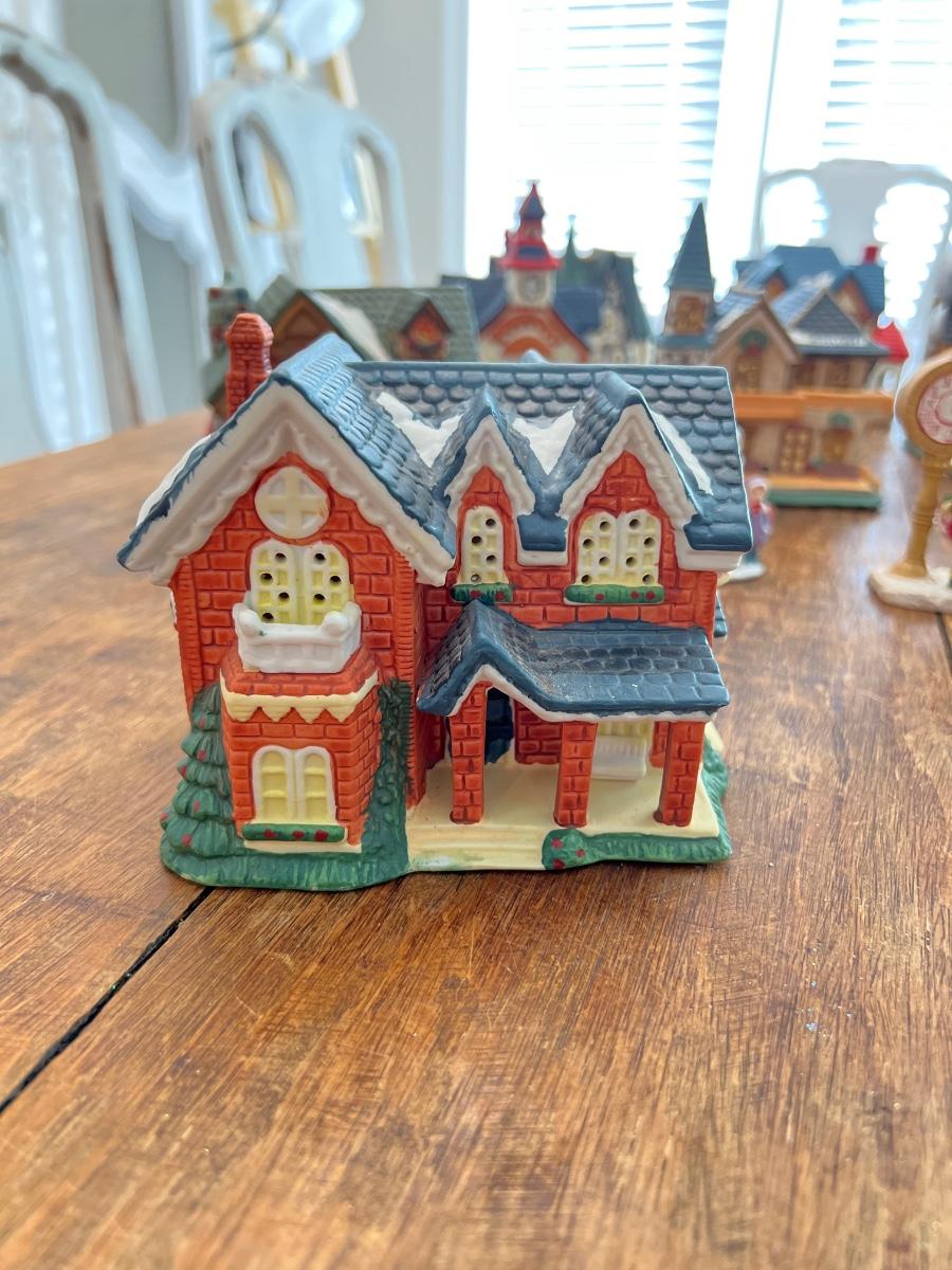 Includes 10 buildings & 6 village people ~ Each building is approximately 5” H x 6” W x 5” D ~ Comes with a string of lights that work ~ Table & chairs are not for sale.