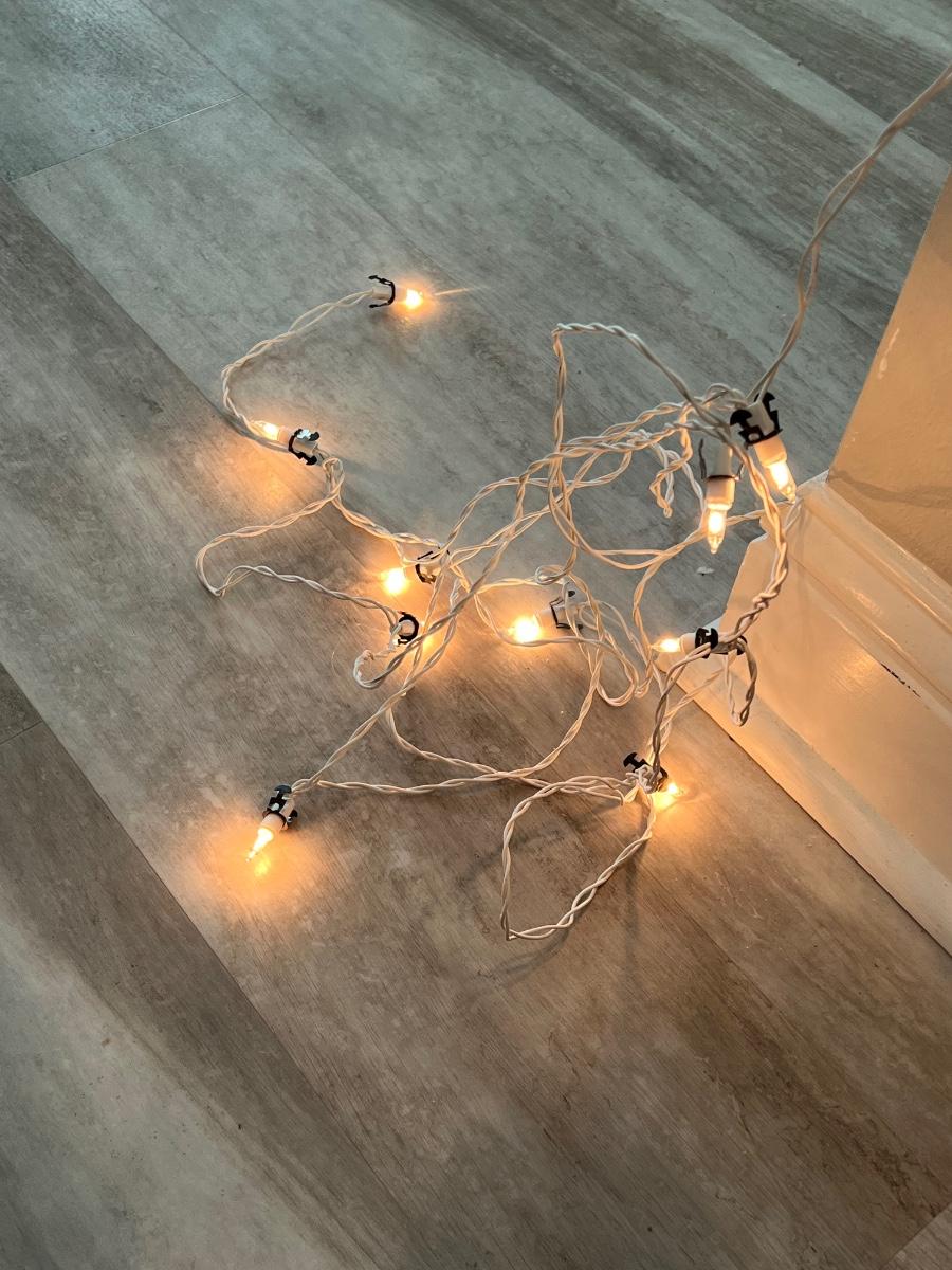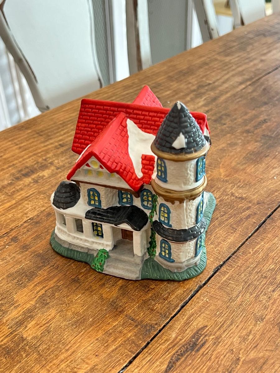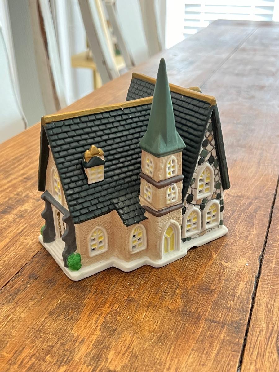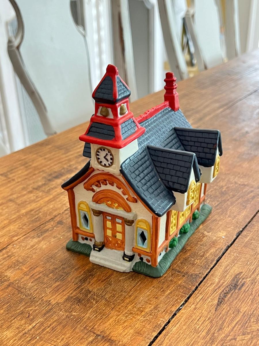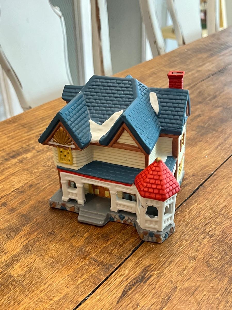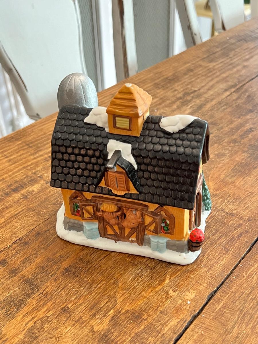Includes 10 buildings & 6 village people ~ Each building is approximately 5” H x 6” W x 5” D ~ Comes with a string of lights that work ~ Table & chairs are not for sale.
