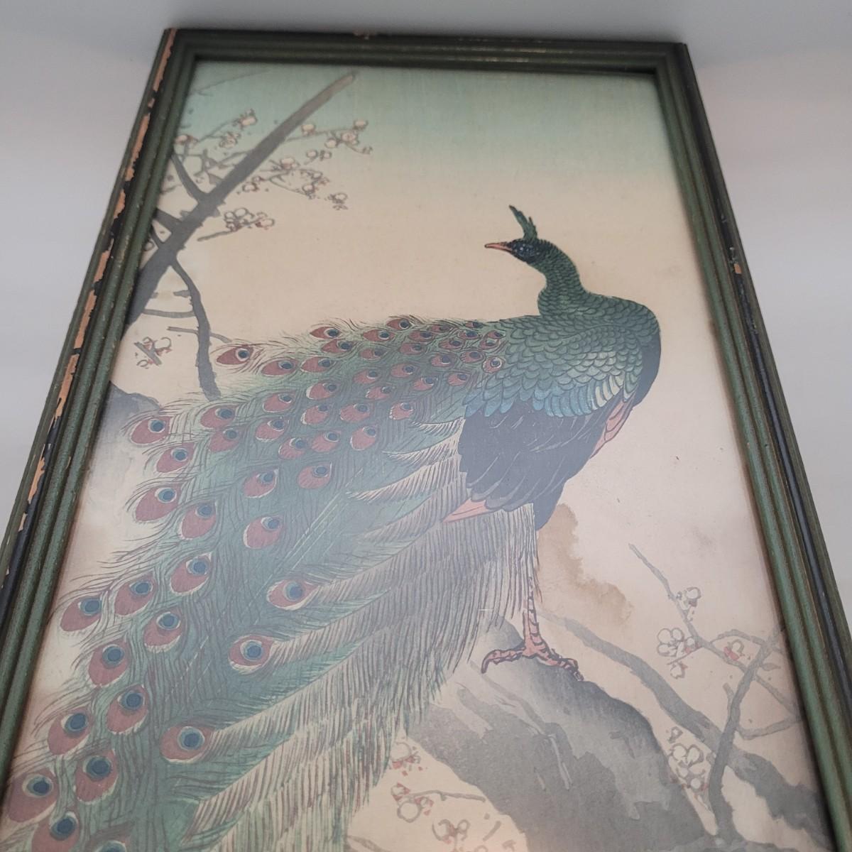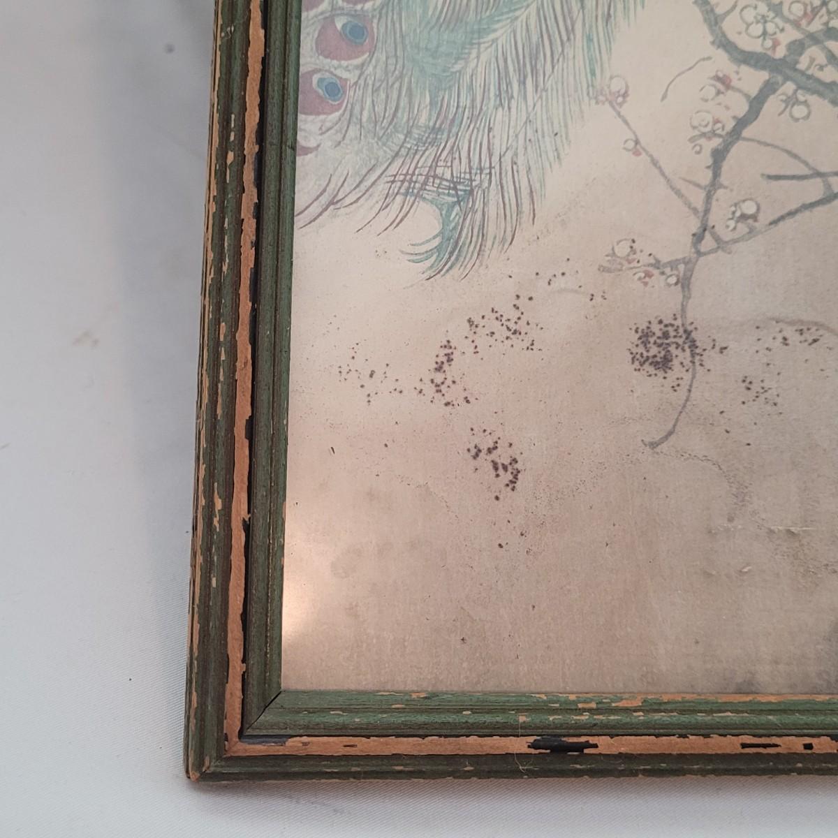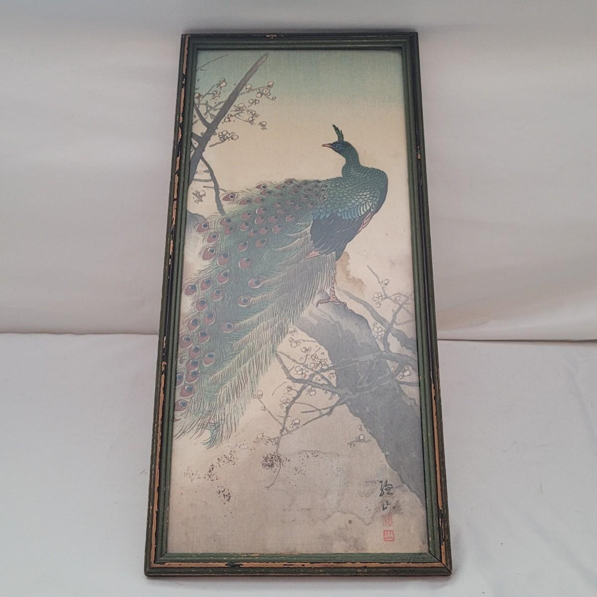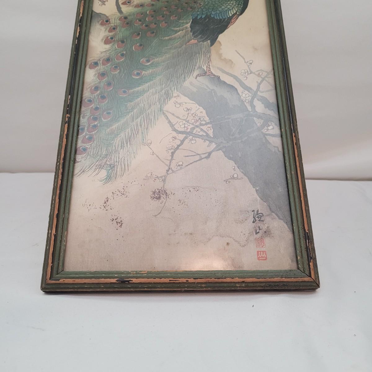 Japanese traditional woodblock print titled "Peacock and Plum Blossom" by Ito Sozan, Frame measures 7" x 16" x 1/2"H. Under glass. The wood frame is showing signs of wear. Has an attached wire for hanging. Stamp and seal state artist and authenticity.