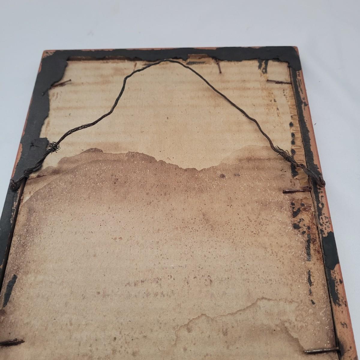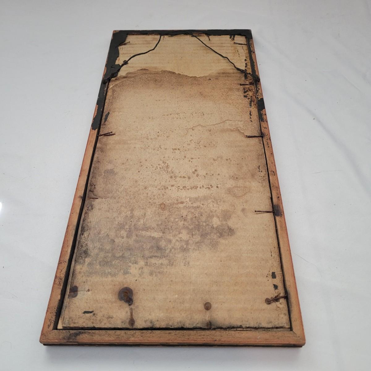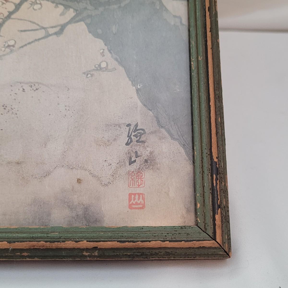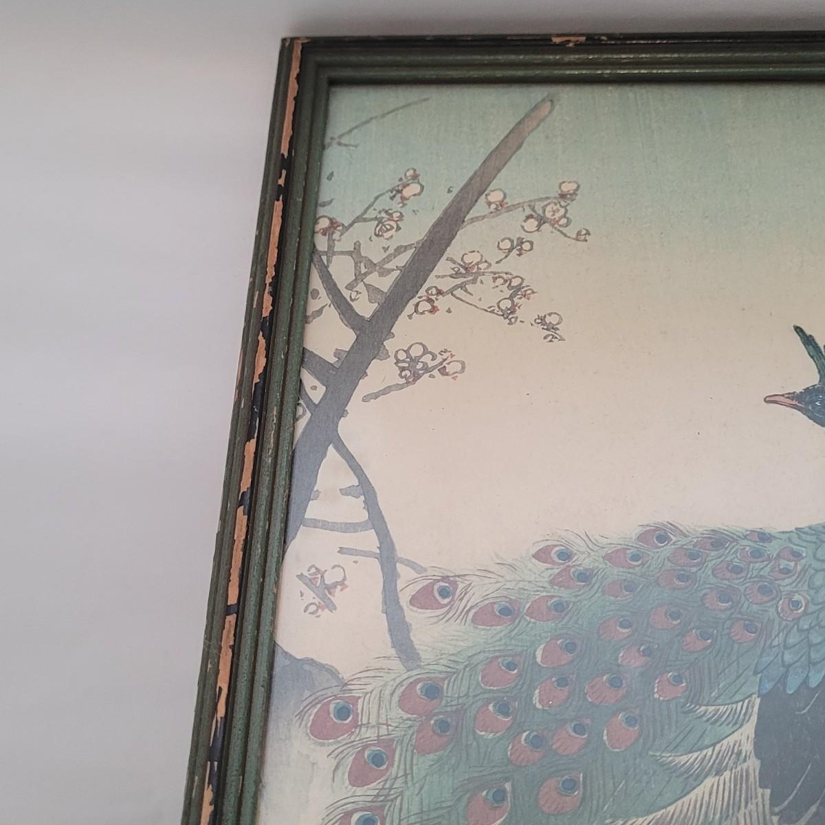 Japanese traditional woodblock print titled "Peacock and Plum Blossom" by Ito Sozan, Frame measures 7" x 16" x 1/2"H. Under glass. The wood frame is showing signs of wear. Has an attached wire for hanging. Stamp and seal state artist and authenticity.