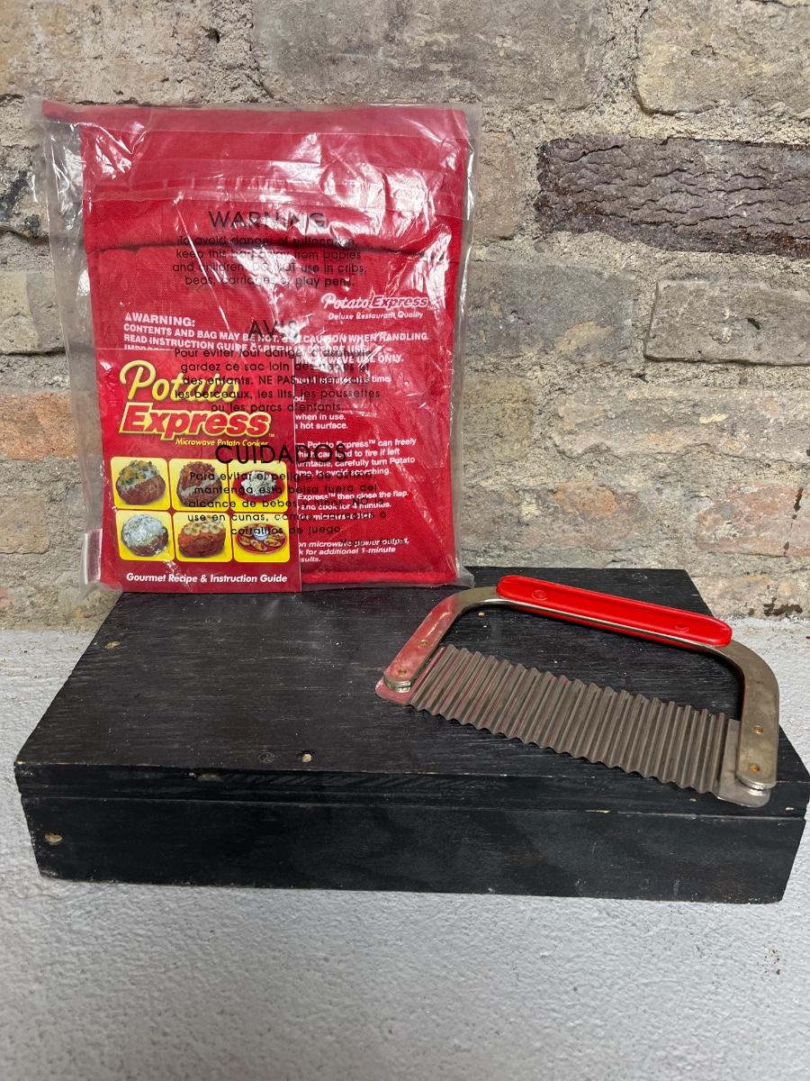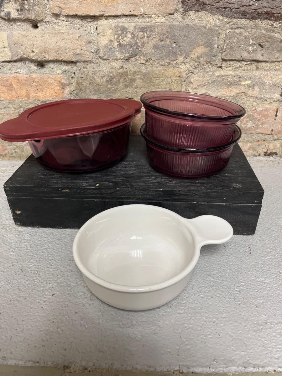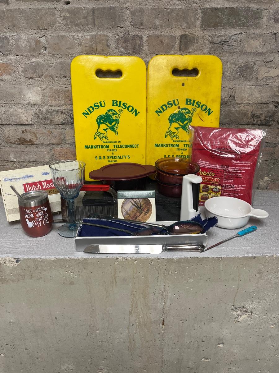 Bison kneeling pads, cranberry Pyrex pieces, one with lid, random handled soup dish(?), microwave potato bag & vintage veggie slicer, barware items, sterling knife and salad serving pieces, Pampered Chef S&P, and a turquoise letter opener with a chip