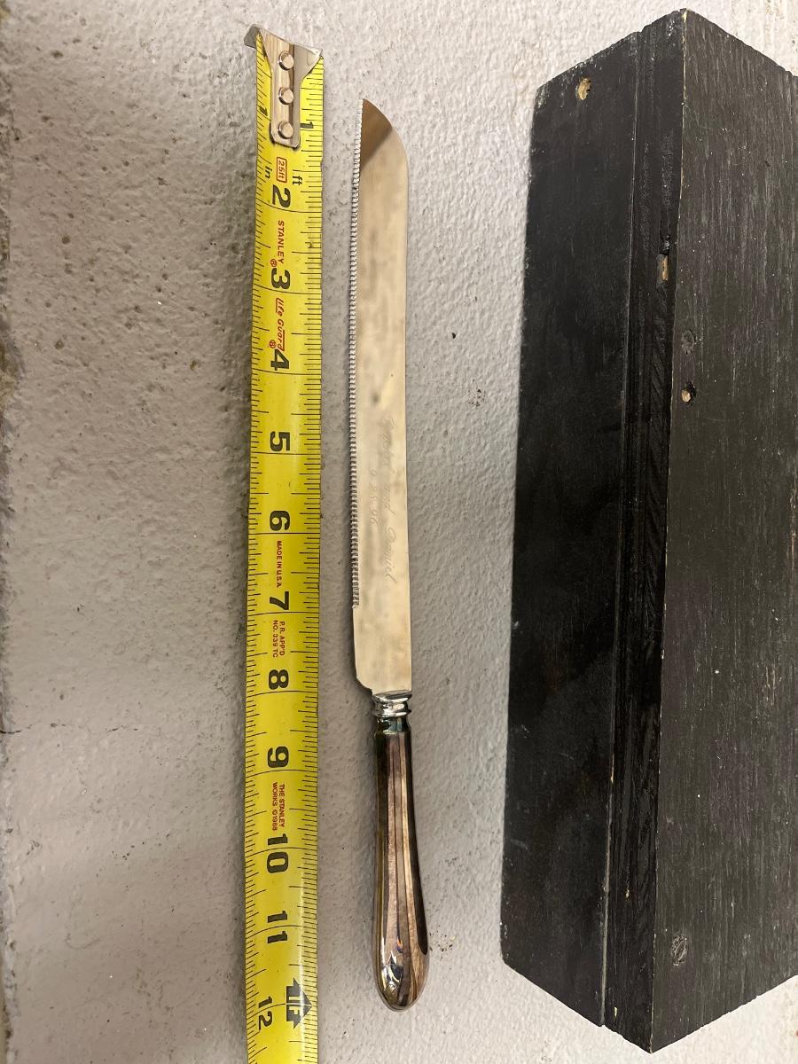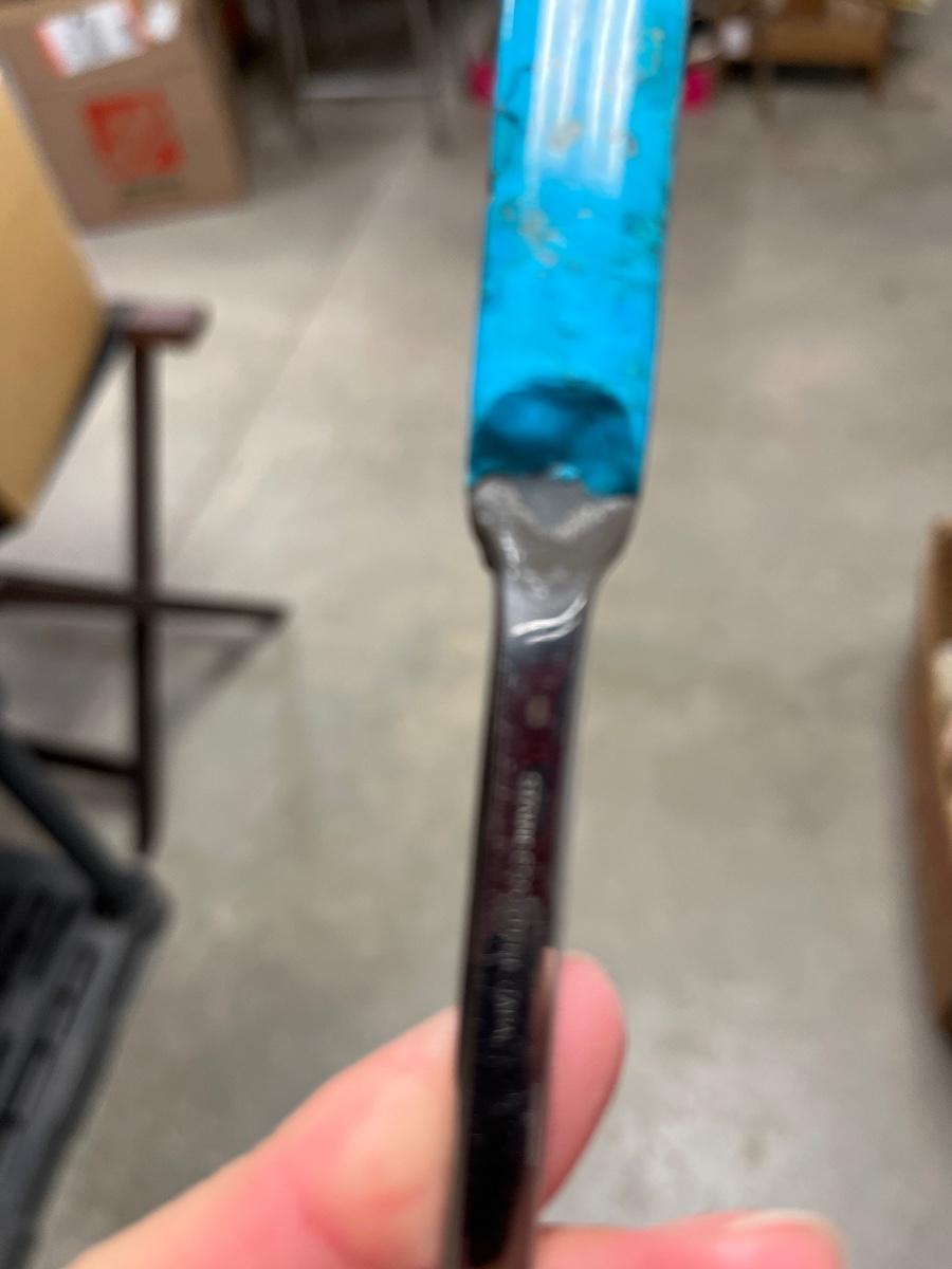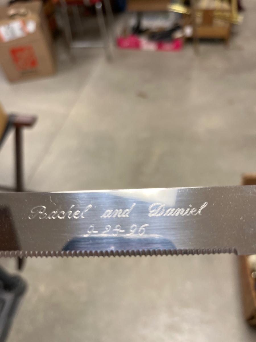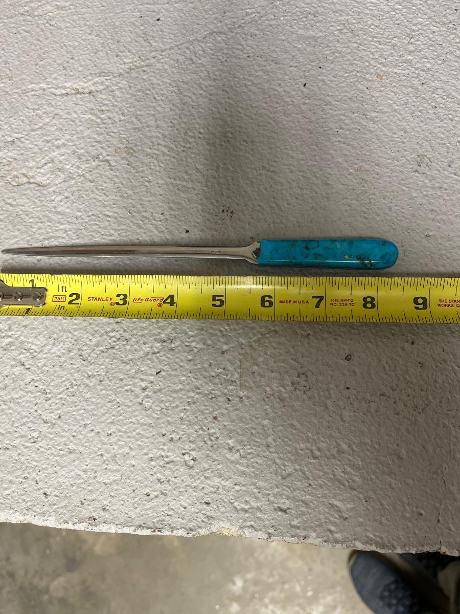 Bison kneeling pads, cranberry Pyrex pieces, one with lid, random handled soup dish(?), microwave potato bag & vintage veggie slicer, barware items, sterling knife and salad serving pieces, Pampered Chef S&P, and a turquoise letter opener with a chip