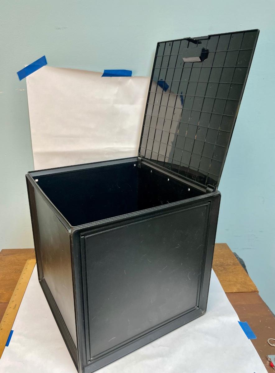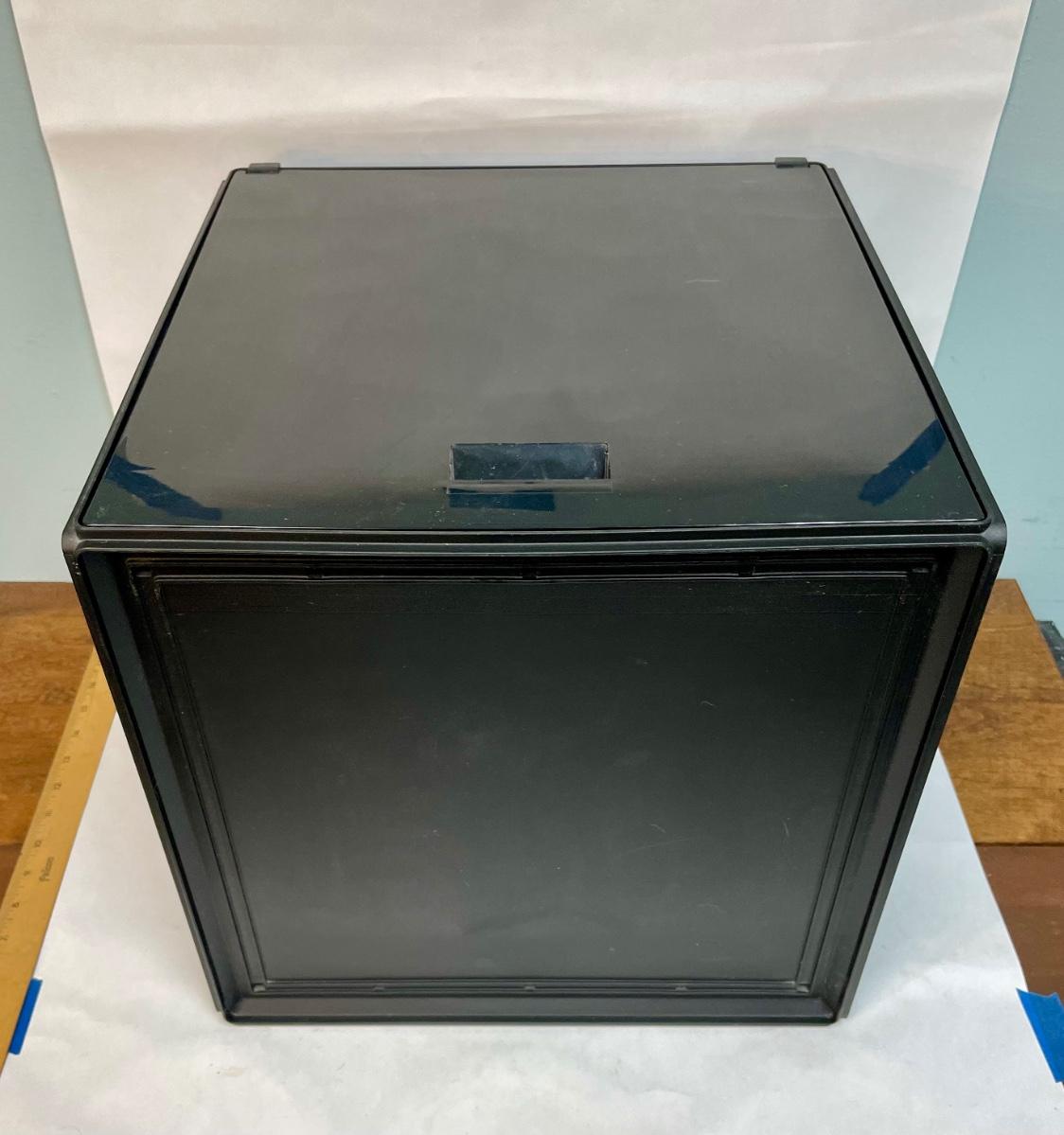 Originally sold through Target, now discontinued. Hard plastic cube with swing-open door on one side. Great size for storing 33RPM vinyl albums.