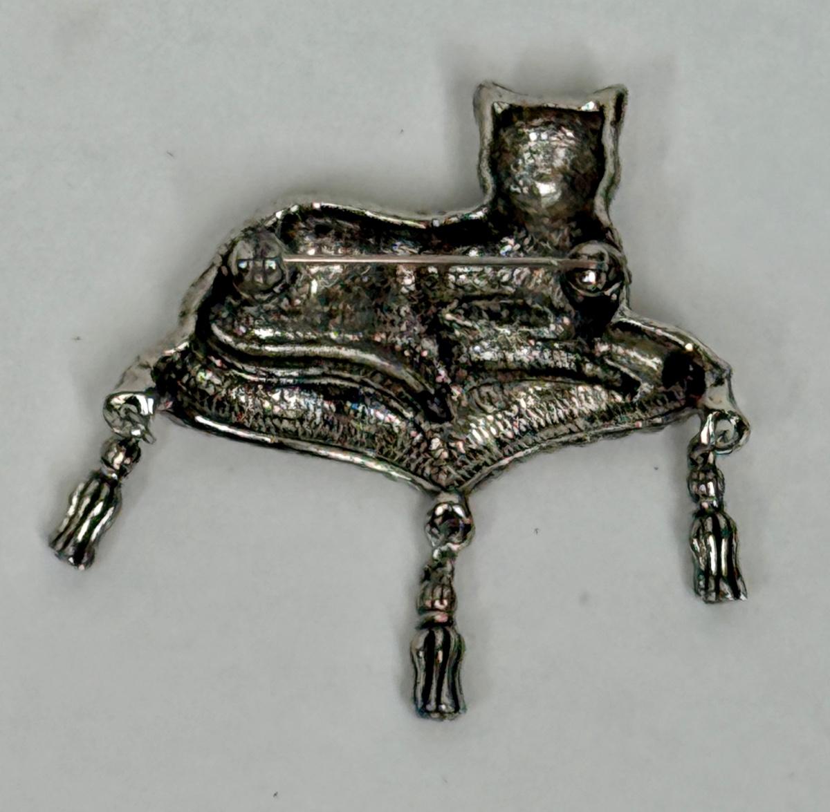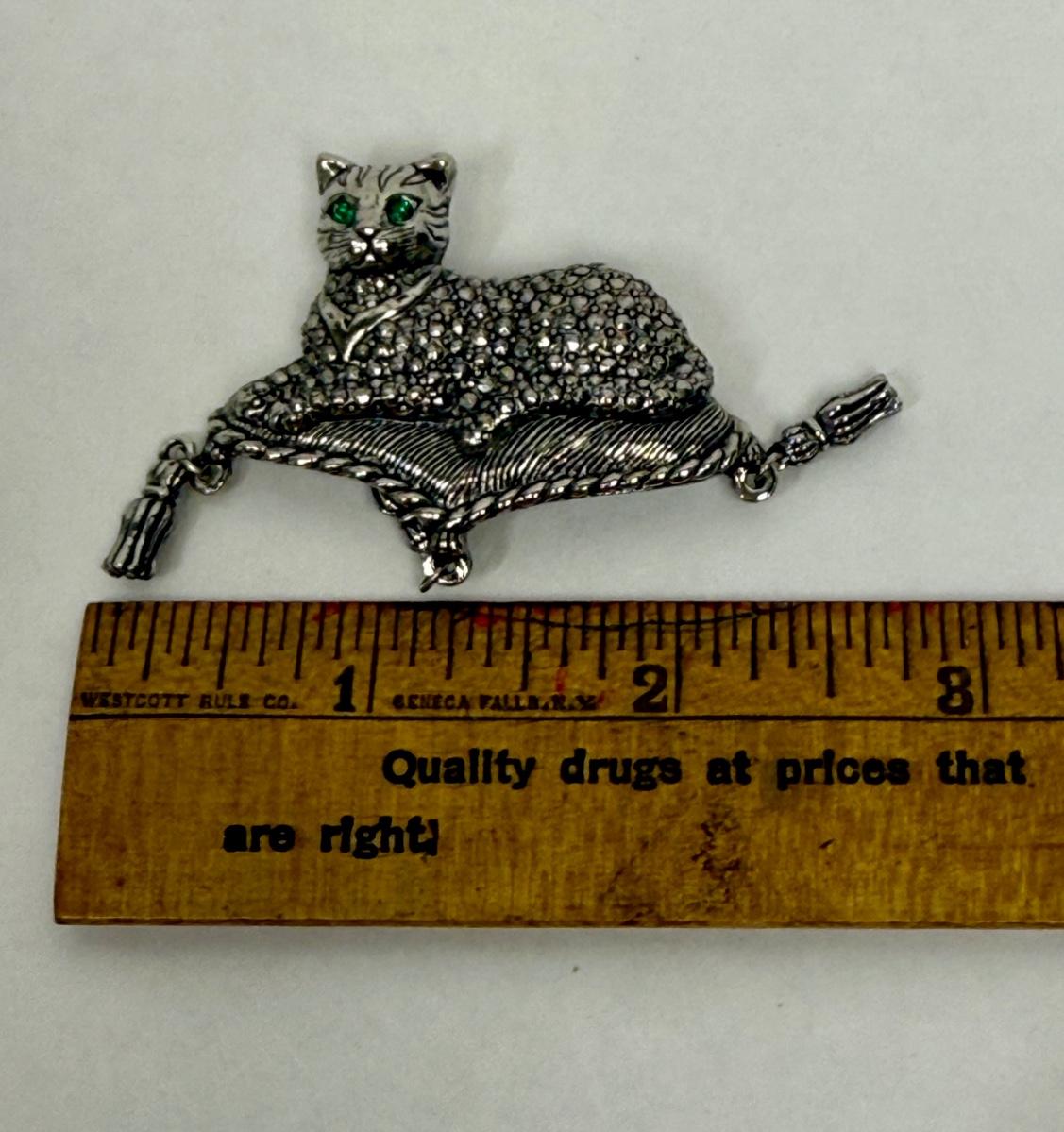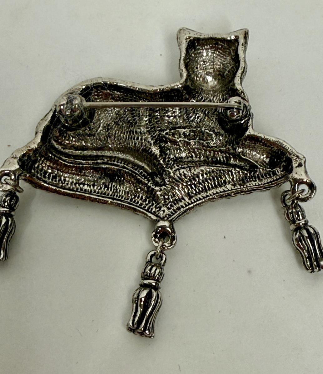 Vintage Avon Cat on Tassel Pillow Green Rhinestone Eyes Pin Brooch
