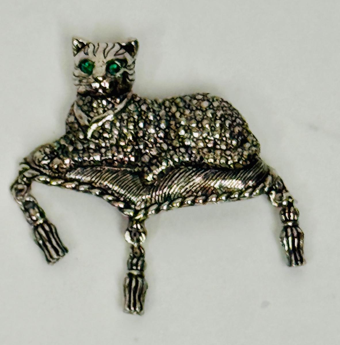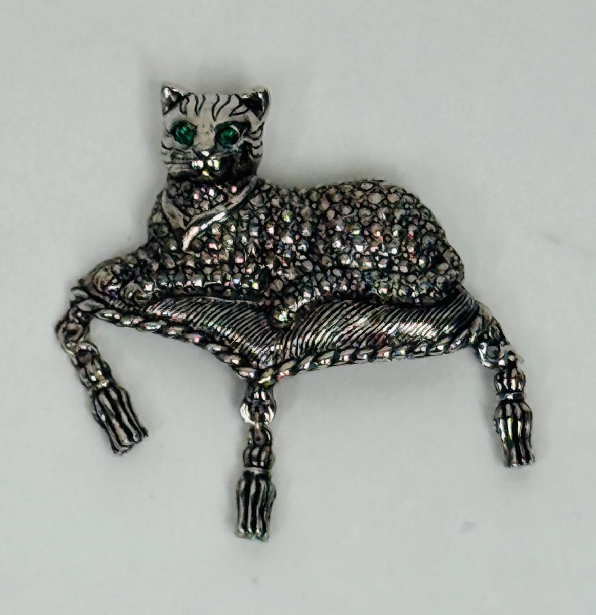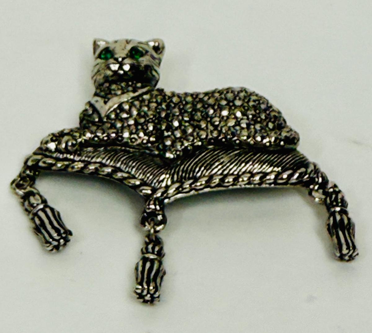 Vintage Avon Cat on Tassel Pillow Green Rhinestone Eyes Pin Brooch