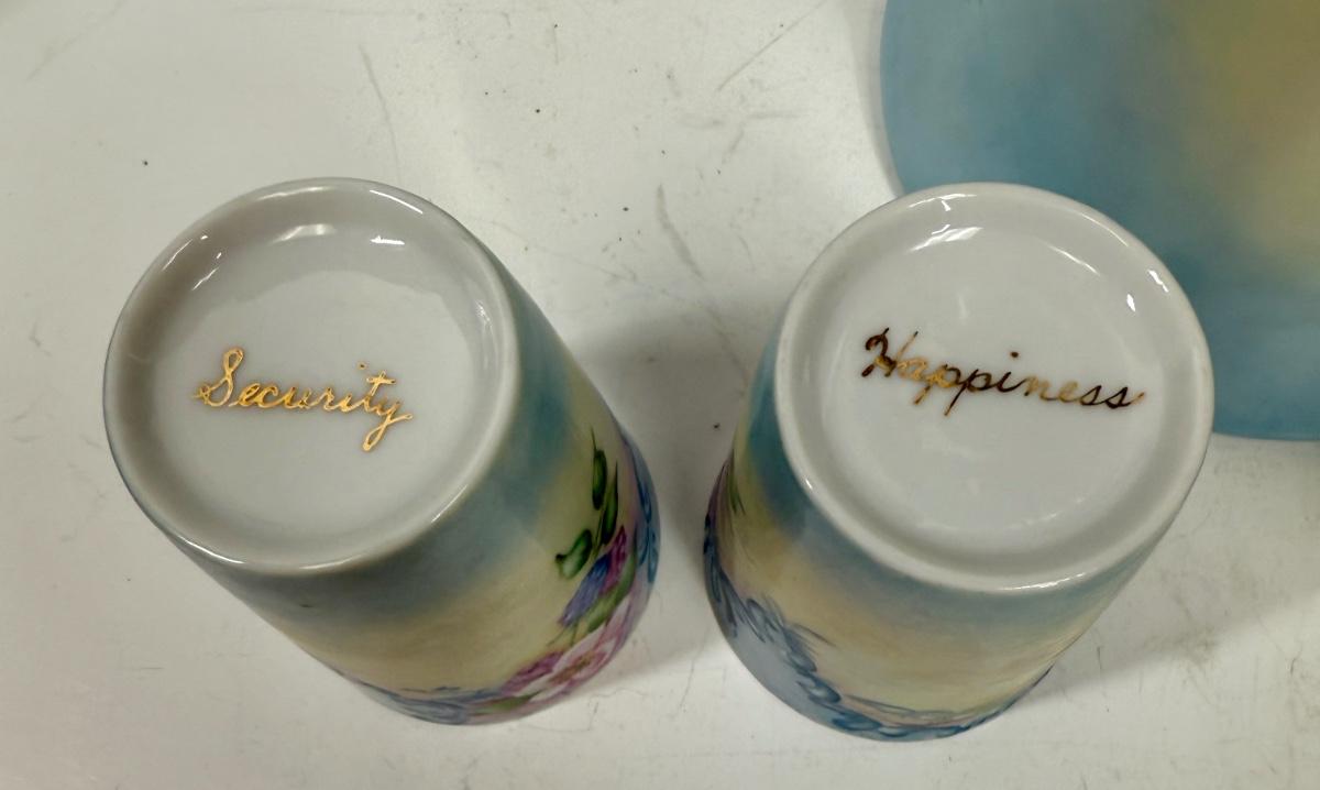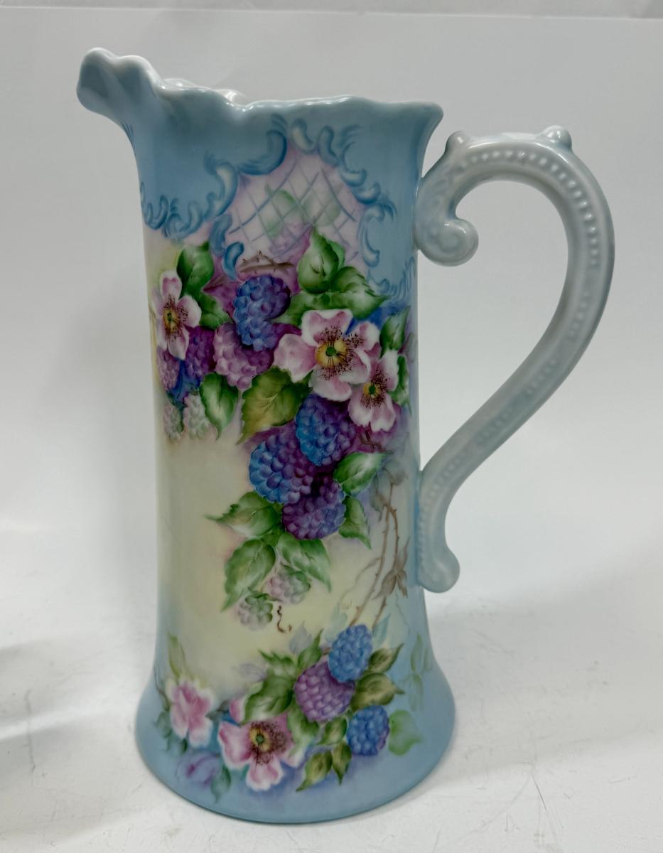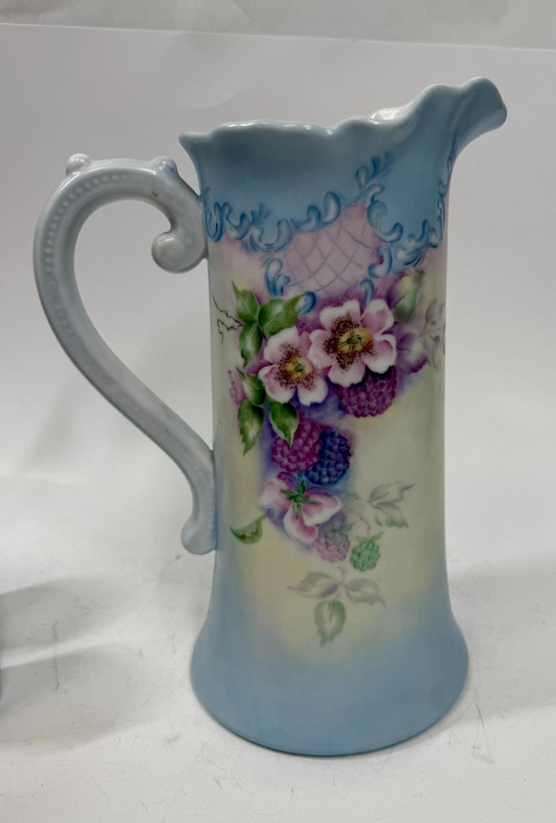 Pale blue and white ceramic pitcher and cups. Hand painted in 1968 by local artist Dorothy Tillotson of Tustin in 1968. All in very good condition, no chips or cracks.