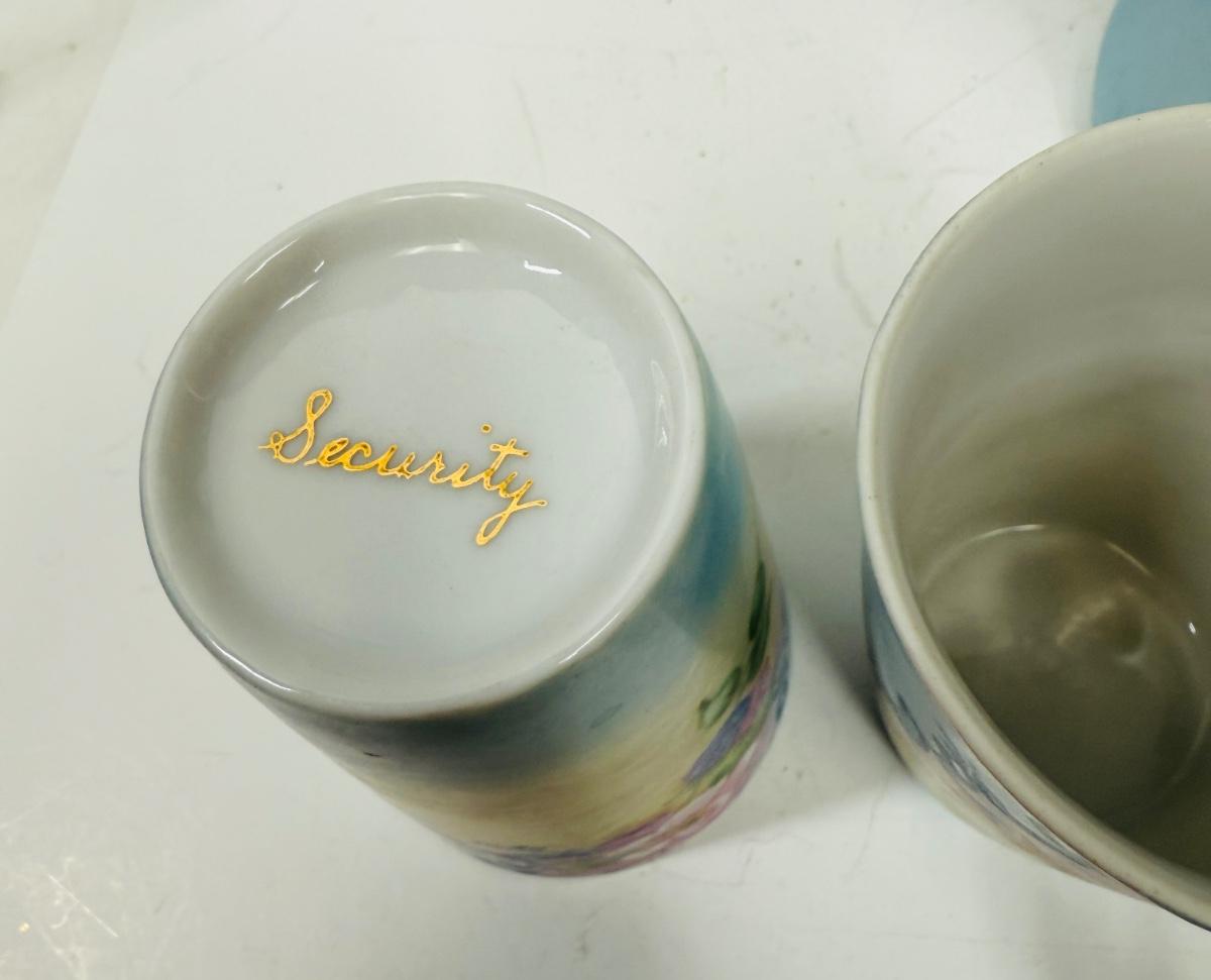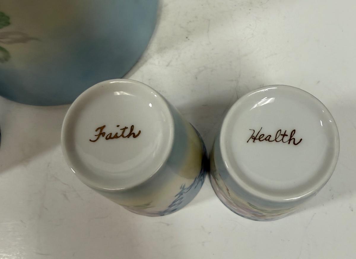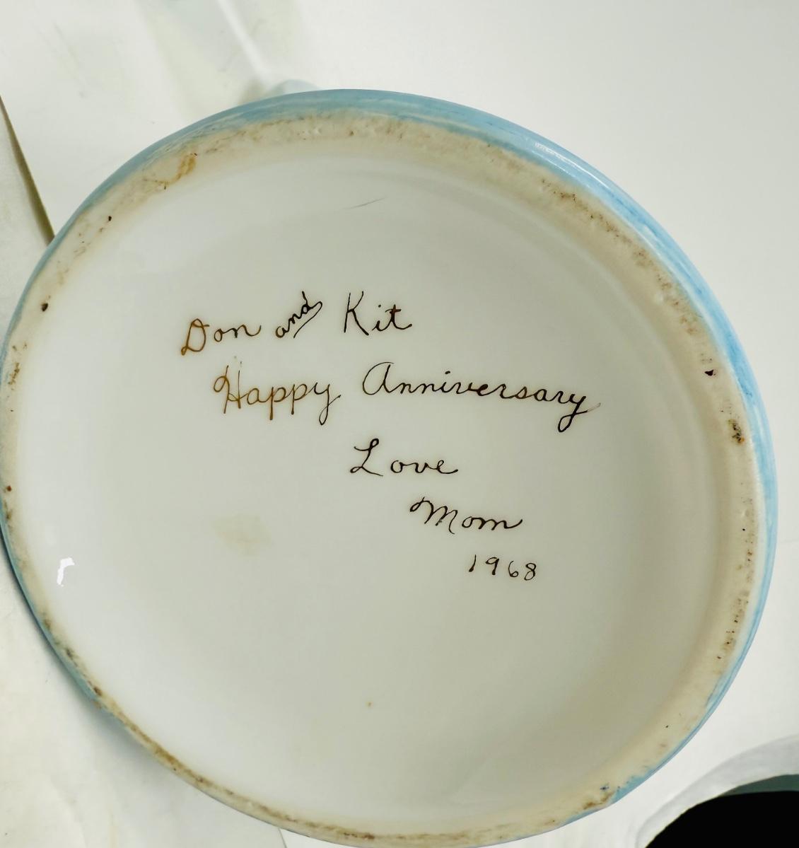 Pale blue and white ceramic pitcher and cups. Hand painted in 1968 by local artist Dorothy Tillotson of Tustin in 1968. All in very good condition, no chips or cracks.