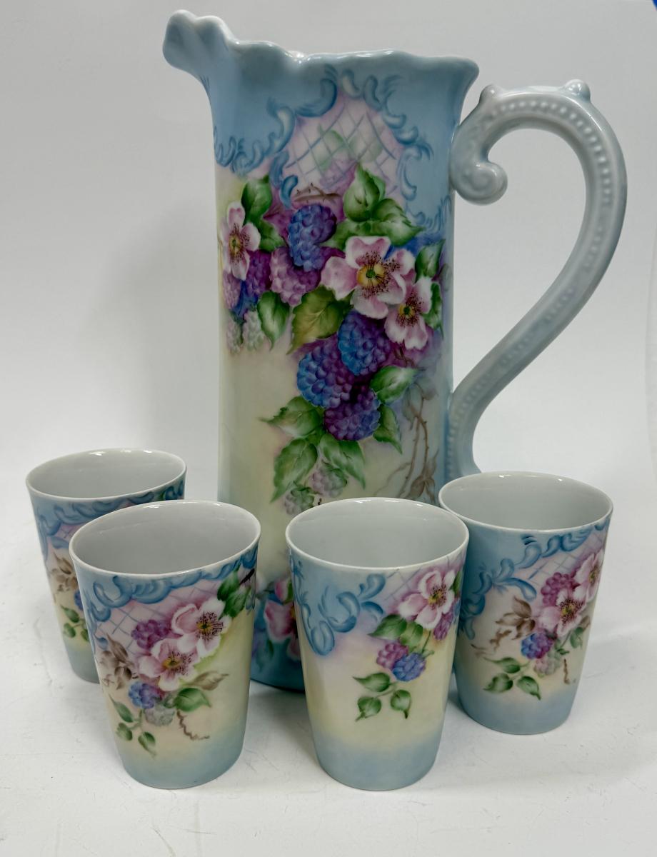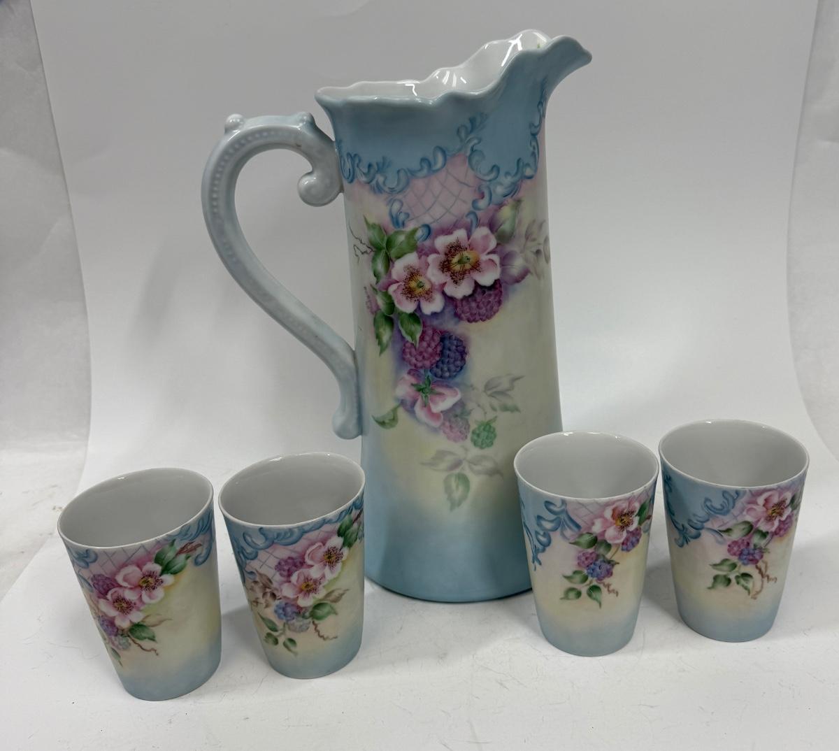 Vintage 12” Hand Painted Porcelain Lemonade Set Pitcher Vase Floral Pattern with 4 Tumbler Cups