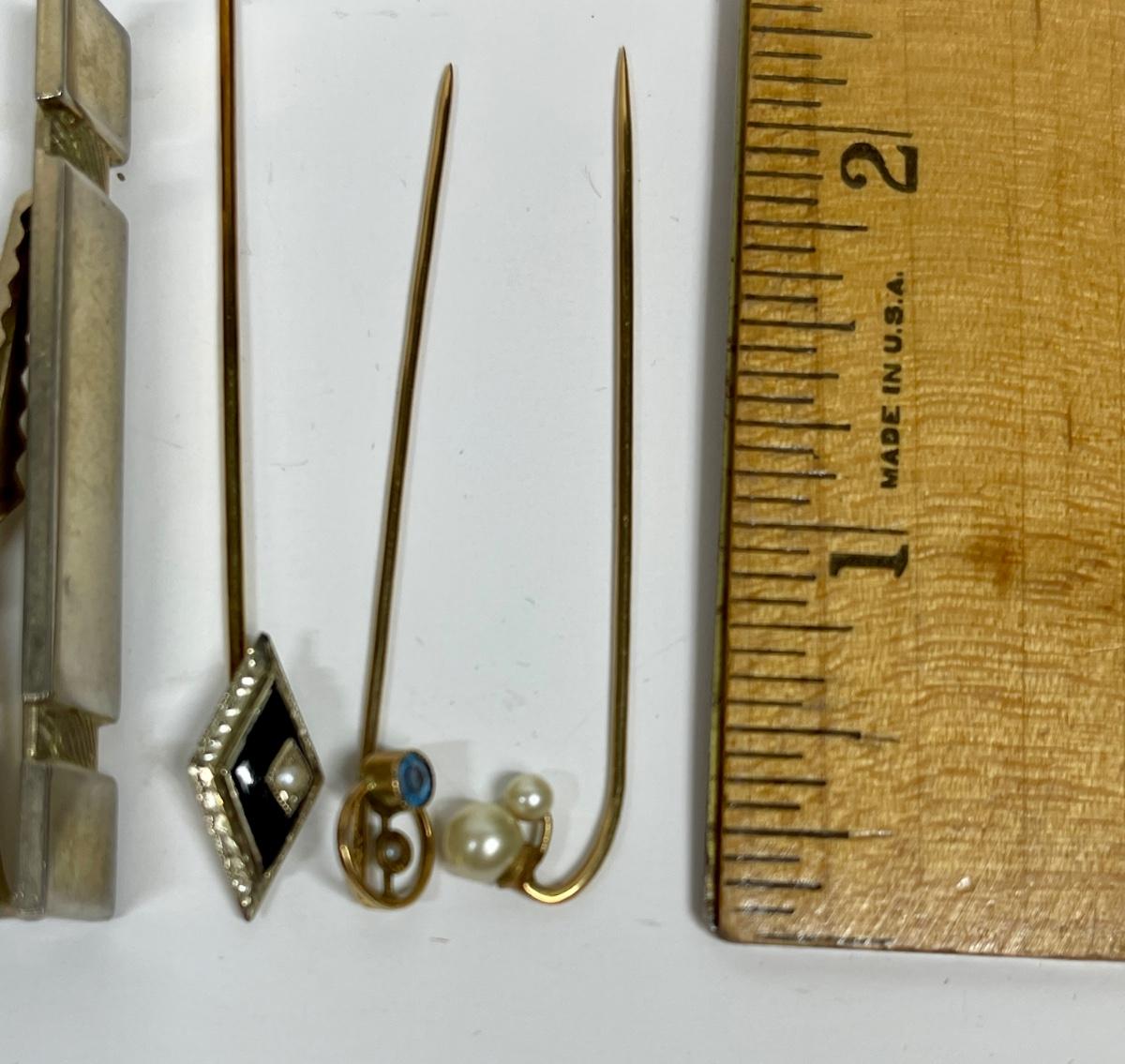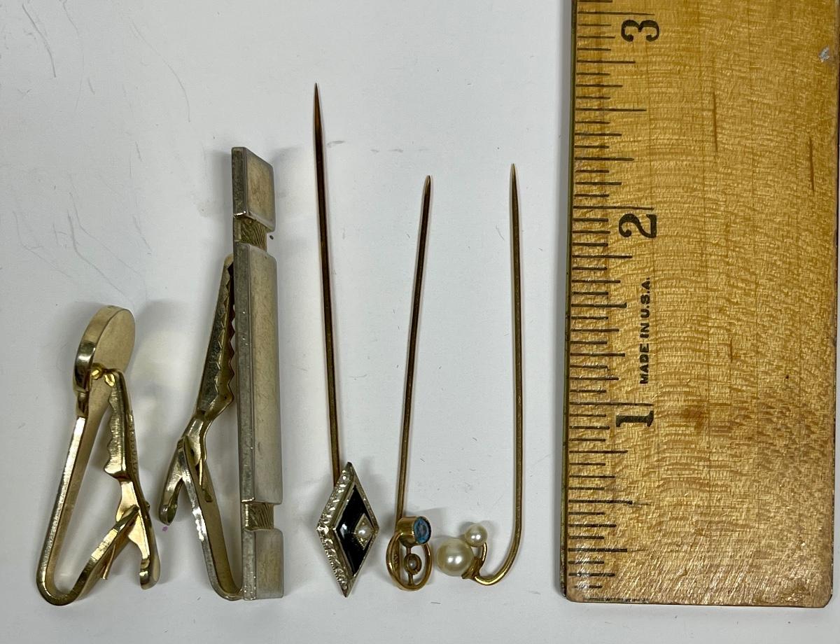 3 stick pins, 2 tie clips. See photos for styles, sizes and other details. Good vintage condition.