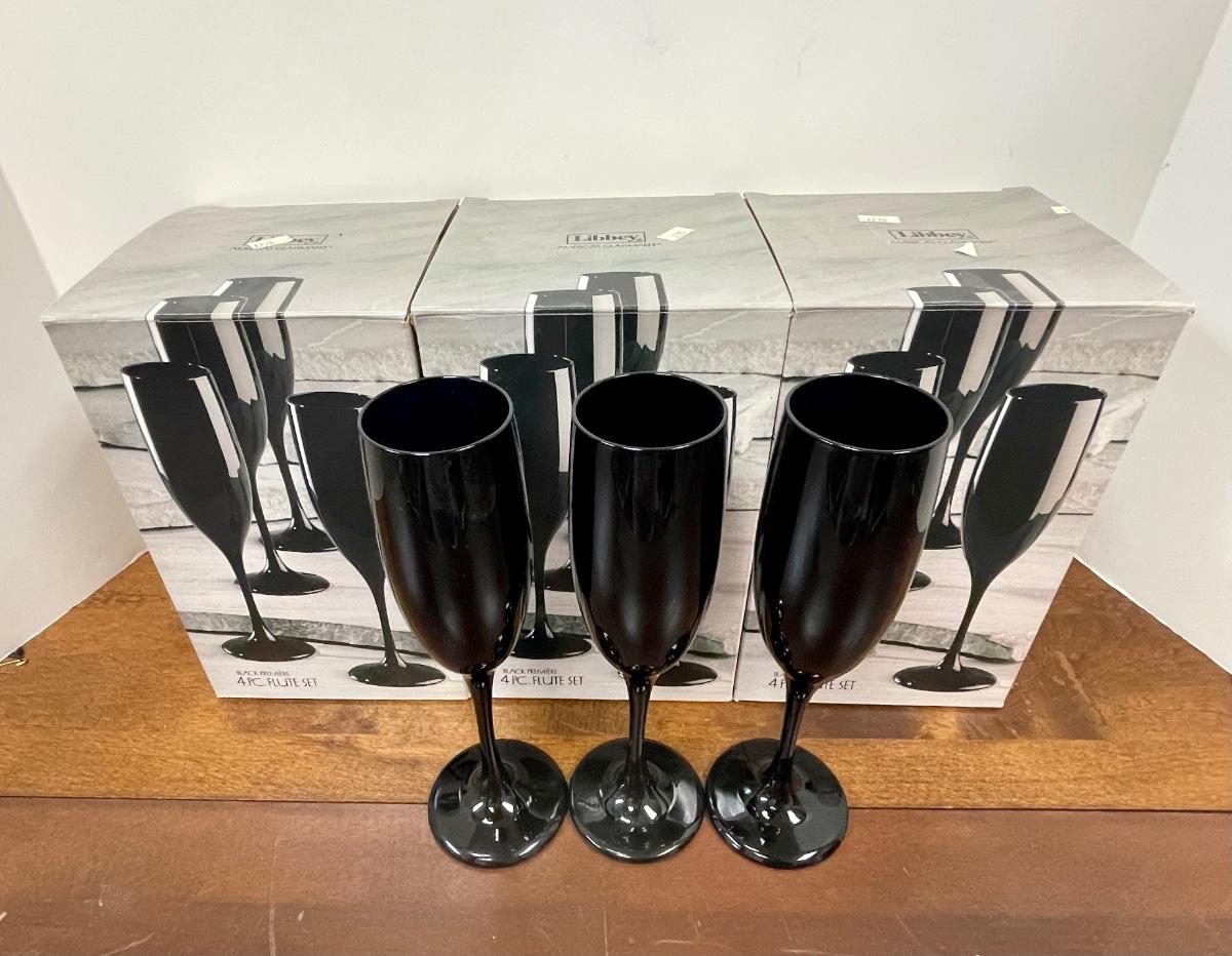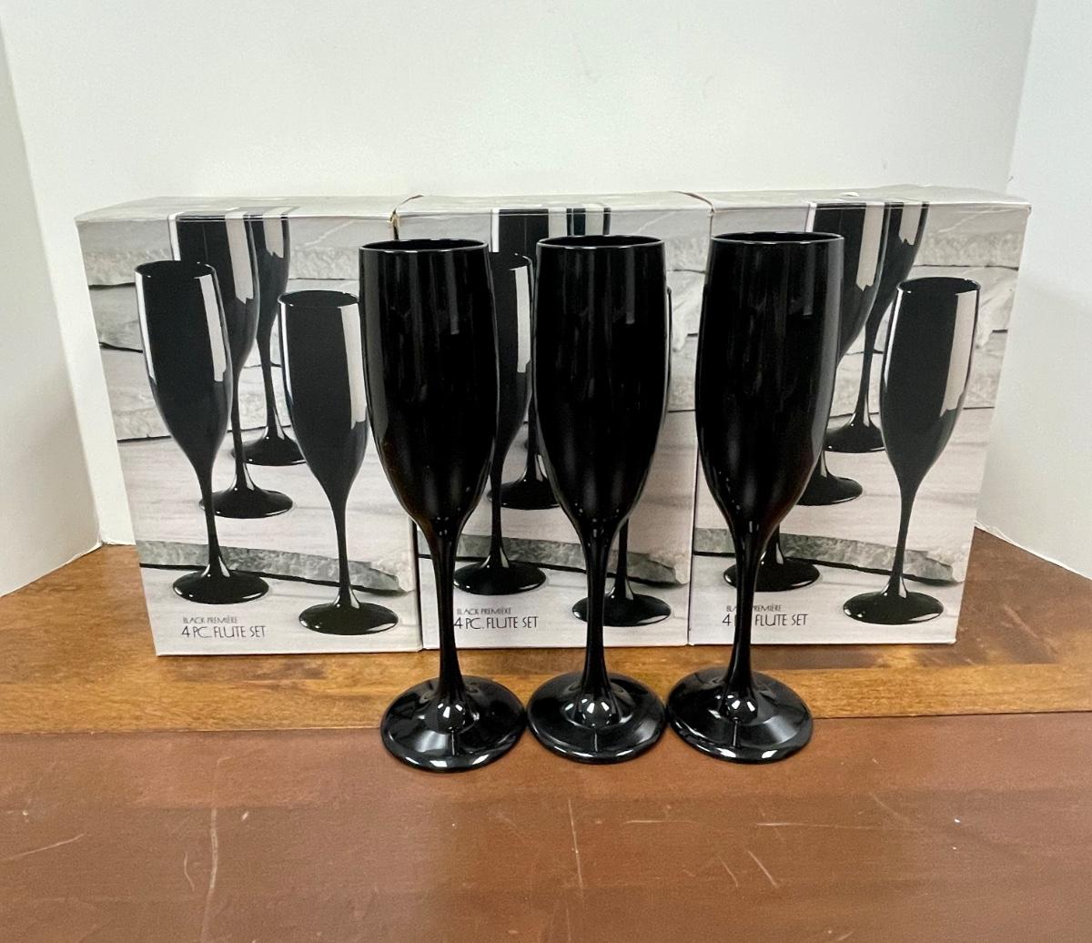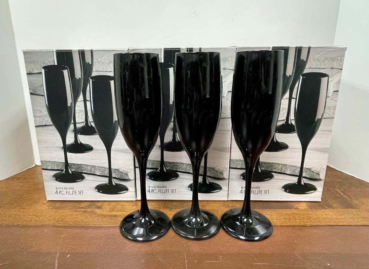 Retro Black Champagne Drink Glasses Stemware Flutes Set of 15. Three boxed sets of four and three loose glasses. In good condition.