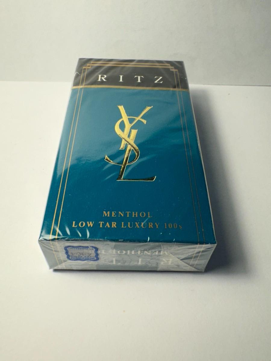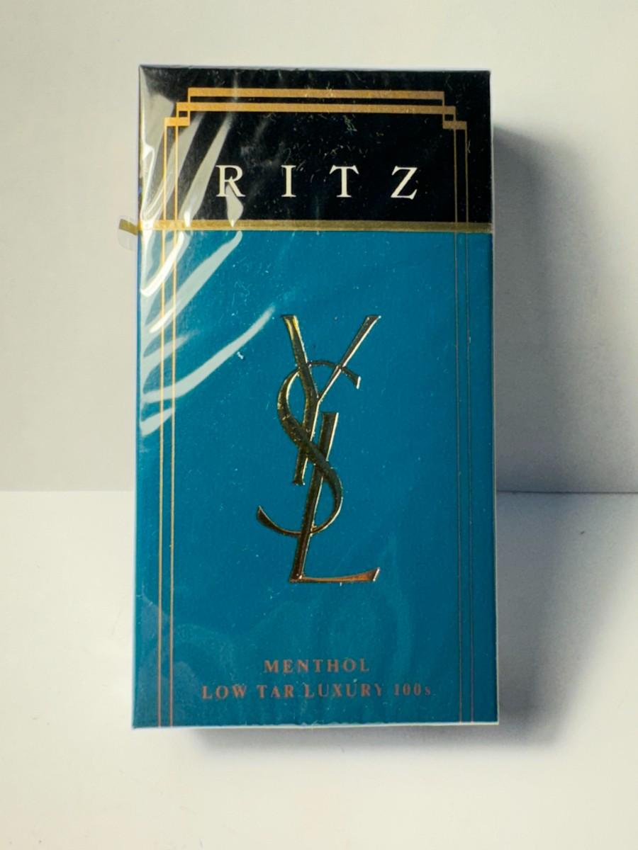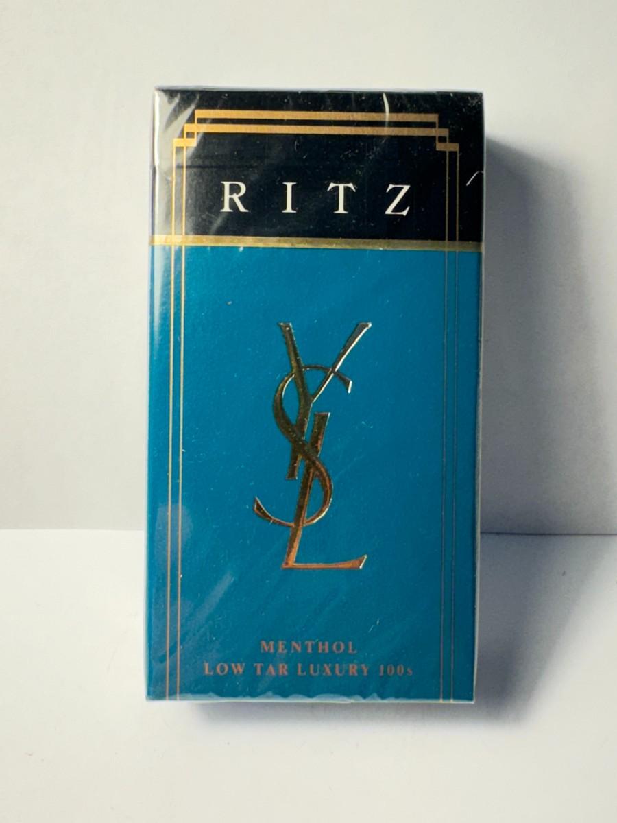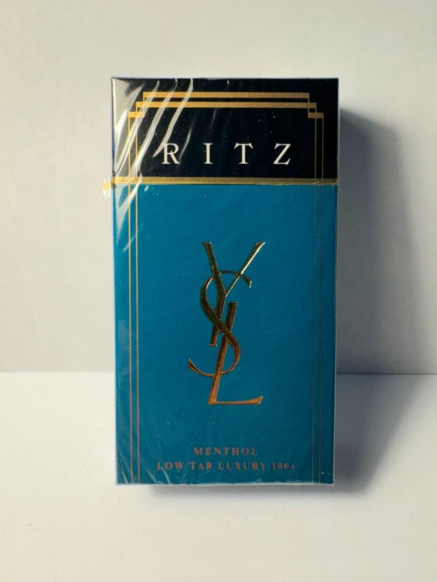 Vintage pack of Ritz Menthol cigarettes, a brand that was introduced in the mid-1980s by R.J. Reynolds Tobacco Company in collaboration with the renowned fashion house Yves Saint Laurent (YSL).