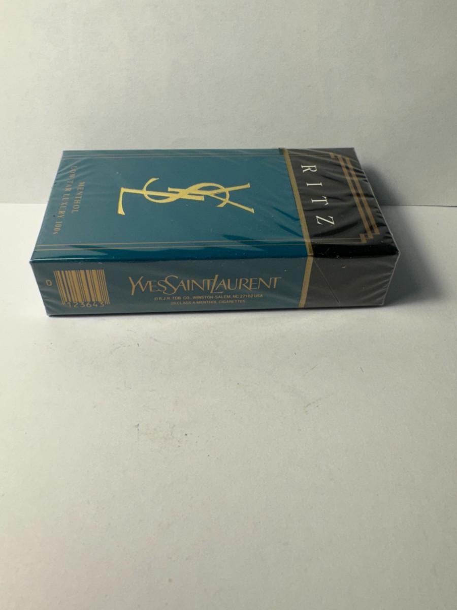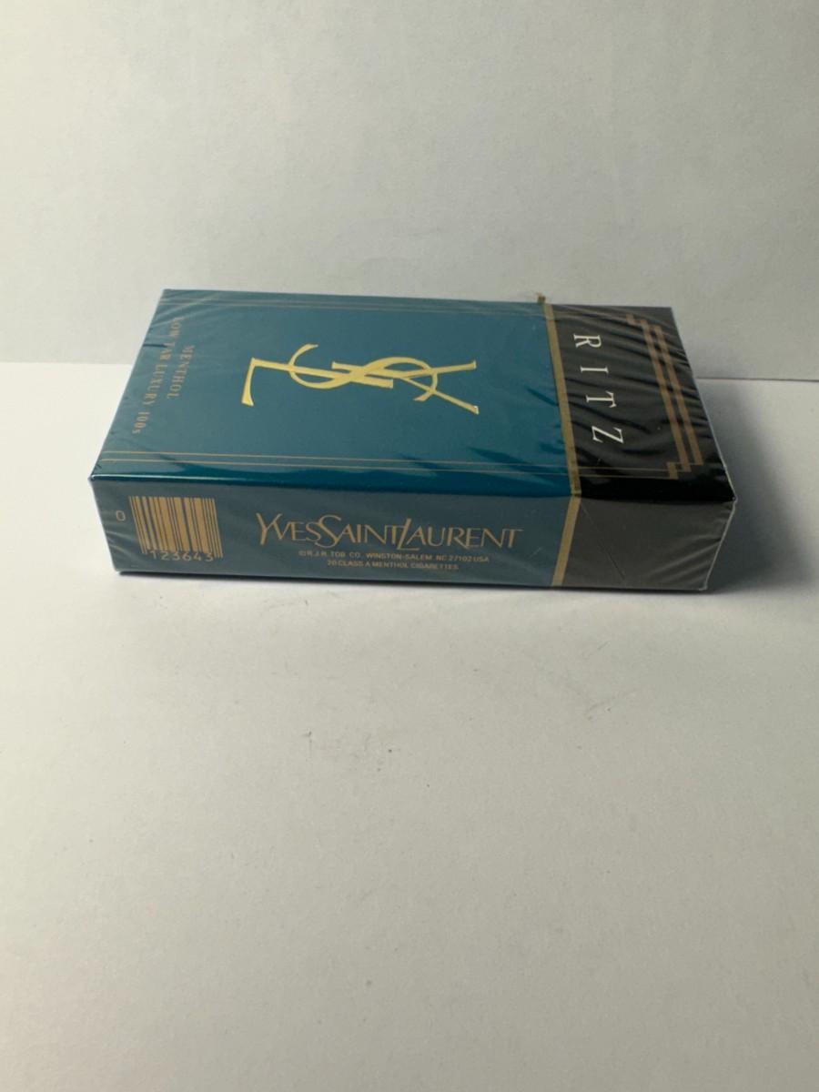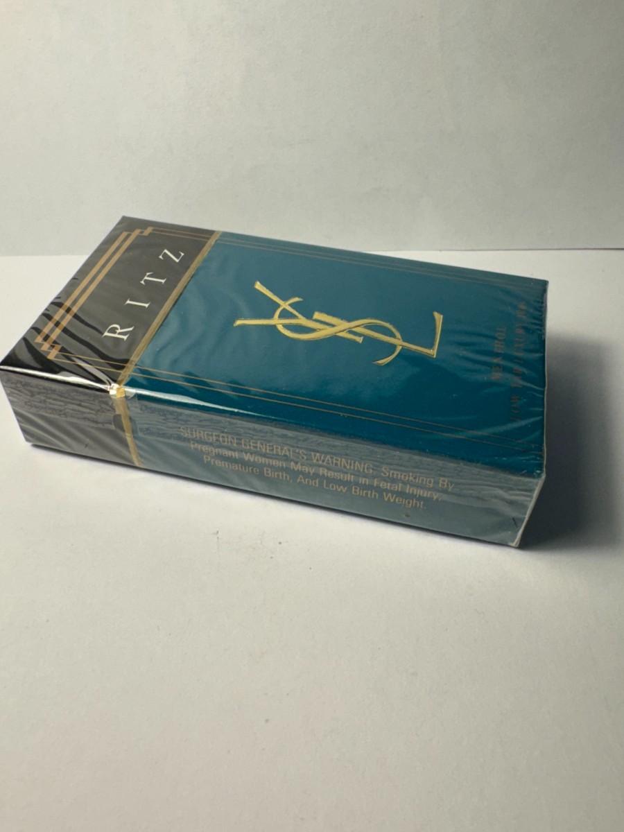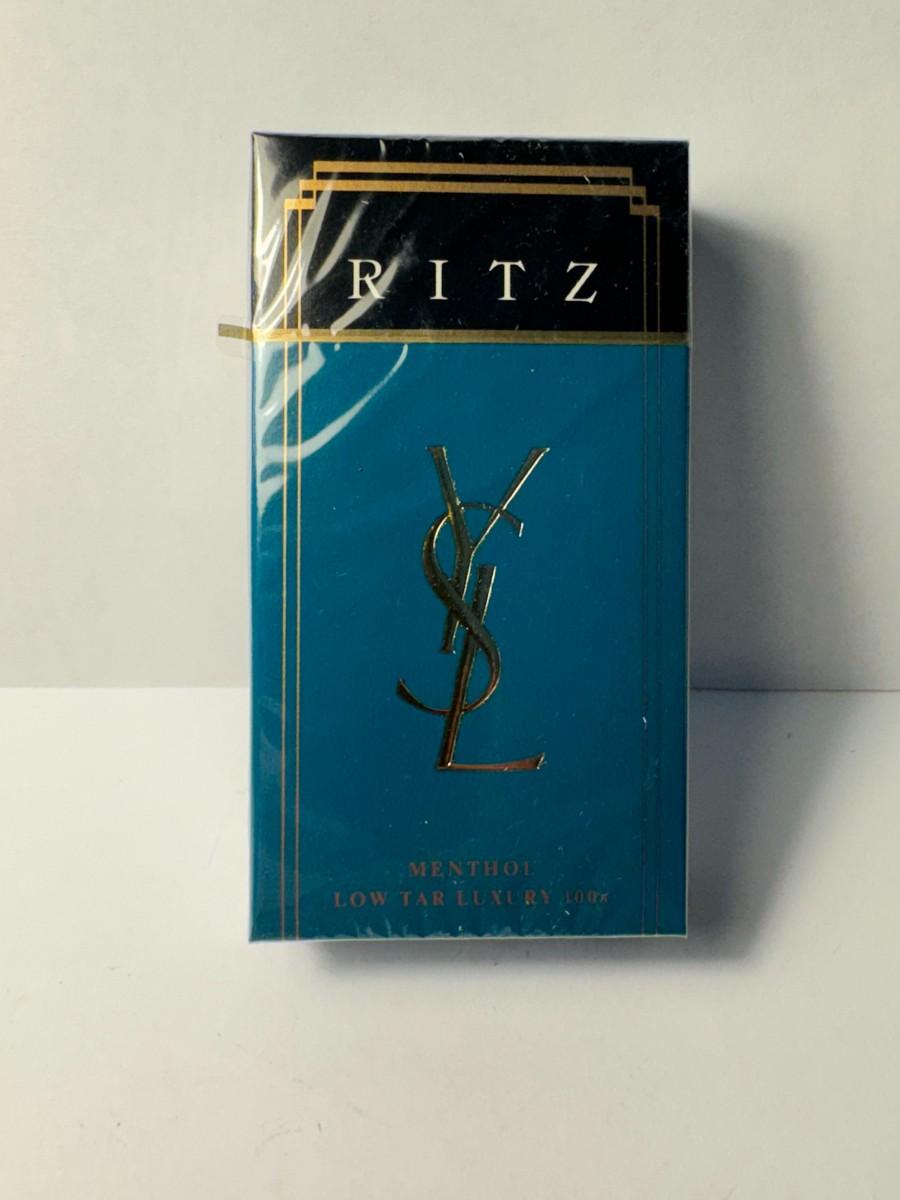 Vintage pack of Ritz Menthol cigarettes, a brand that was introduced in the mid-1980s by R.J. Reynolds Tobacco Company in collaboration with the renowned fashion house Yves Saint Laurent (YSL).