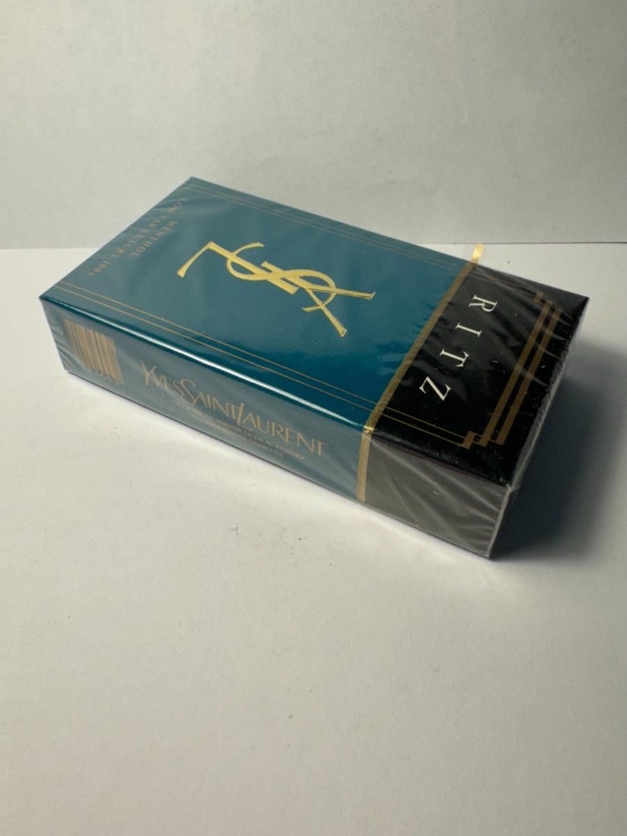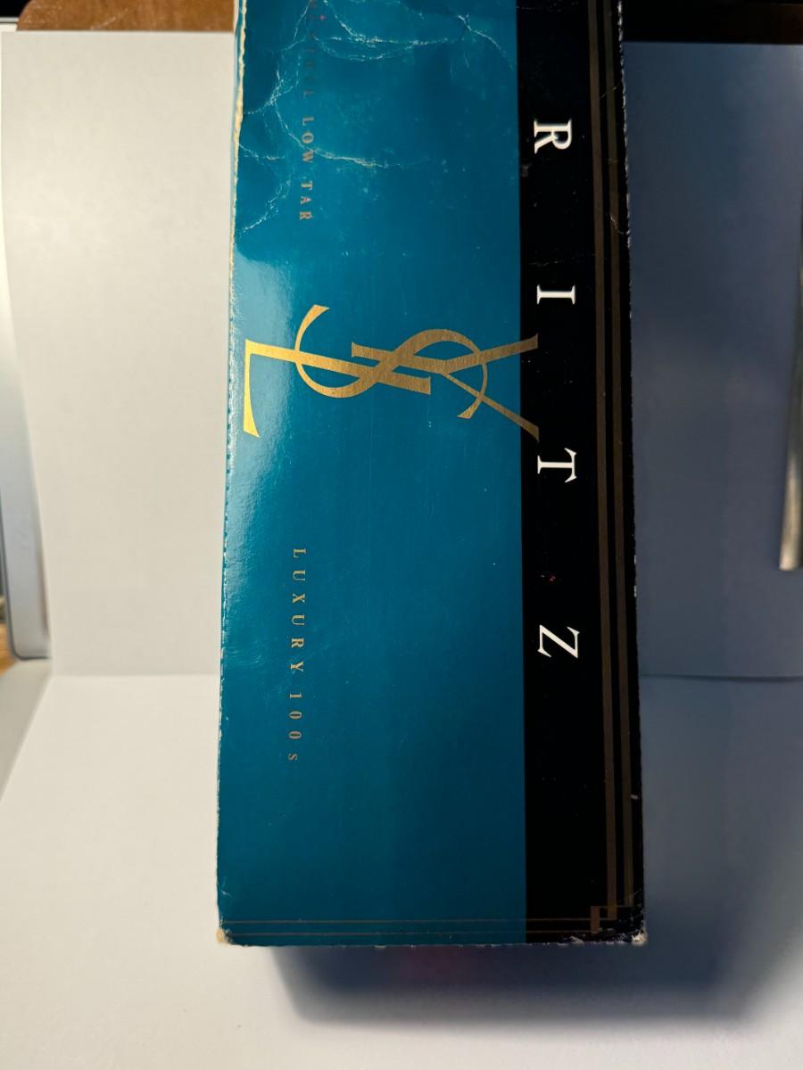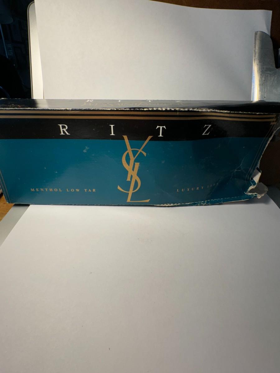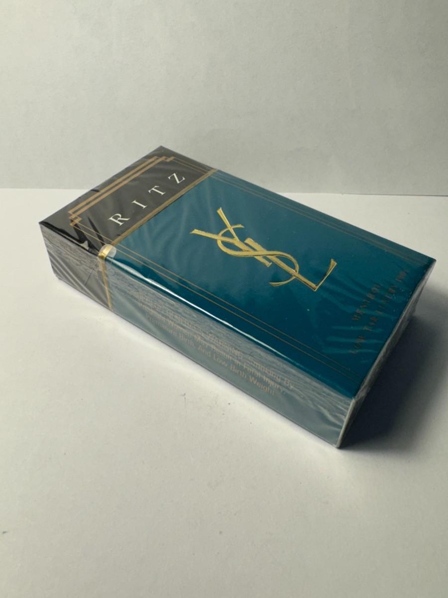Vintage pack of Ritz Menthol cigarettes, a brand that was introduced in the mid-1980s by R.J. Reynolds Tobacco Company in collaboration with the renowned fashion house Yves Saint Laurent (YSL).