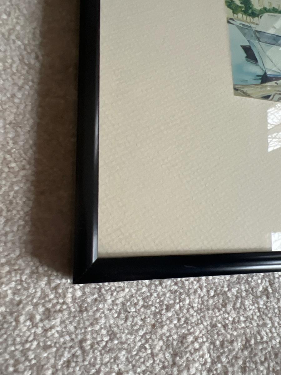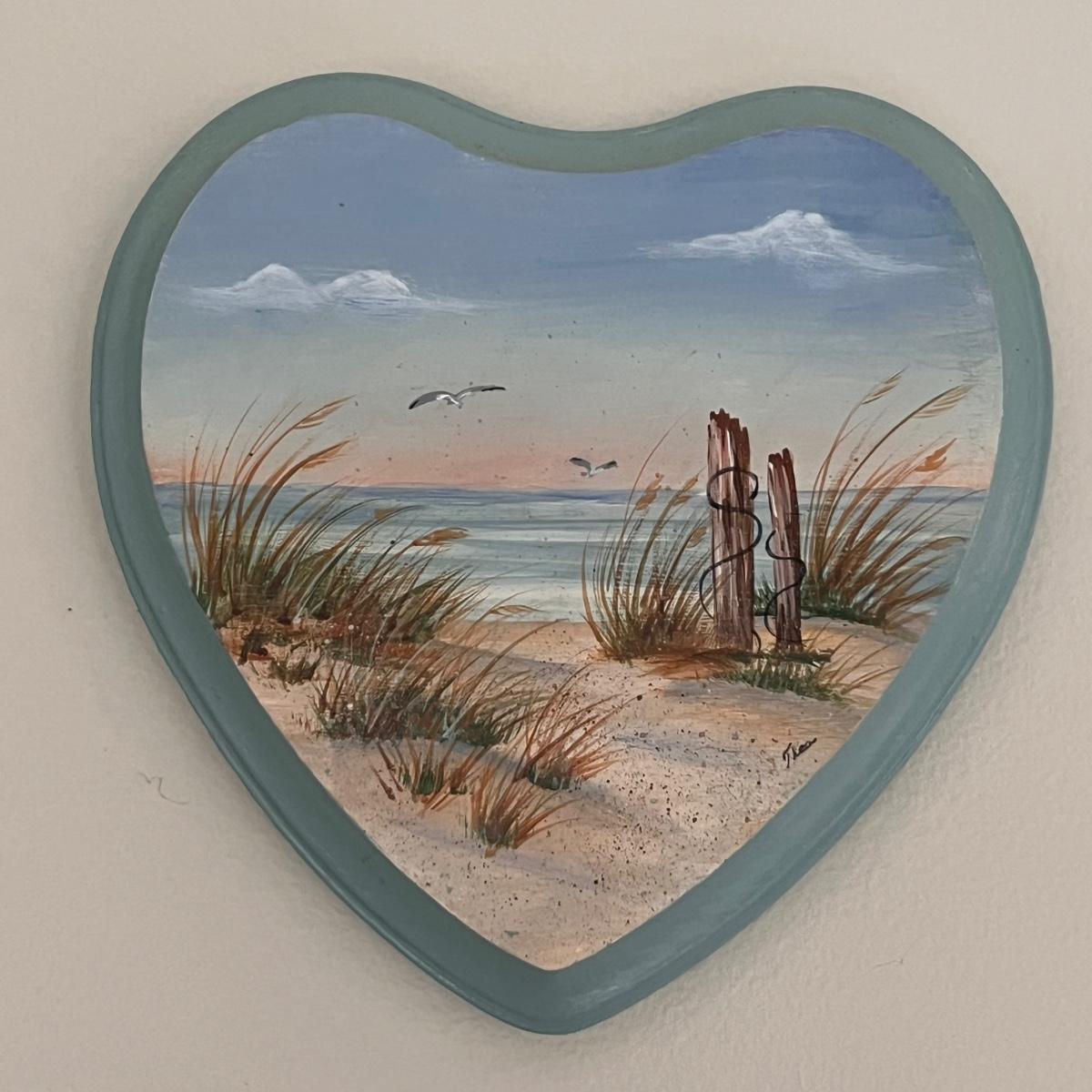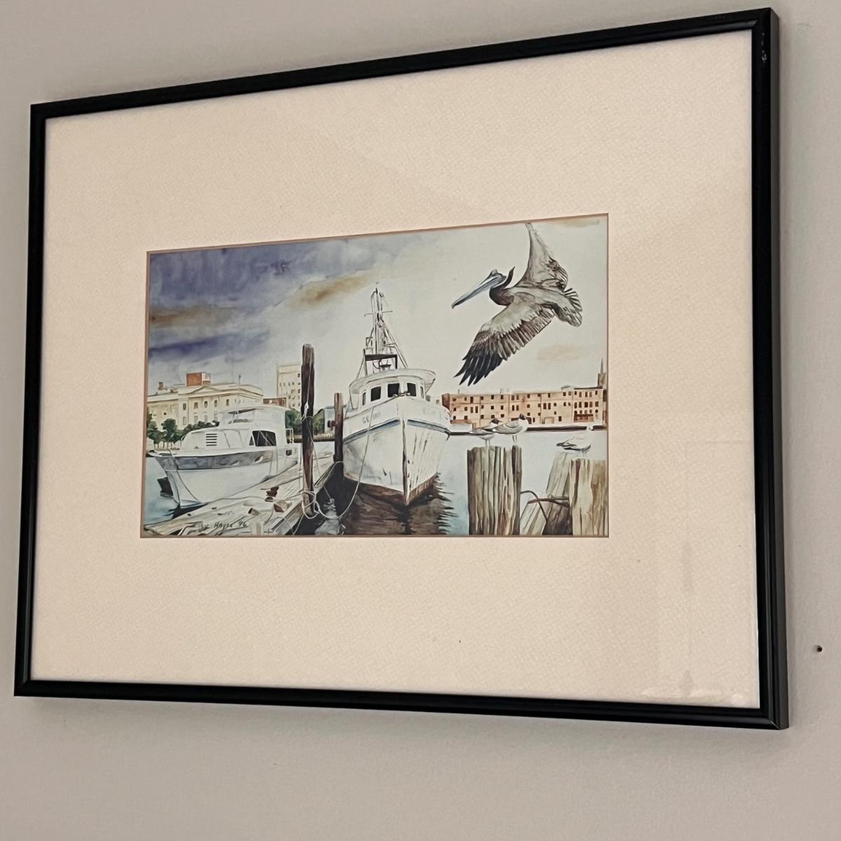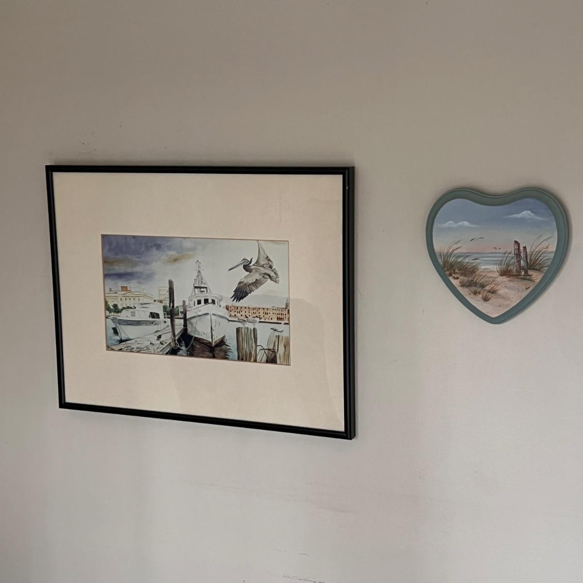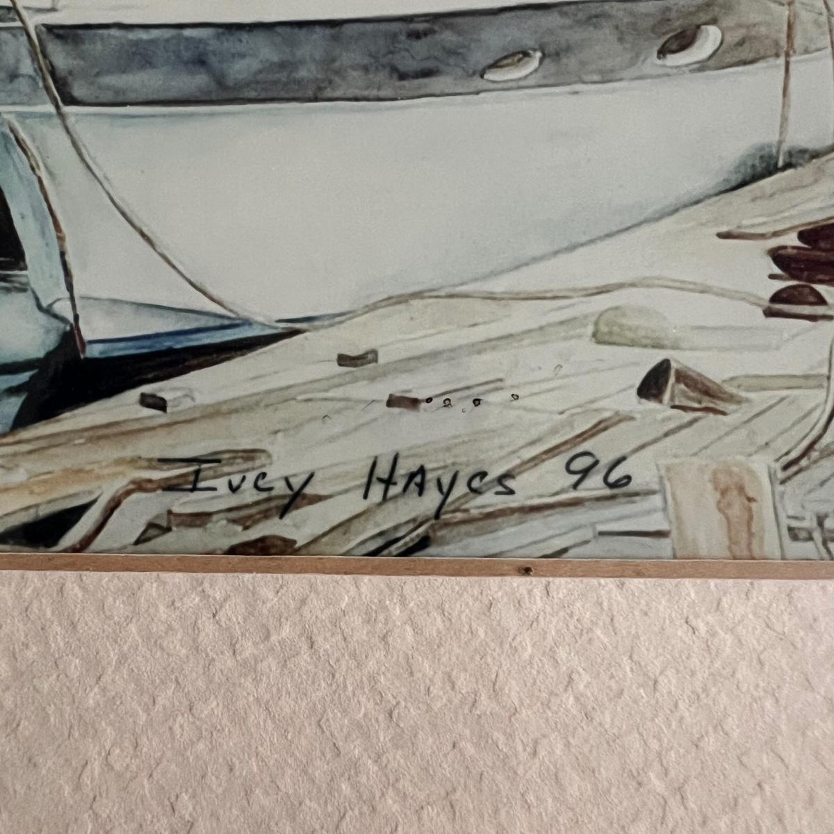 Two pieces of signed art. The Ivey Hayes watercolor painting of a pelican and boats is matted and mounted under glass in a black plastic frame. Info on the back is shown in pics. Frame measures 18.5” x 14.5”H. Also included is a heart shaped piece of wood depicting a beach scene which is signed Thea.