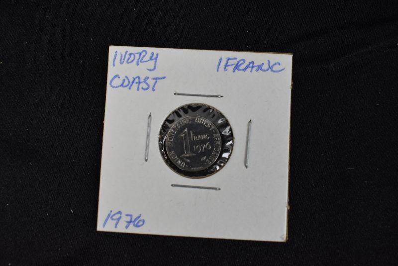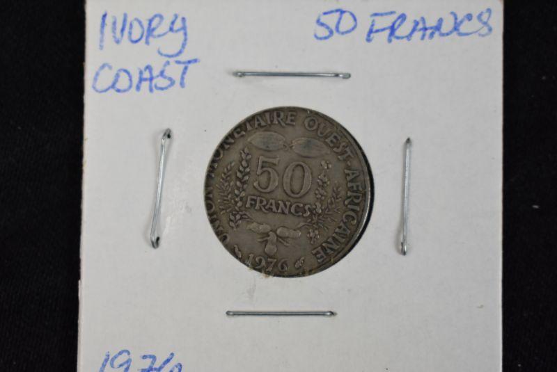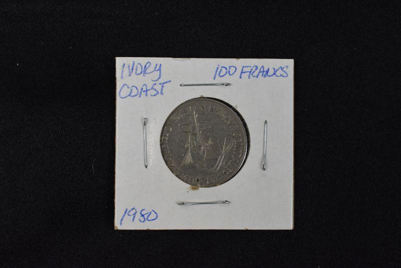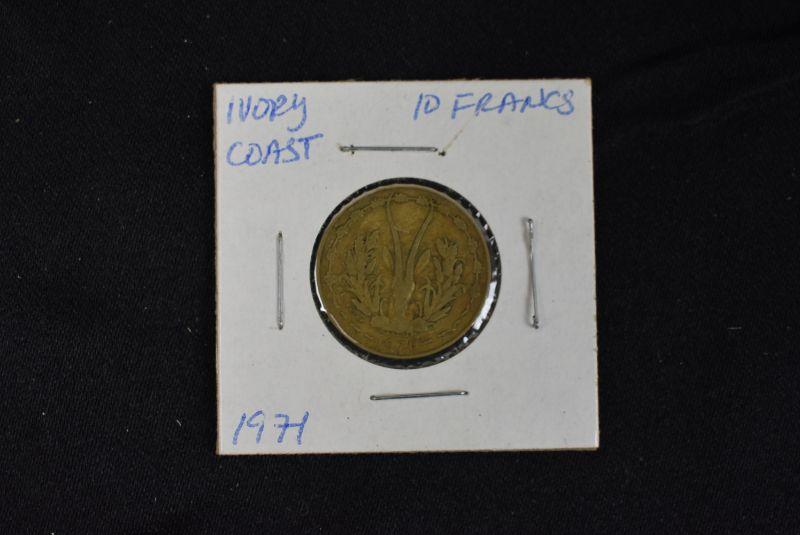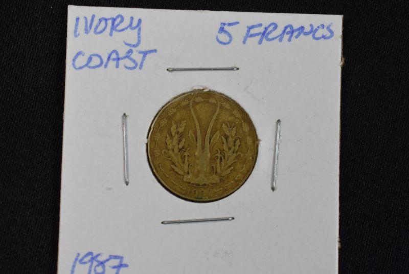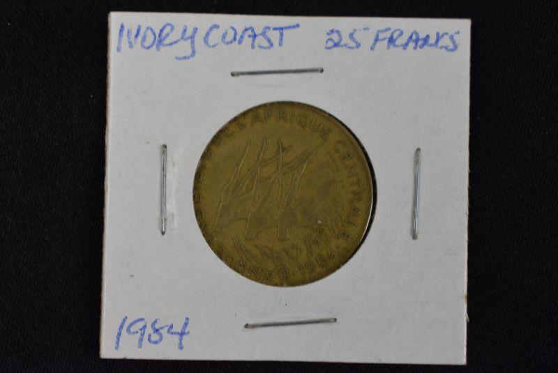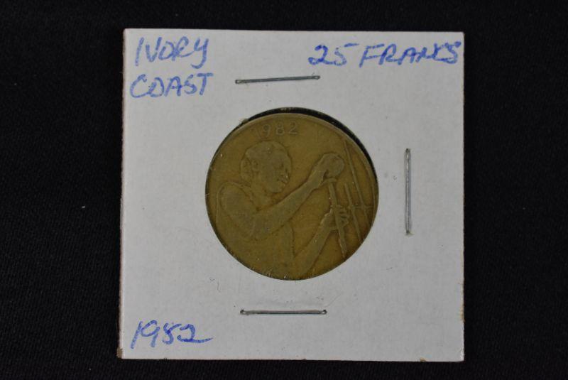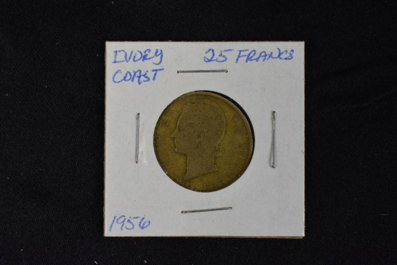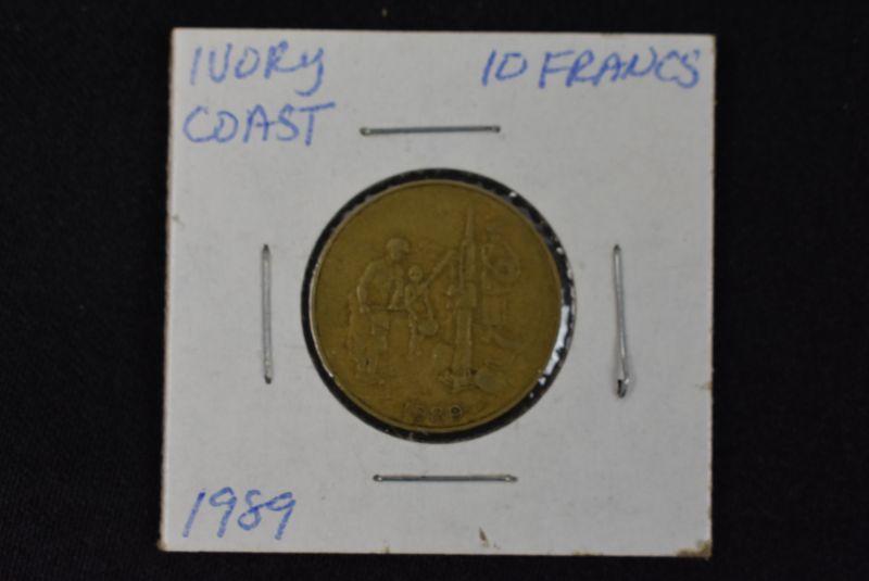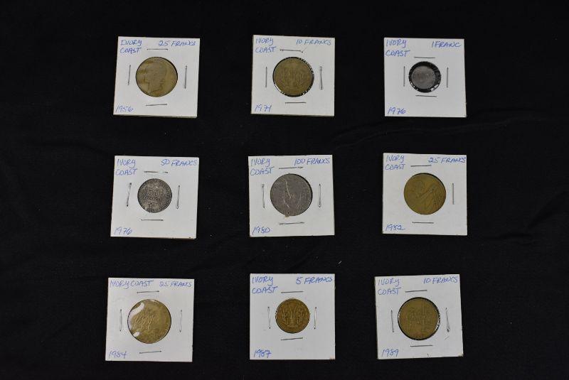 1956 Ivory Coast 25 Francs, 1971 Ivory Coast 10 Francs, 1976 Ivory Coast 1 Franc, 1976 Ivory Coast 50 Francs, 1980 Ivory Coast 100 Francs, 1982 Ivory Coast 25 Francs, 1984 Ivory Coast 25 Francs, 1987 Ivory Coast 5 Francs, and 1989 Ivory Coast 10 Francs