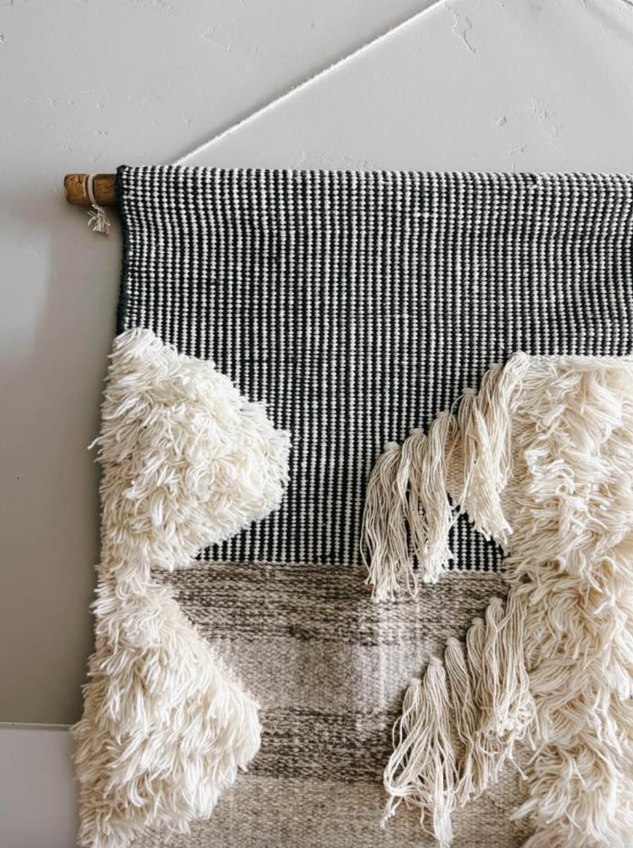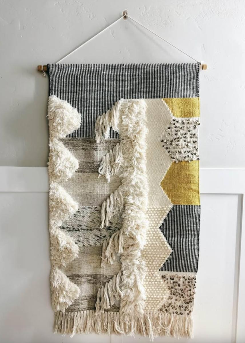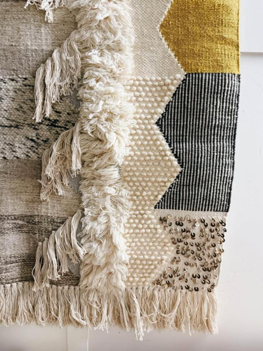 Ivory, Gray & Mustard Yellow Geometric Woven Yarn & Sequin Wall Hanging Home Decor