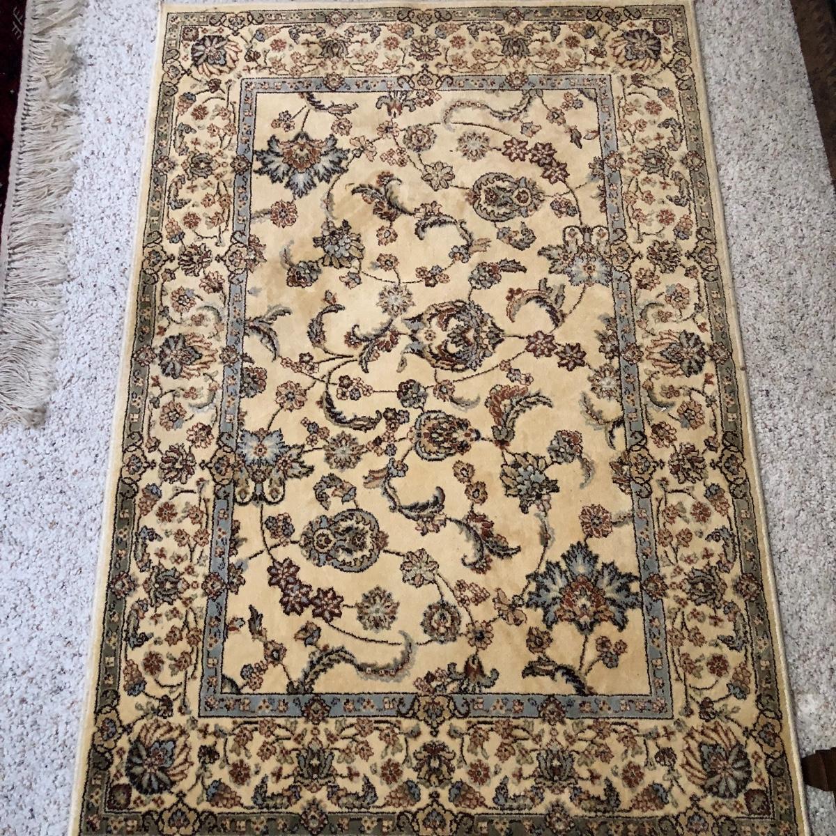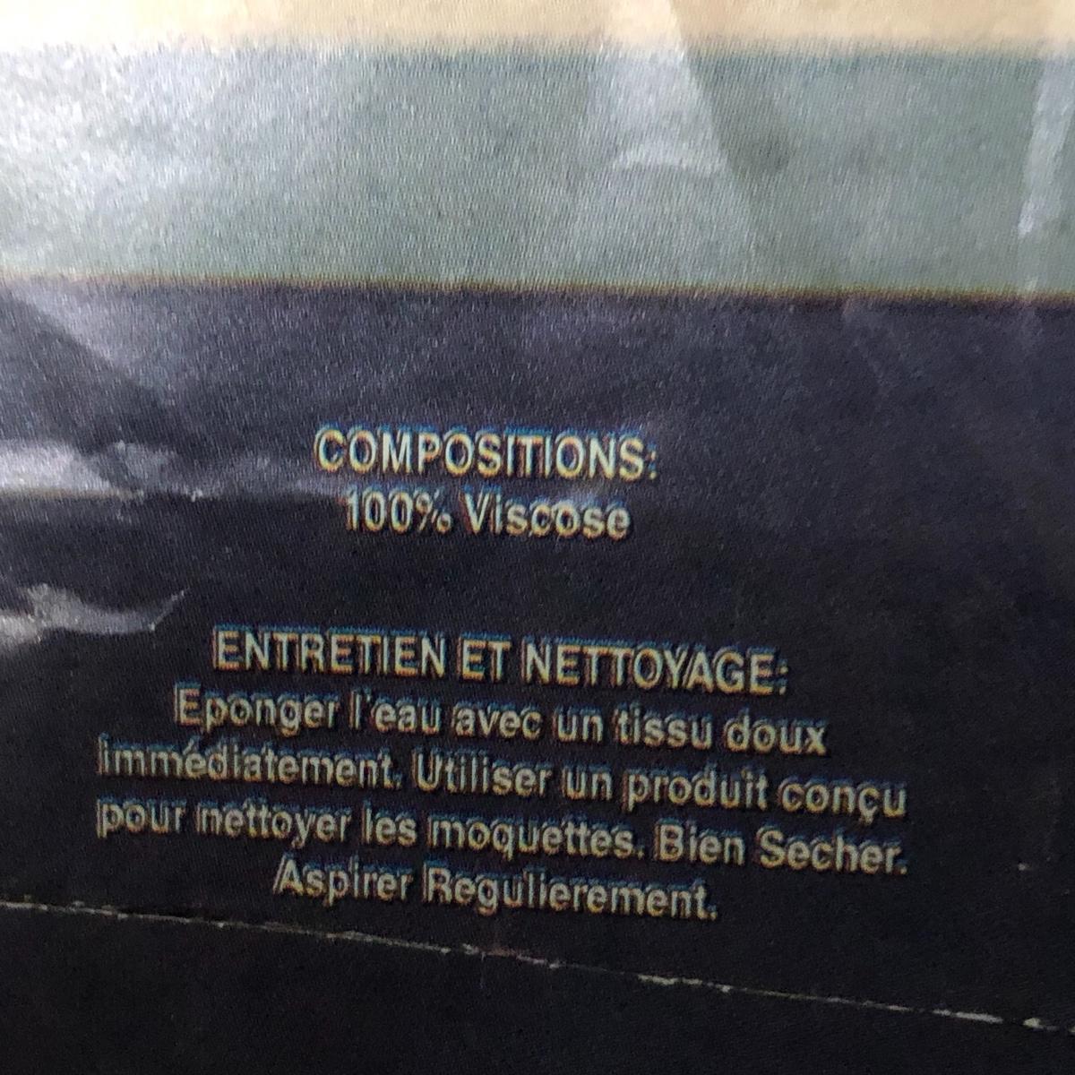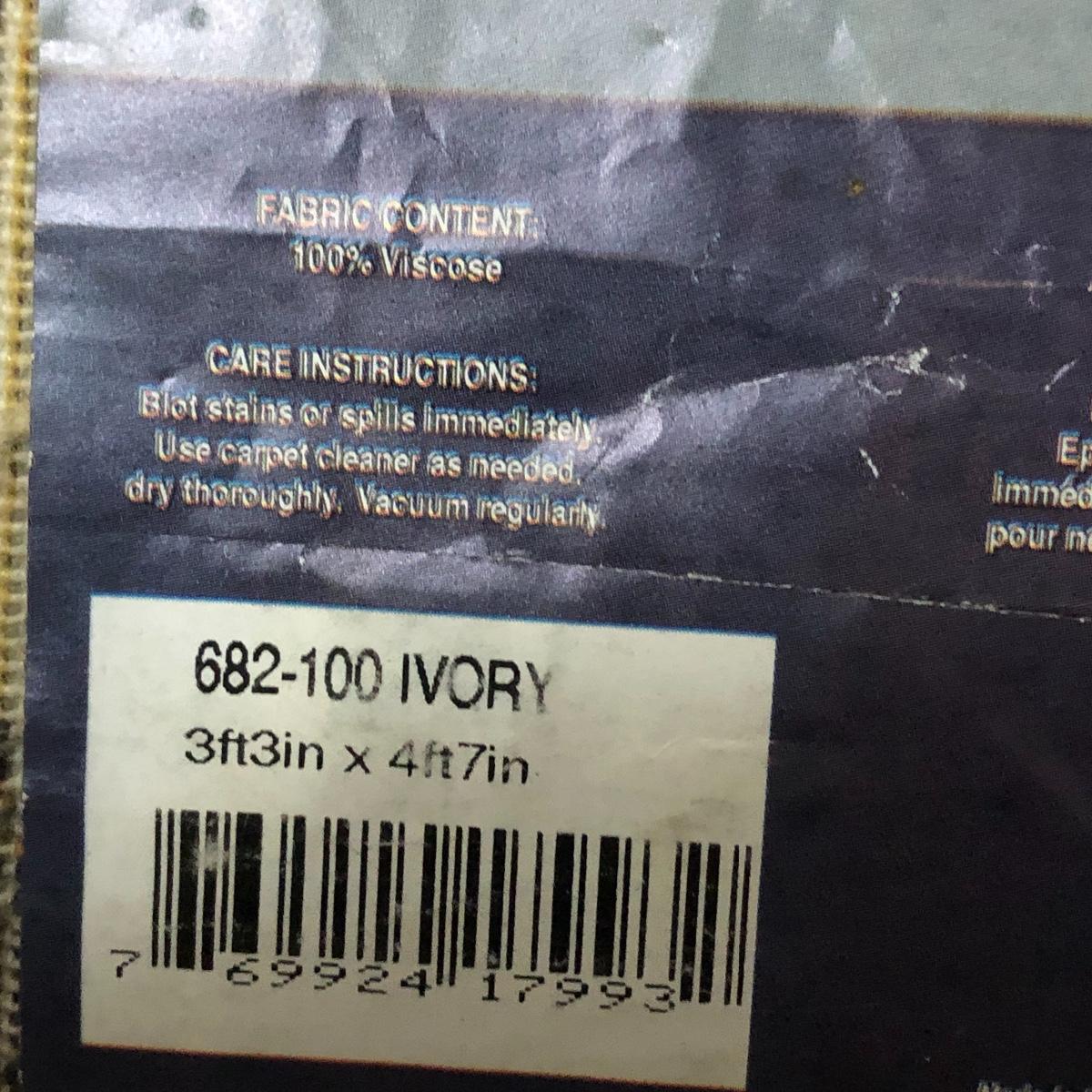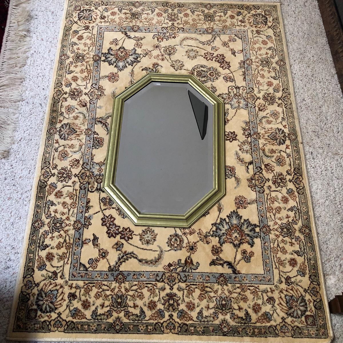 Rug measures 3ft 3in x 4ft7in; mirror measures 17” x 25”. Rug is 100% viscose. Local pick up only.