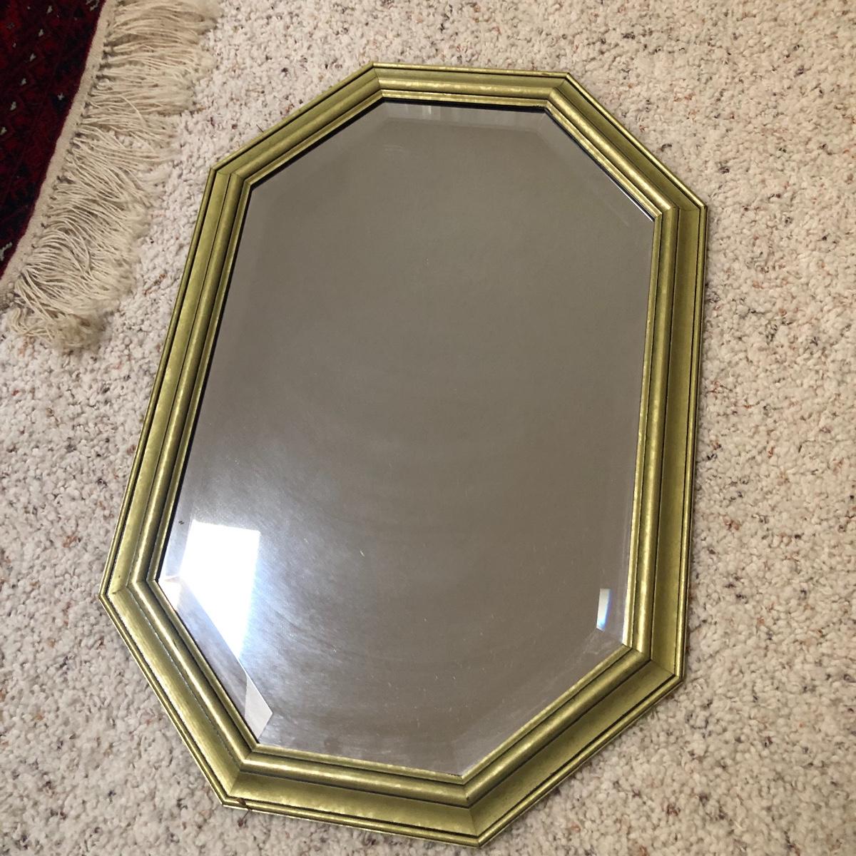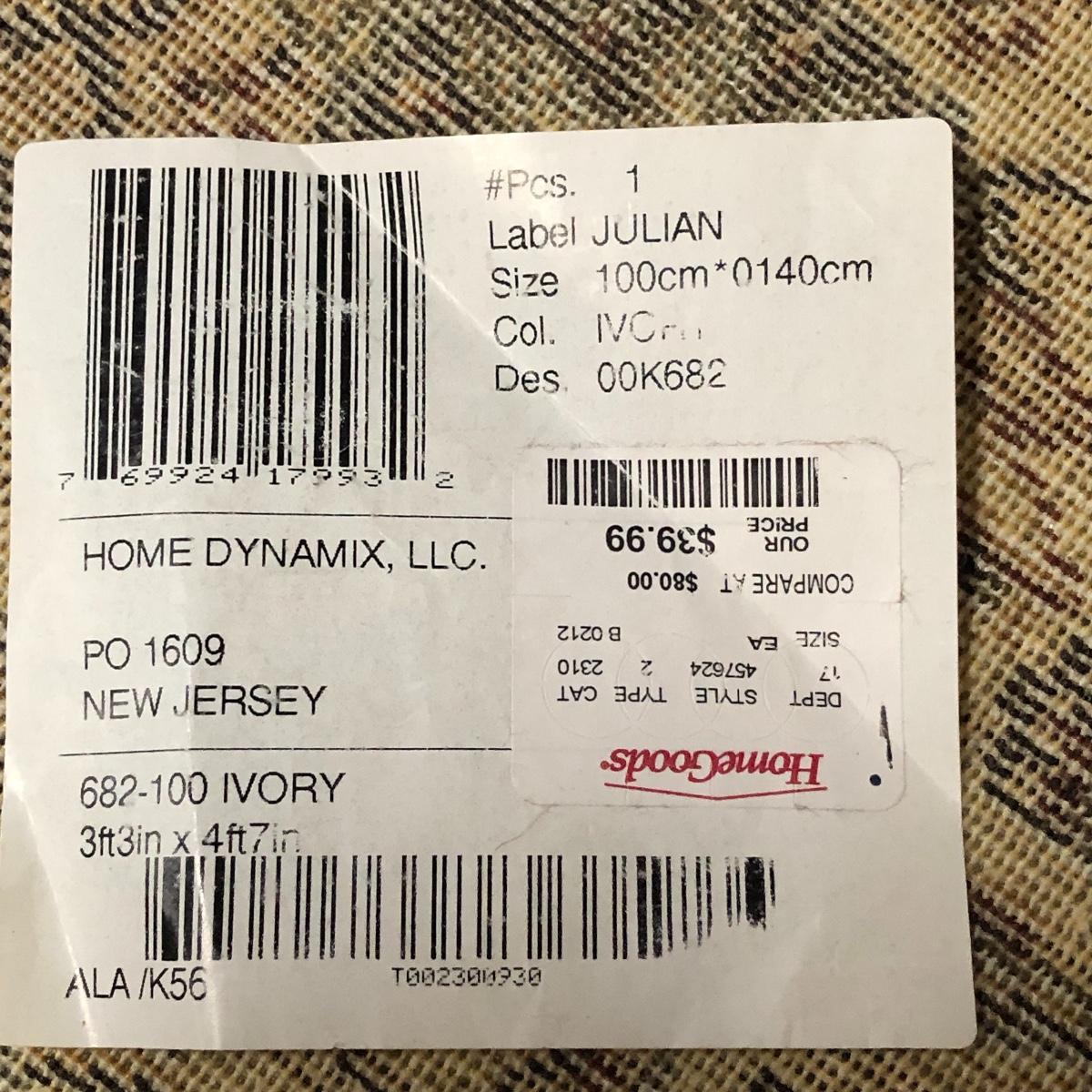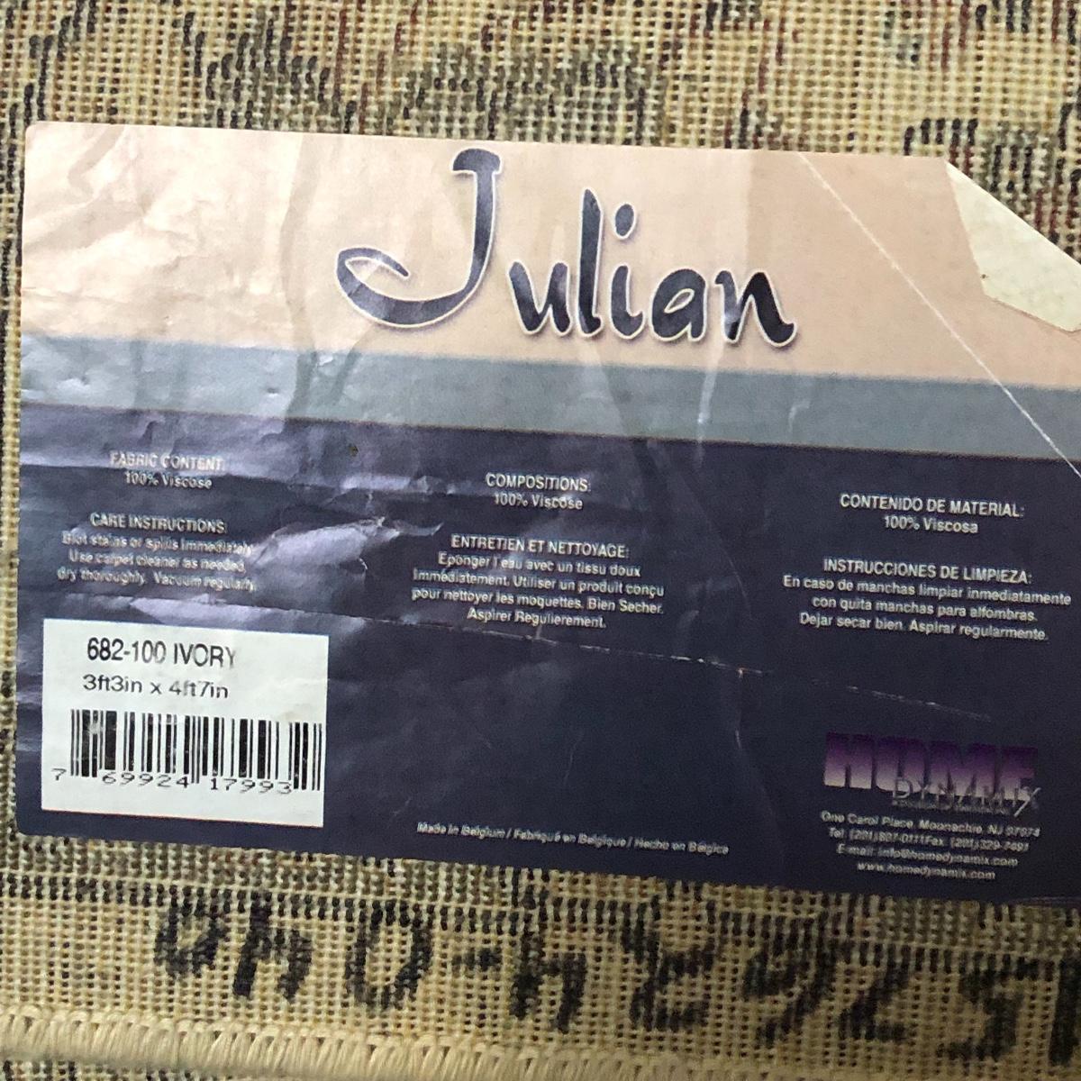 Rug measures 3ft 3in x 4ft7in; mirror measures 17” x 25”. Rug is 100% viscose. Local pick up only.