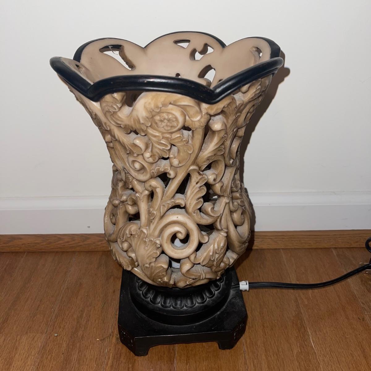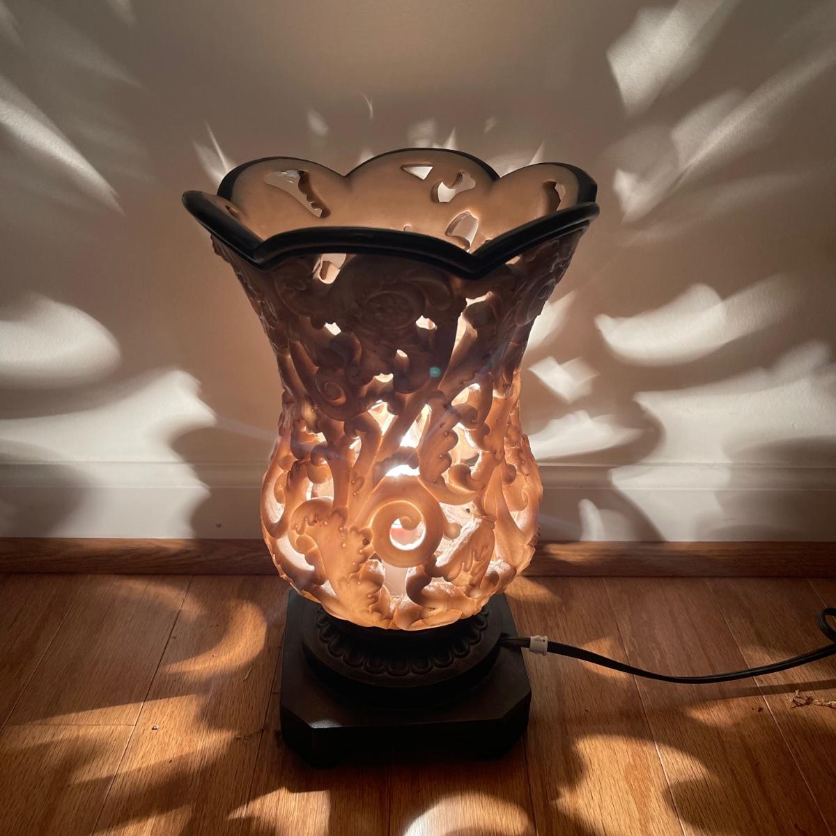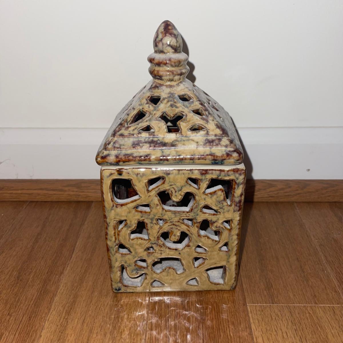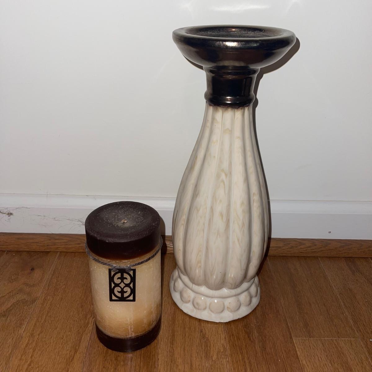 Lot includes a standing candle holder, a pillar candle, a ceramic candle holder with a lid, and a resin decorative lamp. Both the candle stand and lamp are 12.5” tall. The lamp is in working condition.