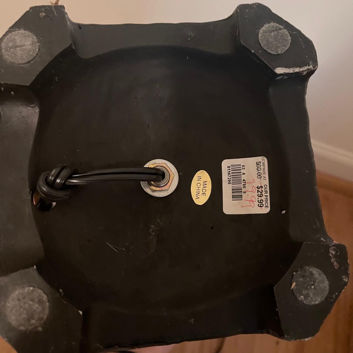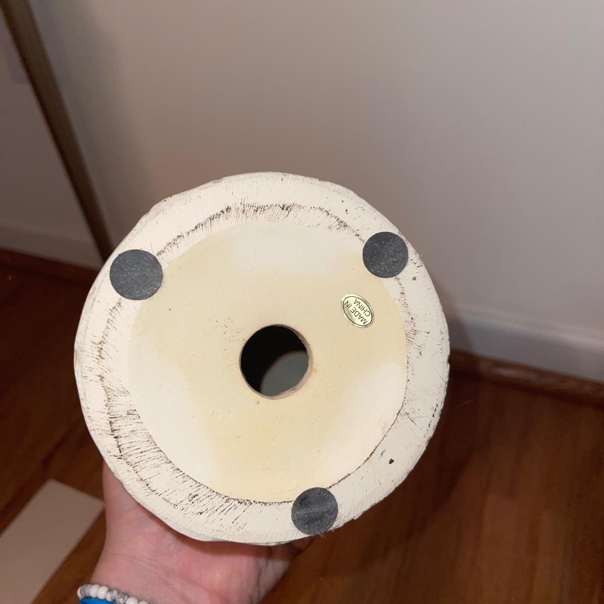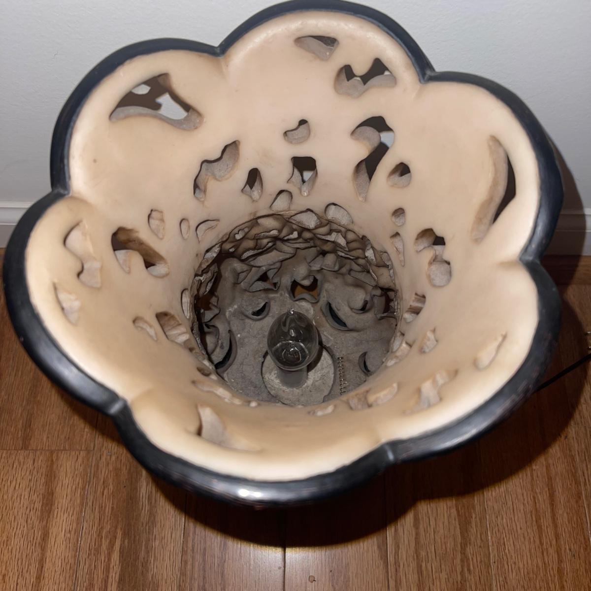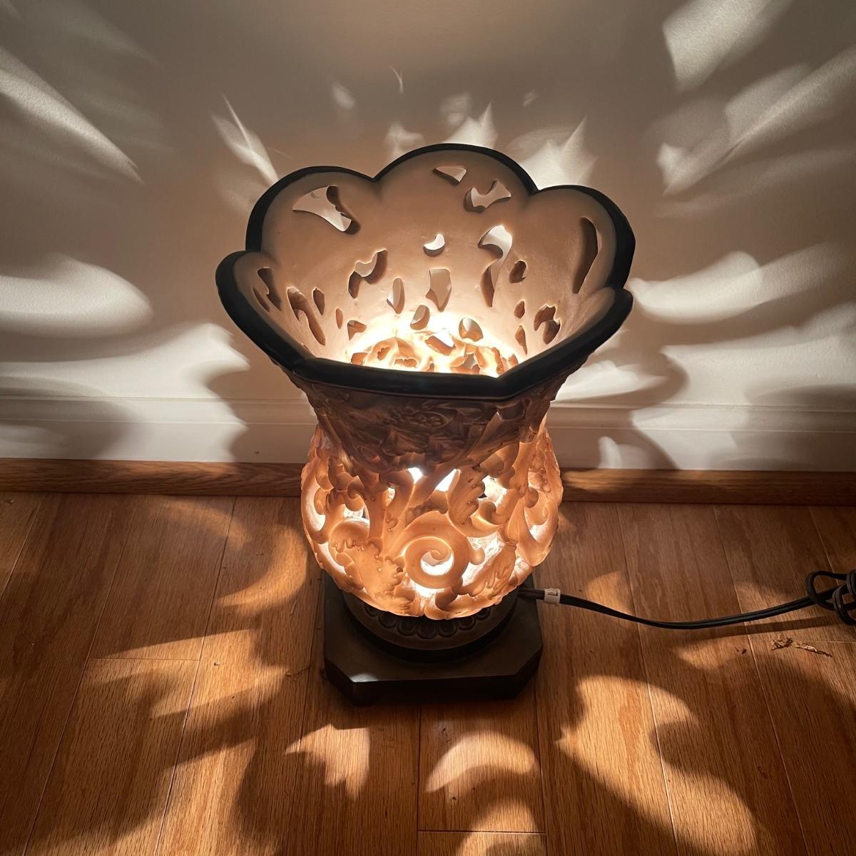 Lot includes a standing candle holder, a pillar candle, a ceramic candle holder with a lid, and a resin decorative lamp. Both the candle stand and lamp are 12.5” tall. The lamp is in working condition.