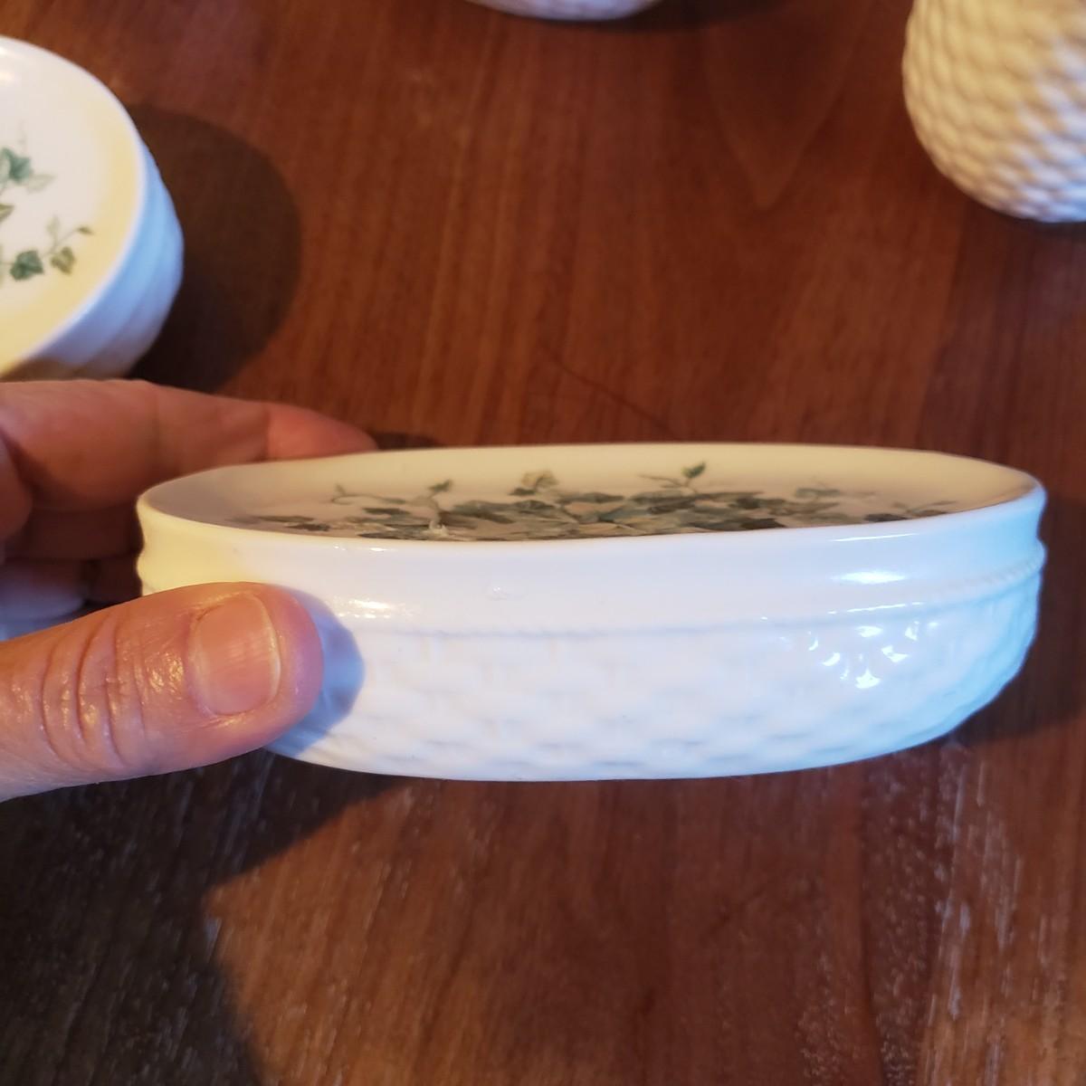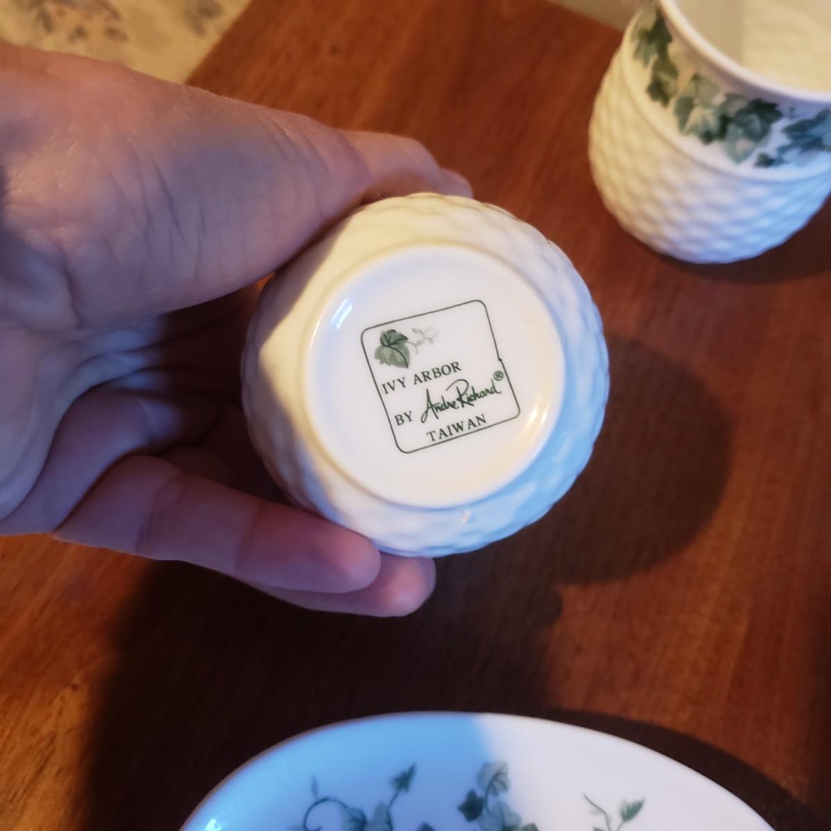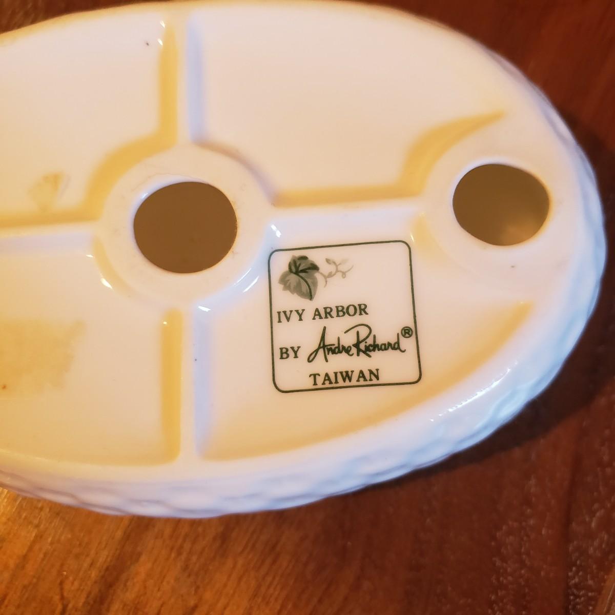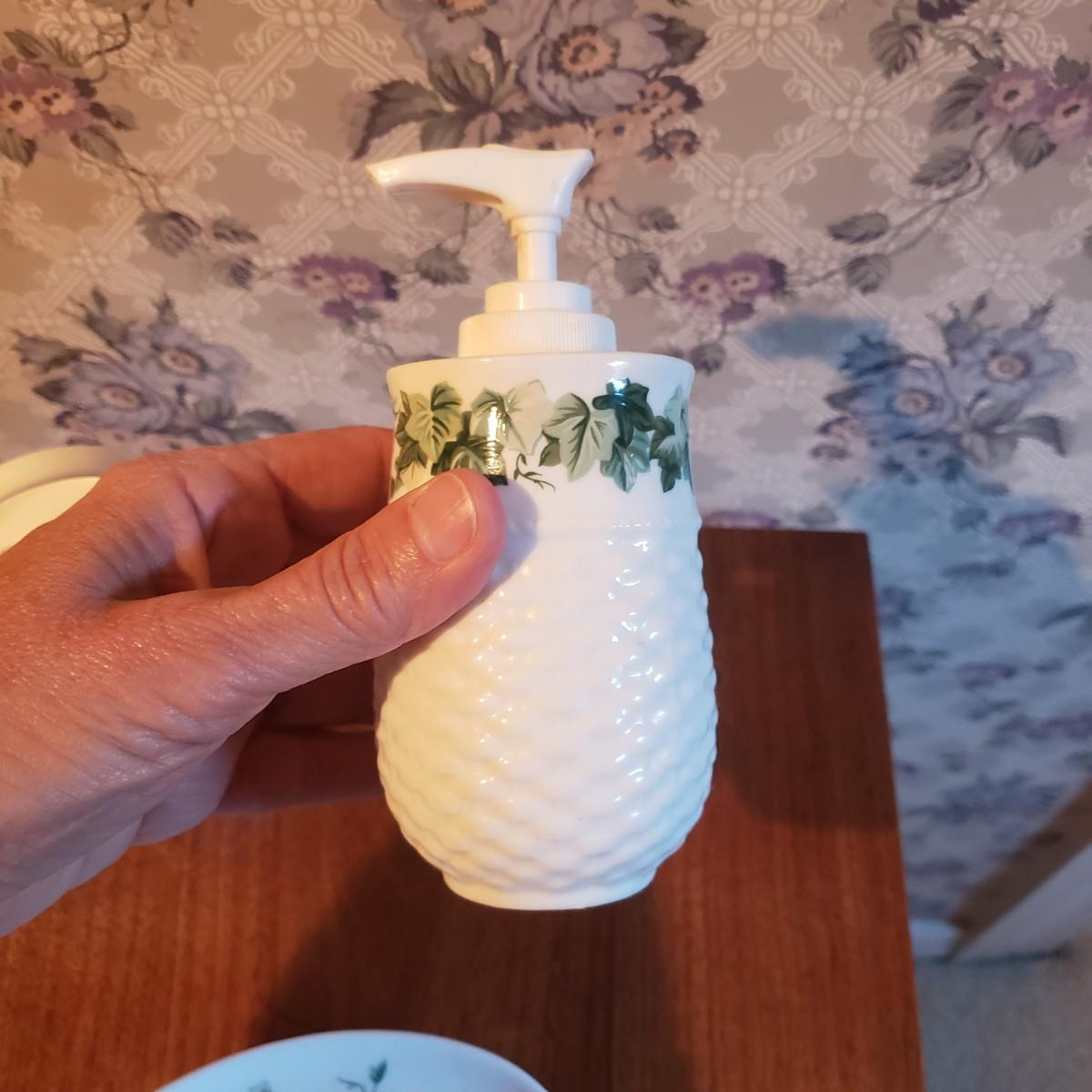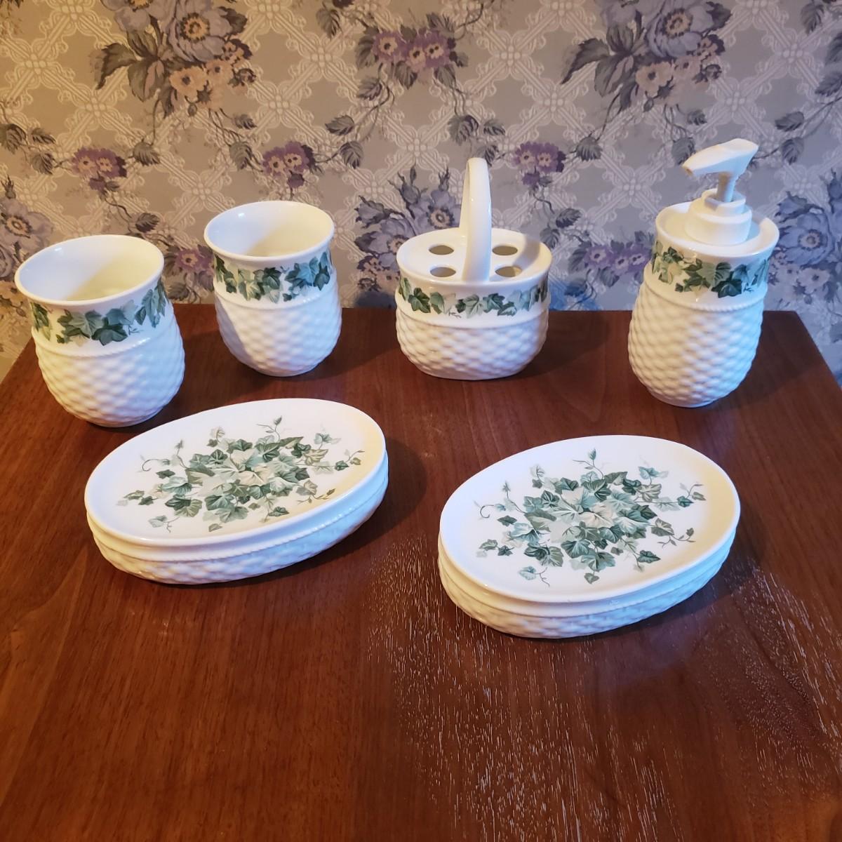 This six piece ceramic bath accessory set is Ivy Arbor by Andre Richard. The set features a green ivy pattern. The set includes two soap dishes (5"x 1"), a soap pump dispenser (3" x 6"H), two cups and a toothbrush holder.