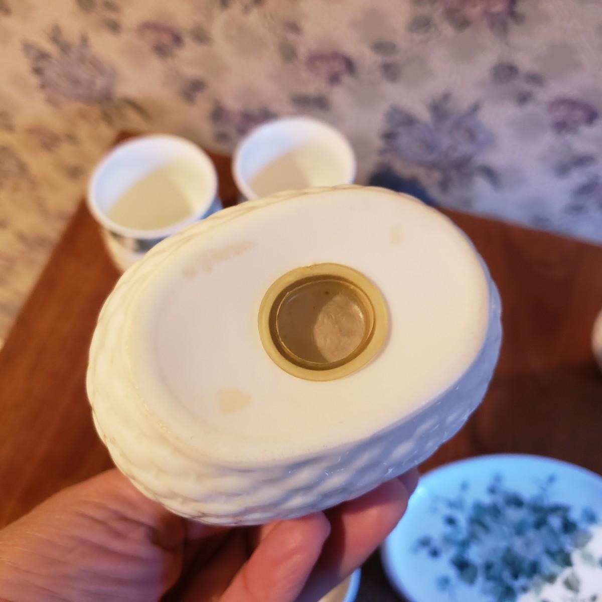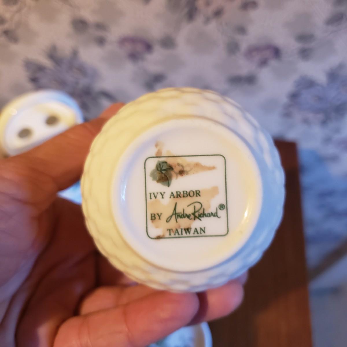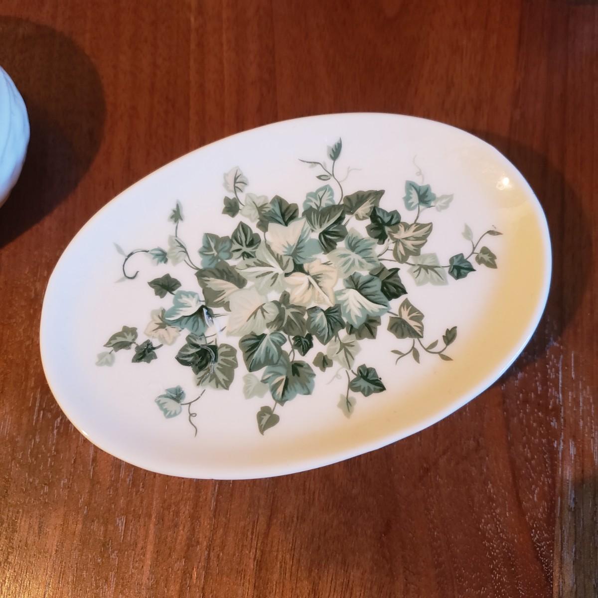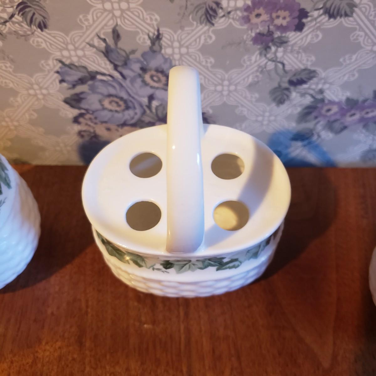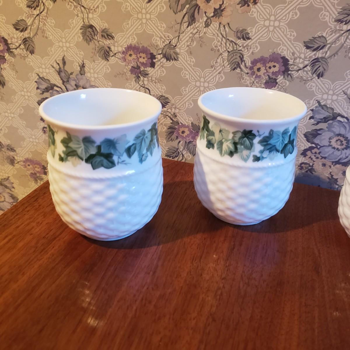 This six piece ceramic bath accessory set is Ivy Arbor by Andre Richard. The set features a green ivy pattern. The set includes two soap dishes (5"x 1"), a soap pump dispenser (3" x 6"H), two cups and a toothbrush holder.