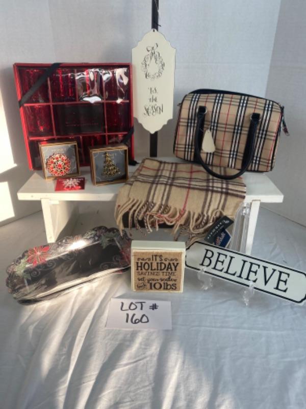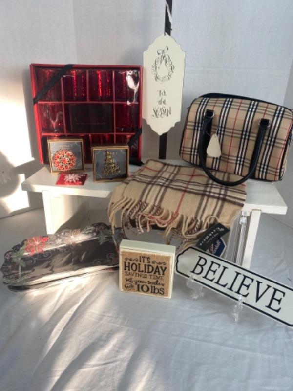Plaid Designer Style Handbag, scarf, jewelry , signs paper products, candles, votives