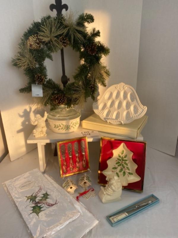 Lenox Holiday Lot with Wreath, Egg Plate, Serving Dish, tea towel, Santa birdhouses, veggie dish, Lenox Santa figurines, letter opener