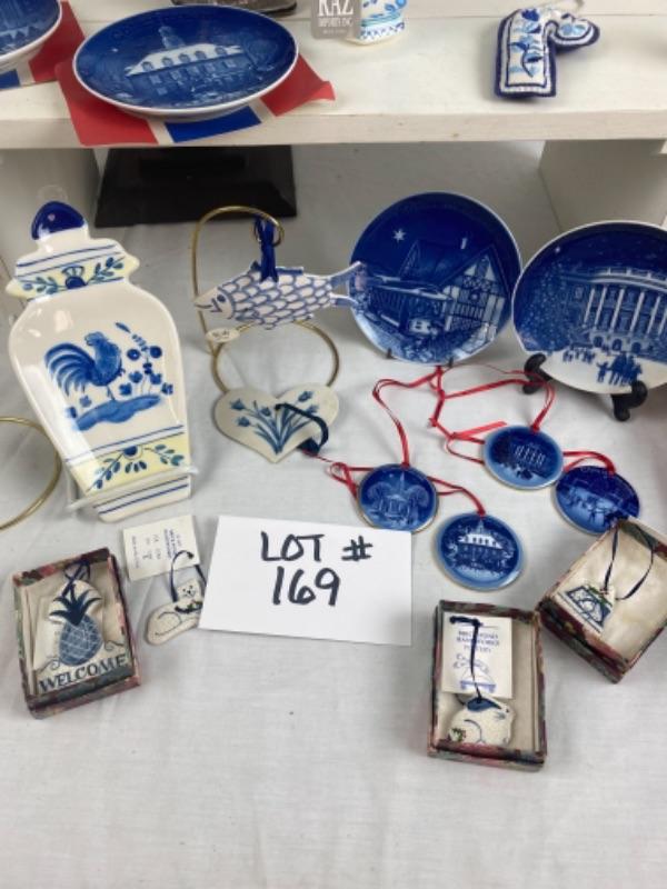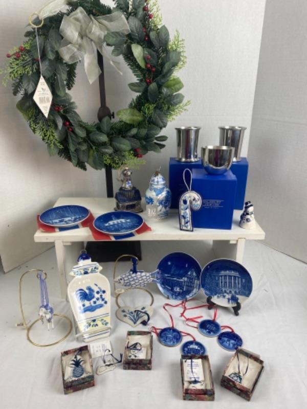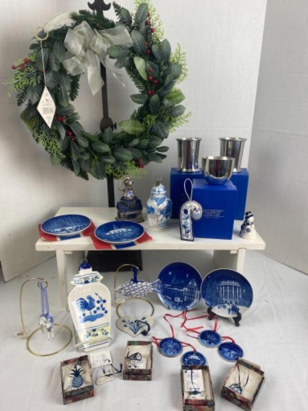 Blue and White Lot with Hallmark Wreath and Salisbury Pewter cups, Bing and Grondahl Plates, ornaments, wreath is by hallmark and measures approximatley 14” round