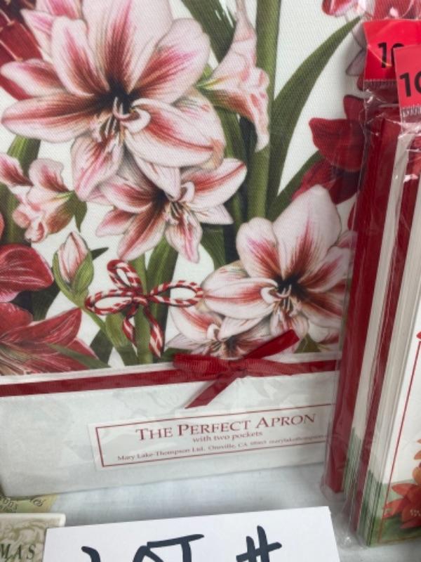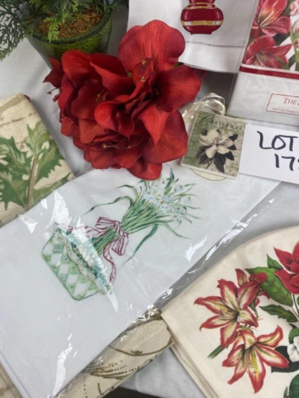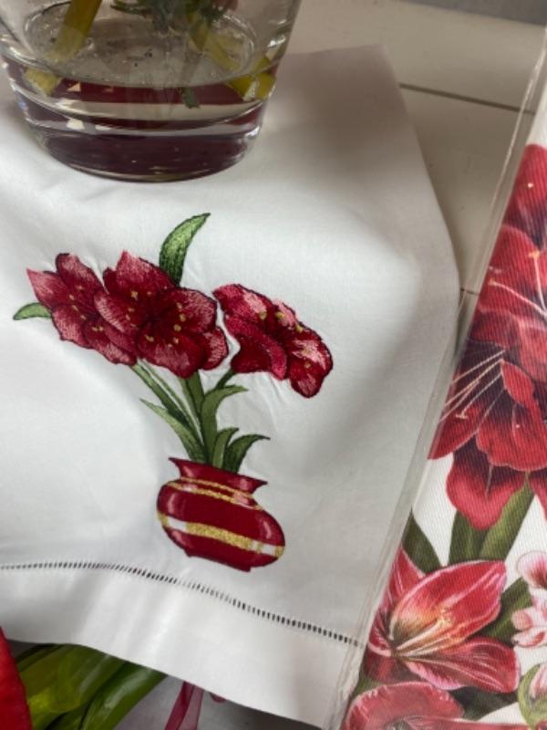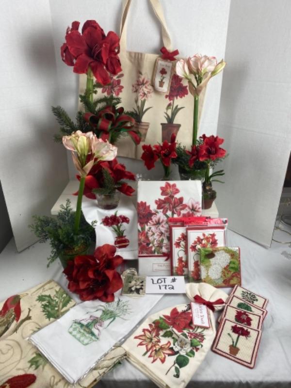 Faux Amaryllis Plants, Needle point coasters, tea towels, canvas bags, paper products