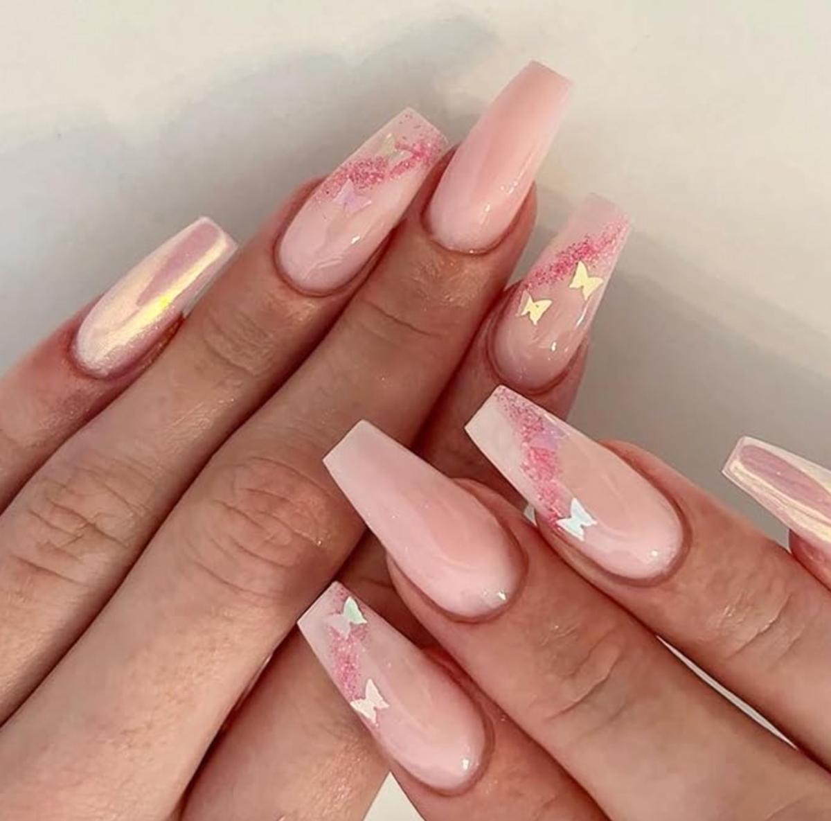 J - 24Pcs Square Press on Nails Medium Coffin French Cute Nude Pink Glitter Butterfly Fake False Nails Glossy Acrylic Nude Nails Full Cover Glue on Nails for Women