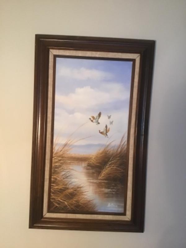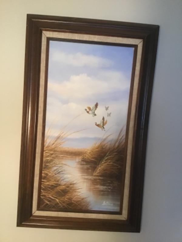 J - 516  Vintage Tempura Painting by Daniel Ambrose  “ Mallard Ducks in Flight