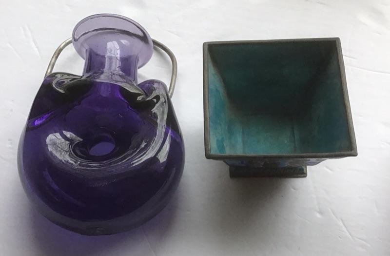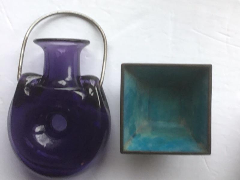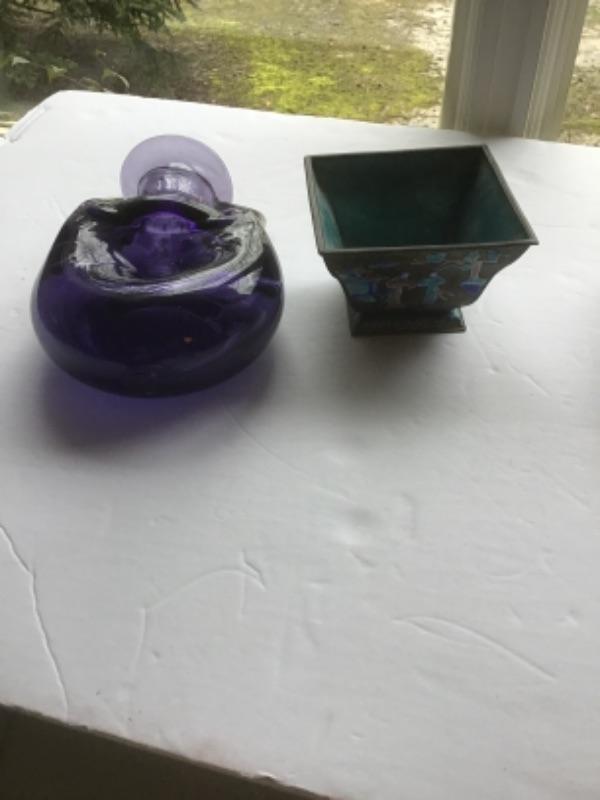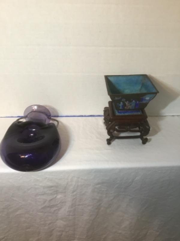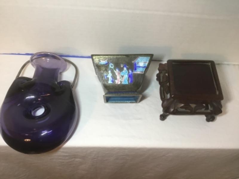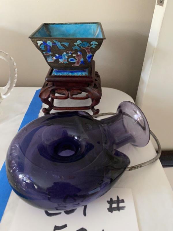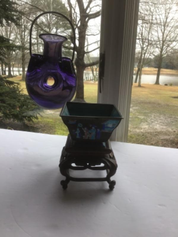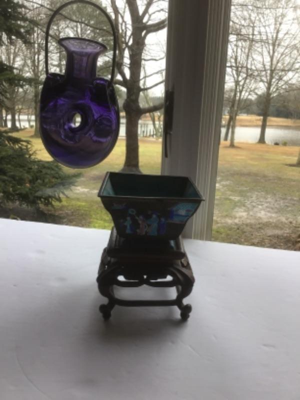 J- 536 Signed Hand Blown Glass Hanging Vase & Japanese Enamel Cloisonné on Stand