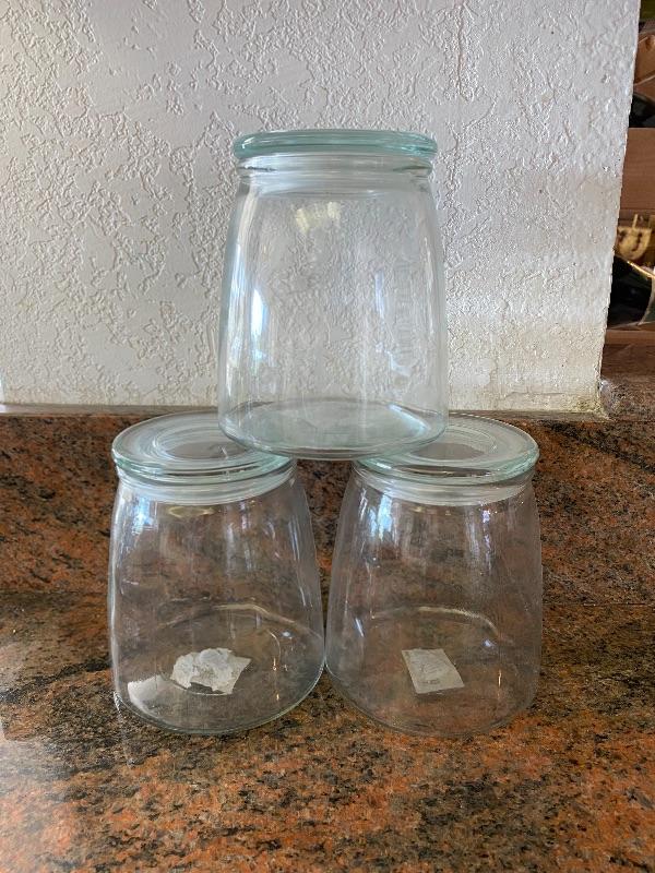 Set of 3 clear glass canisters. Flat lid has a seal inside for an air tight fit. Good condition. About 6" size.