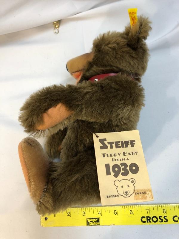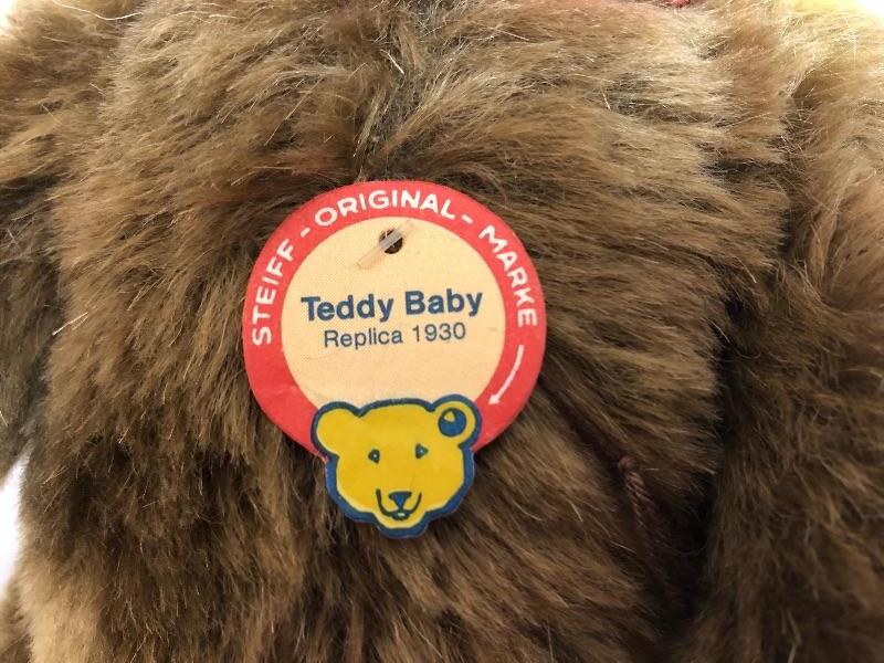 Brown teddy Baby replica teddy bear from Steiff. Red collar. Jointed limbs. Original tags. Feet have been signed by Steiff designers.