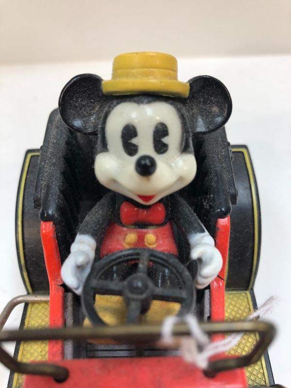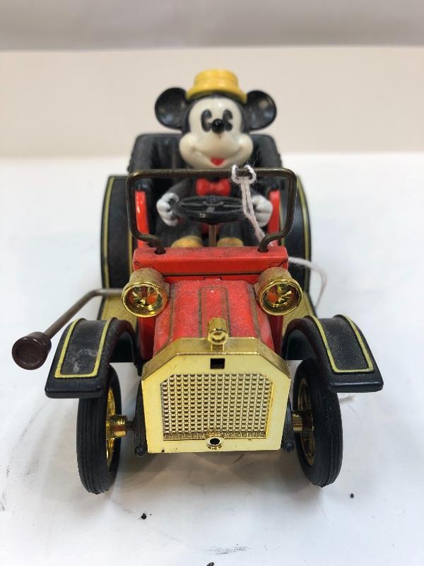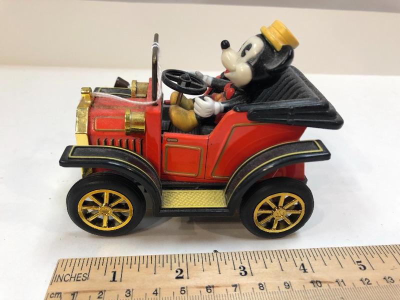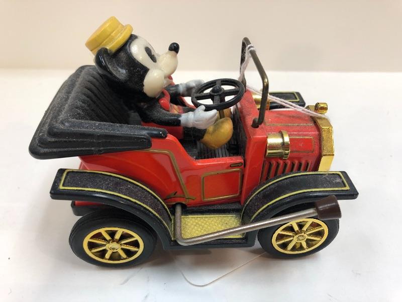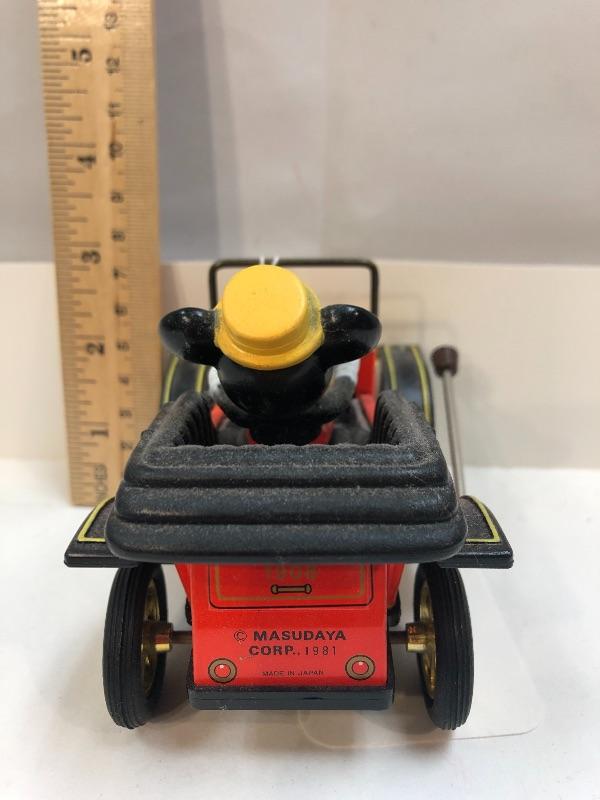 Masudaya vintage lever action tin toy car. Red tin car with Mickey Mouse driving. Dated 1981. Light wear from age, dusty from display.