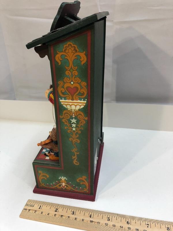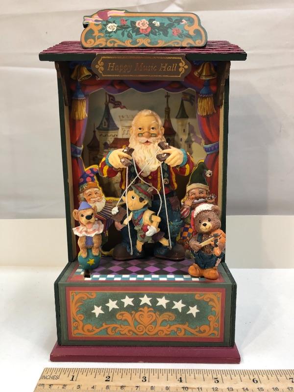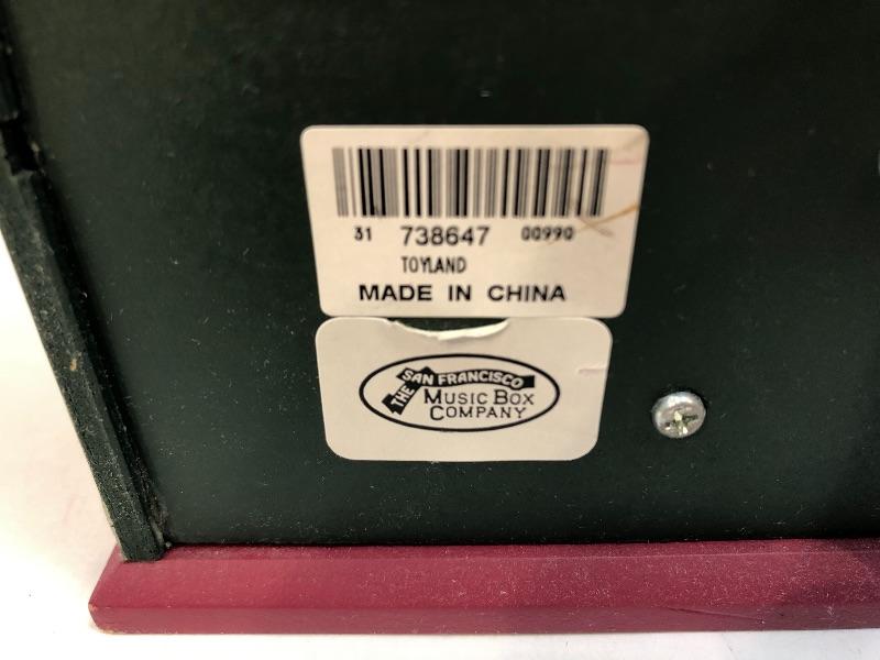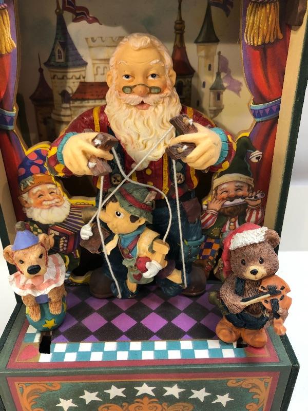 The San Francisco music box has Santa Claus as the puppeteer in a puppet show. Great for year round display. Plays Toyland.