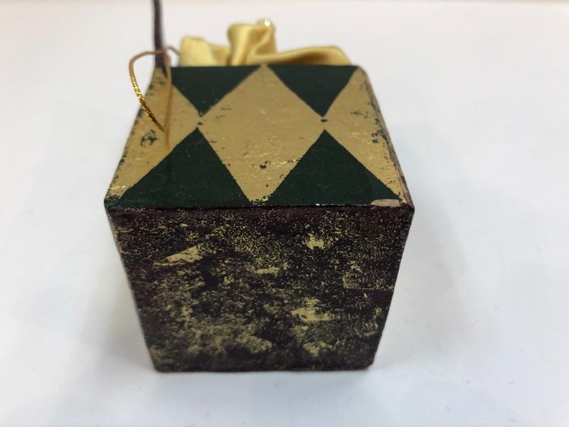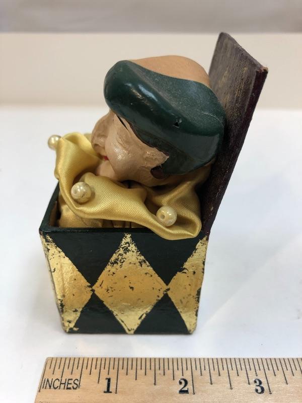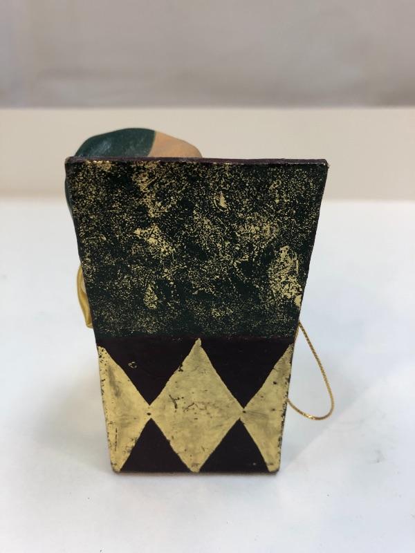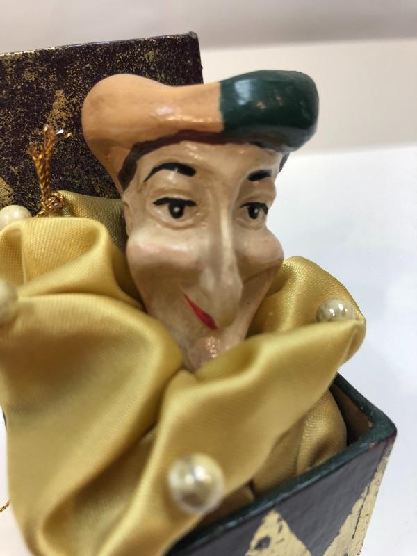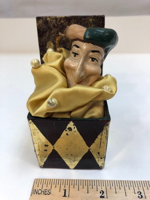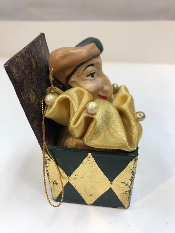 Small jack in a box tree ornament. Sits on surface or hang. About 3" size.