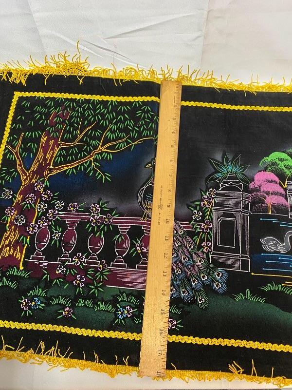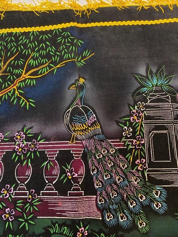 Cool vintage black velvet pillow cases. Painted black velvet, like the vintage pictures. Features a peacock in a garden. Probably glow under a black light. Yellow fringe edge. Great vintage condition. Possibly never actually used, based on the estate they come from.
