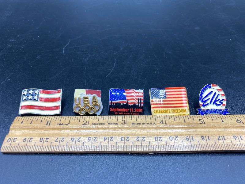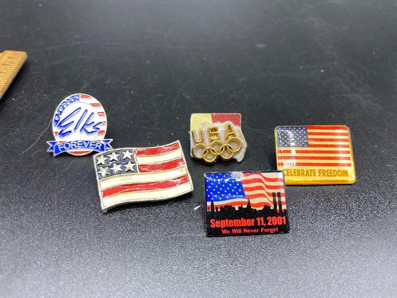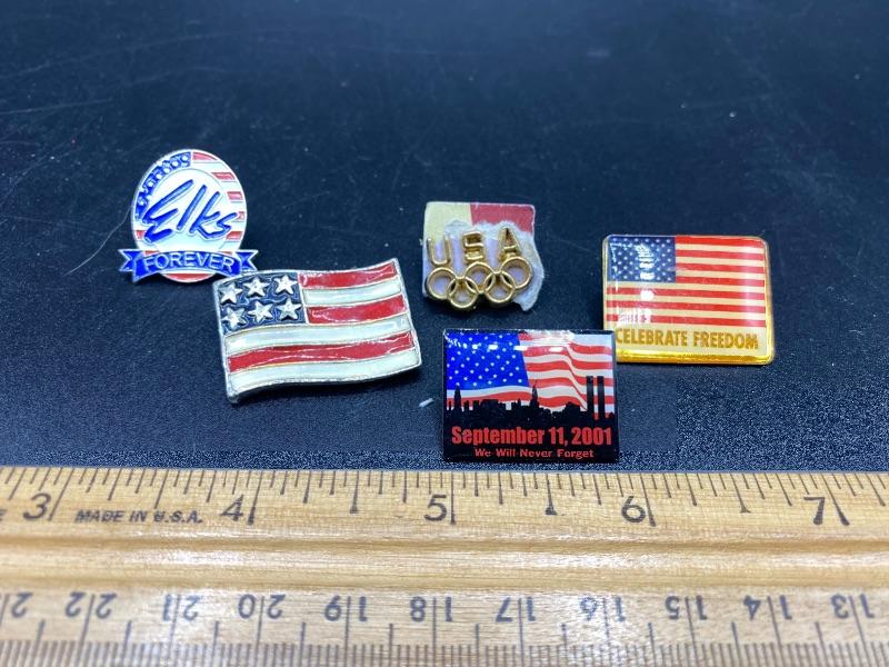 Lot of 5 patriotic lapel pins. All about 1" size.