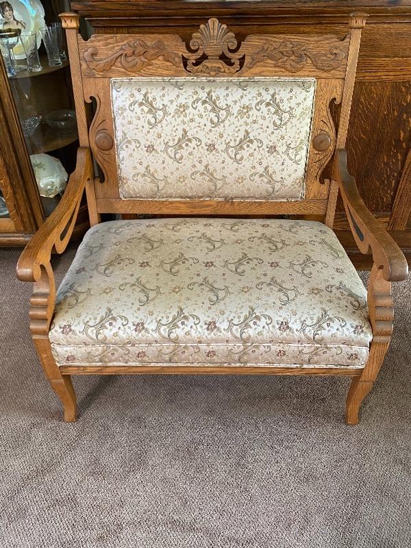 Antique light oak settee loveseat. Beautifully carved wood frame. Light colored upholstery seat and padded back, do not think it is original to the seat based on the underside. Measures about 36" across, 40" at the highest spot of back, and 24" deep. #24-10009
