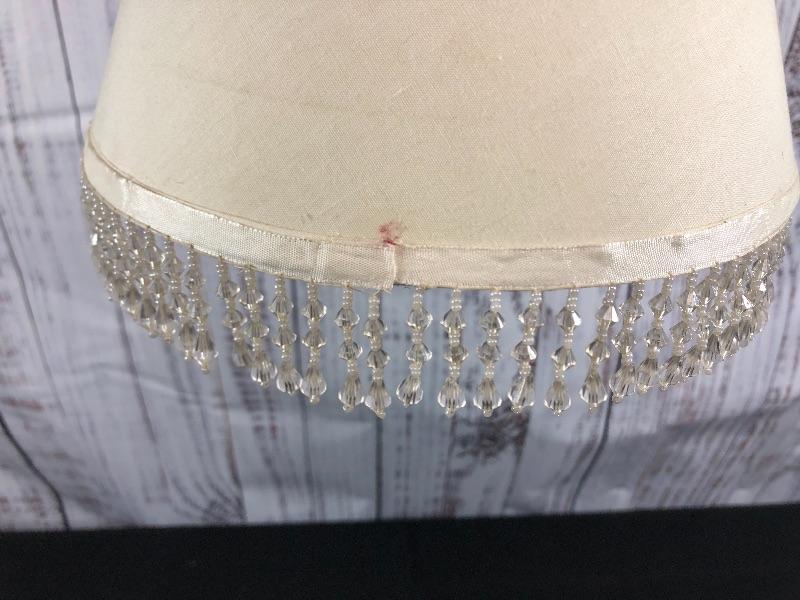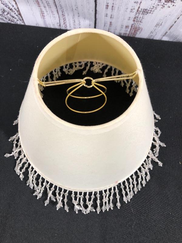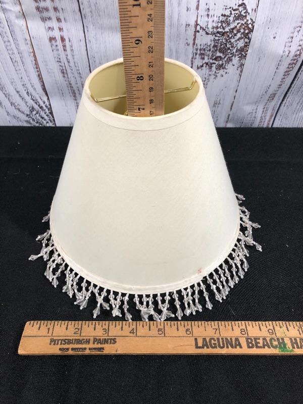 Small off white lamp shade. About 8" size. Clips on to bulb. Has a beaded fringe edge. Does have a small spot near edge.