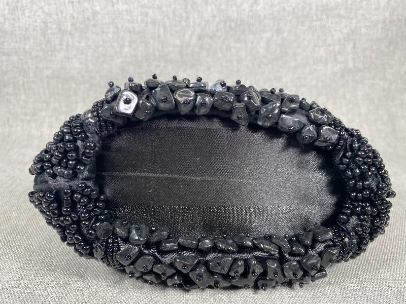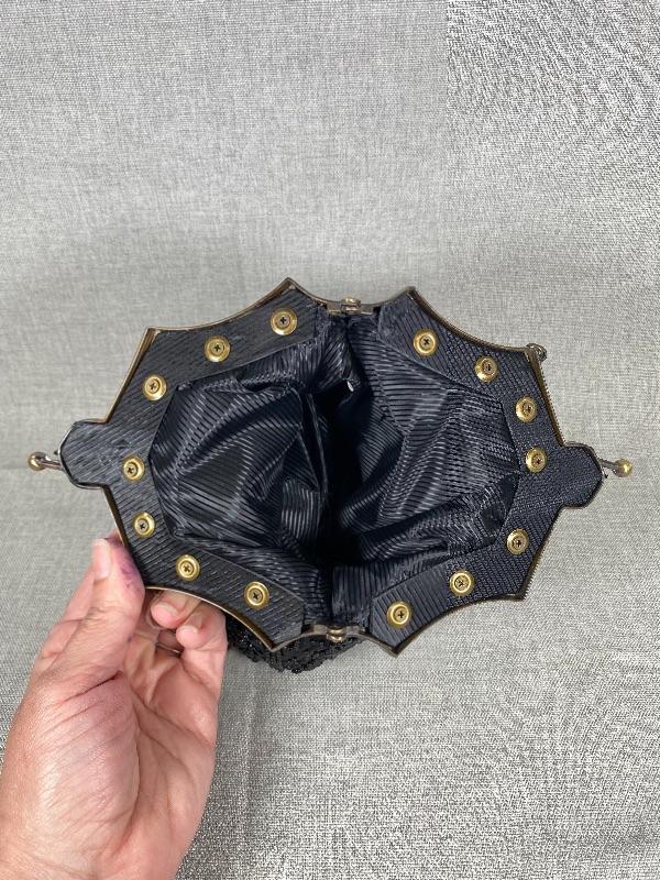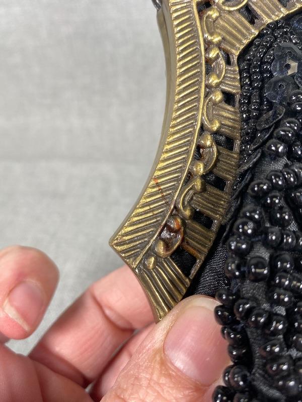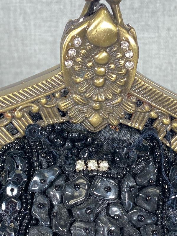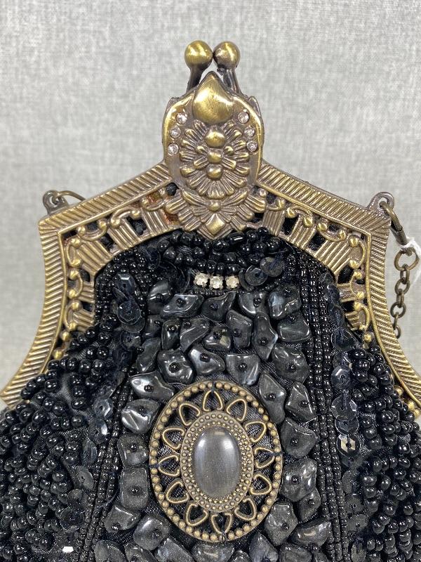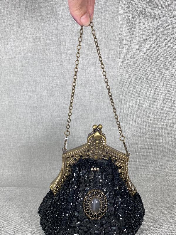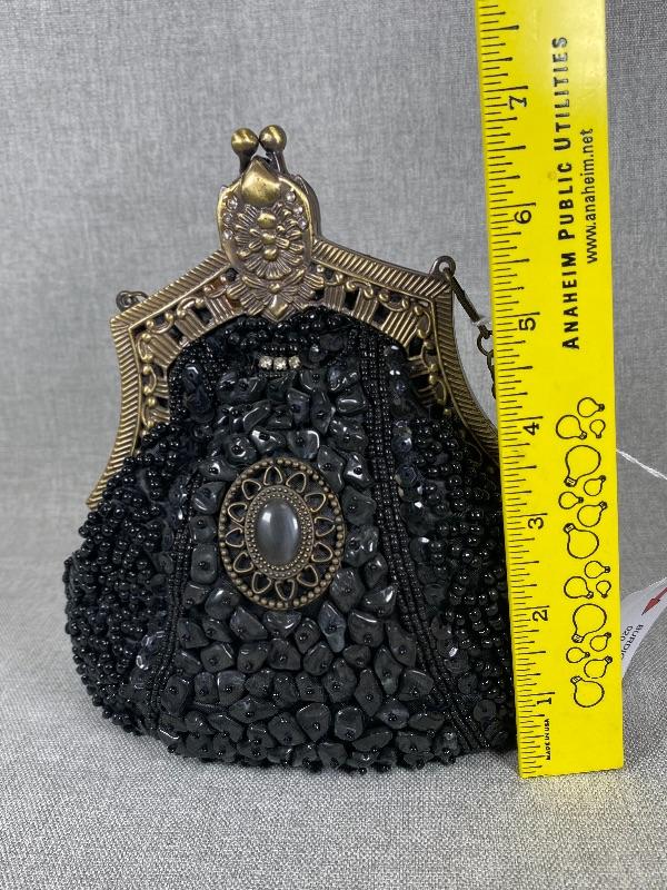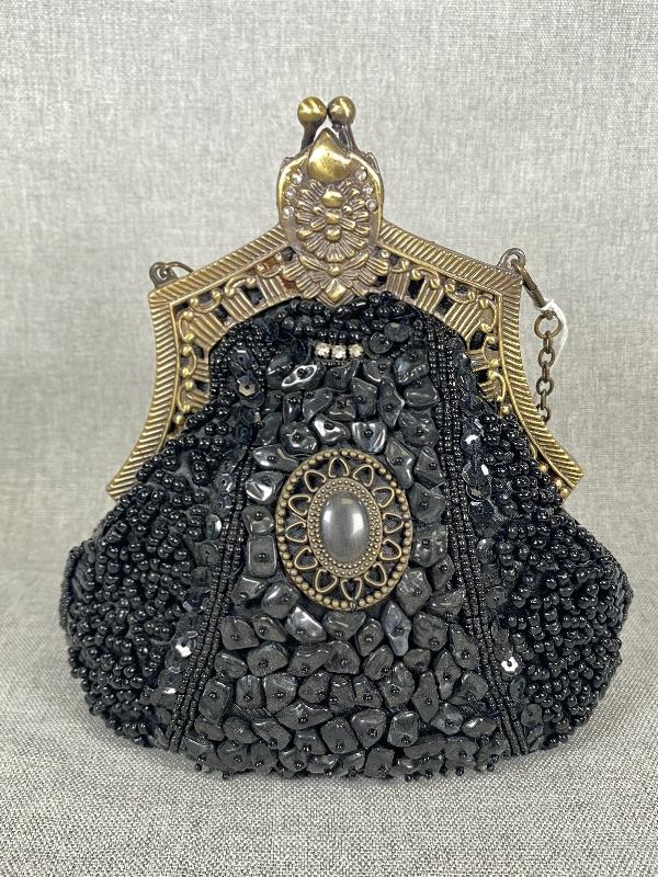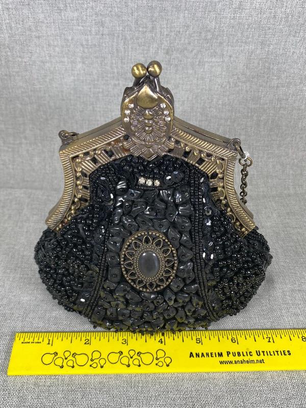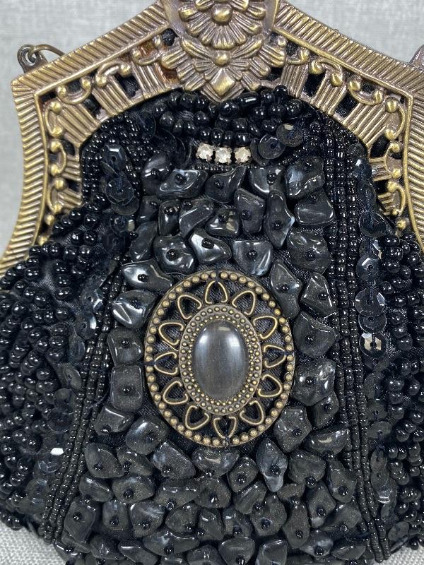 Black beaded handbag. Fully covered in multiple styles of black beads. Brass tone metal and center embellishment. Newer purse meant to look older. It seems a bit dusty and could use a cleaning. Did notice a loose thread near the latch on one side. About 7" not including chain.