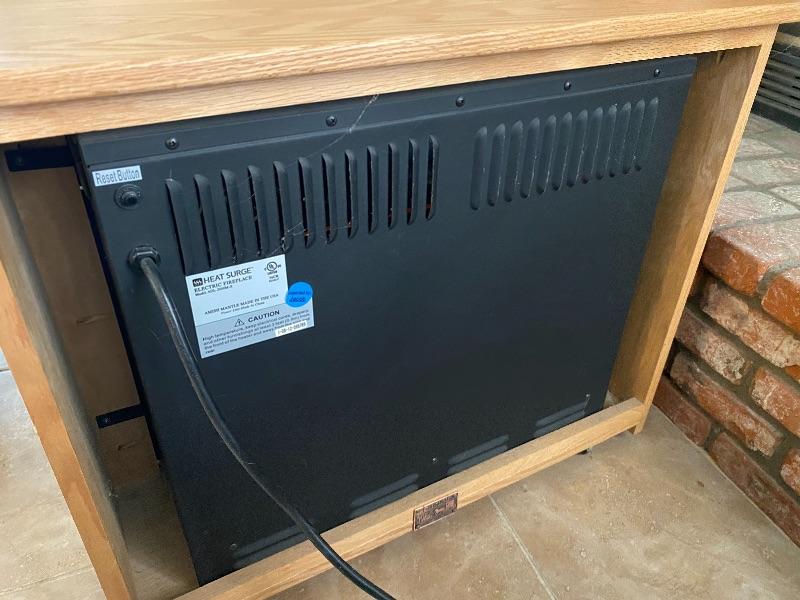 Heat Surge electric fireplace heater. Multi speed fan. Dimmer for fire light. Tested and works. Nice wood cabinet surround. Large size, about 32"across and 26" tall. Narrow at about 12" deep. Close to fireplace size, see photos in front of actual fireplace. #030-2000