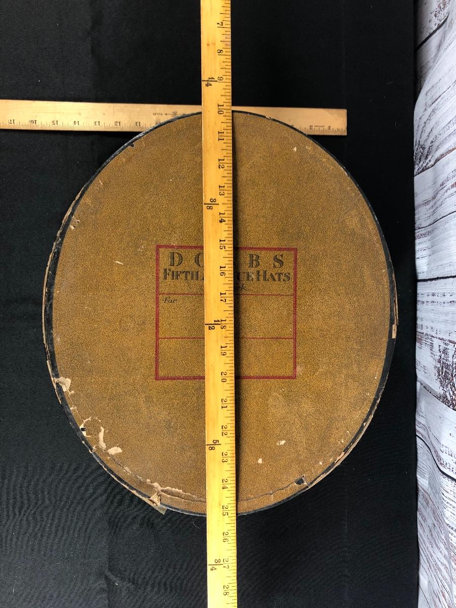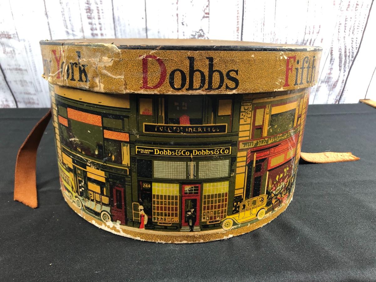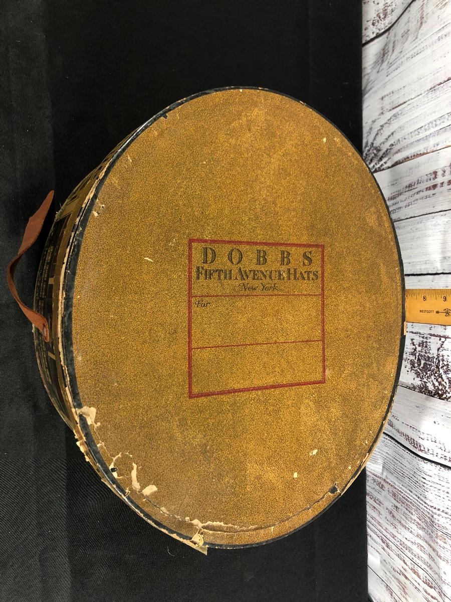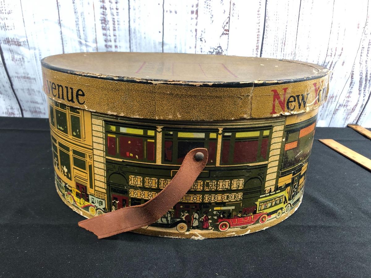 Vintage Dobbs Fifth Ave New York hat box. Round hat box with a city street picture. There is signs of age and wear, but it displays great. Original strap is attached but broken. Oval shape, about 12".