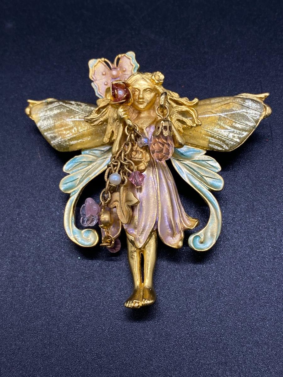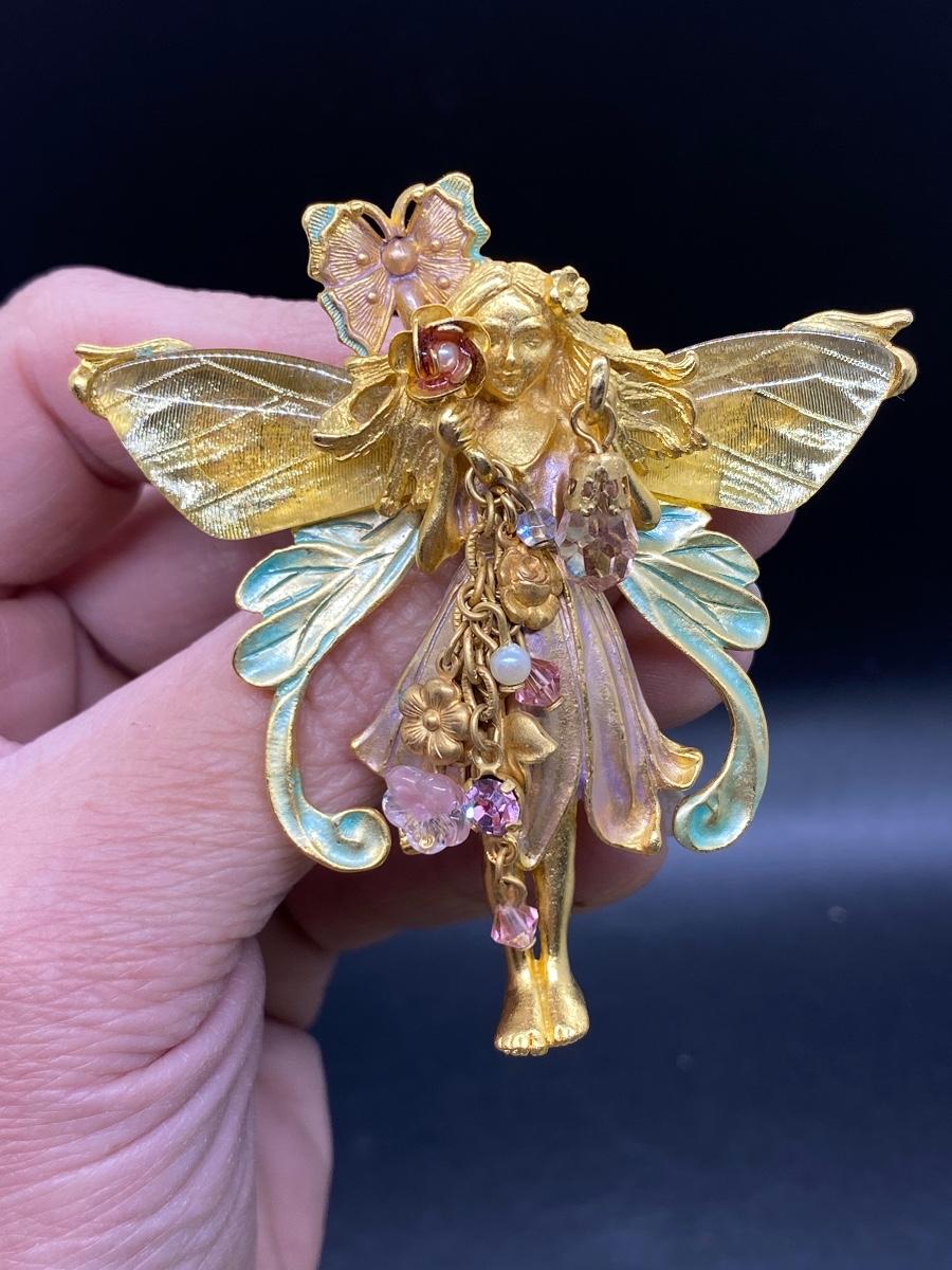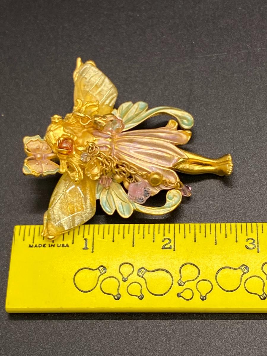Beautiful Kirks Folly angel fairy pin. Goldtone with pastel color enamels. Wings have an iridescent enamel to them. Has some dangling bead accents. About 3" size. Marked on the back.