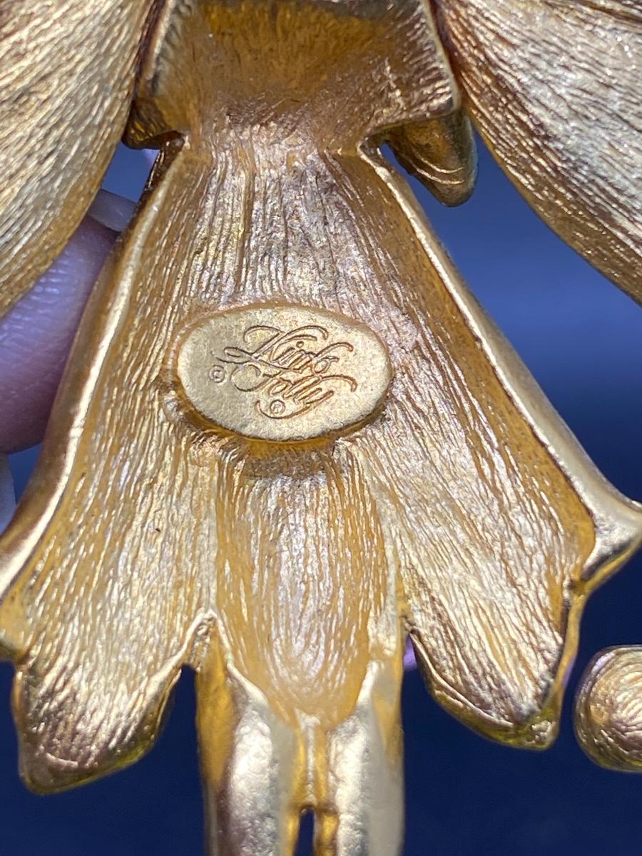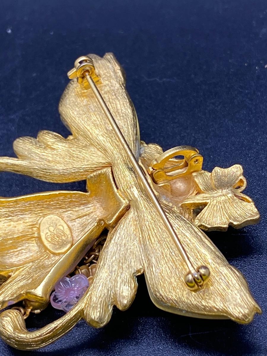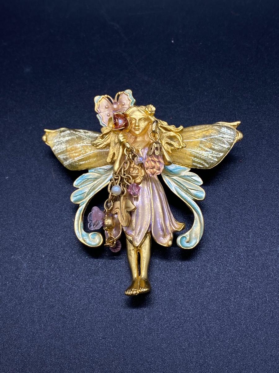 Beautiful Kirks Folly angel fairy pin. Goldtone with pastel color enamels. Wings have an iridescent enamel to them. Has some dangling bead accents. About 3" size. Marked on the back.