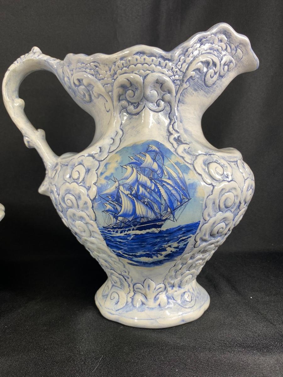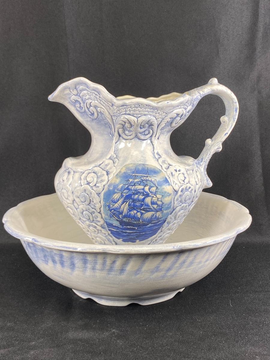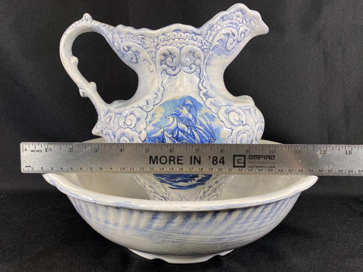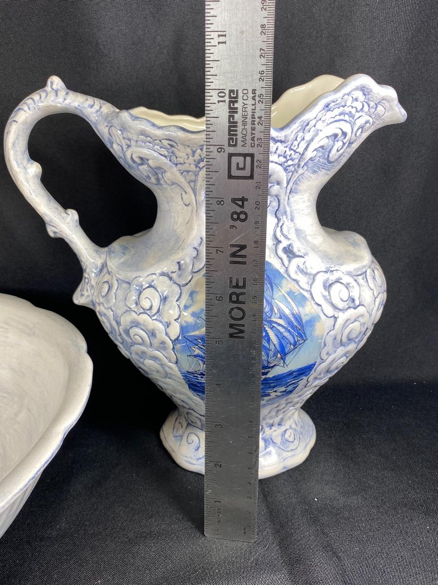 Large white and blue wash basin bowl with pitcher. Has a nautical theme with a sailing ship on the sides of the pitcher. Both pieces are signed by previous owner, who was very crafty. Ship images look decoupaged when looked at up close. Good condition, did not notice any chips. Large size, bowl is almost 12" wide and pitcher is about 10" tall.