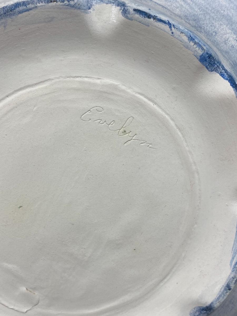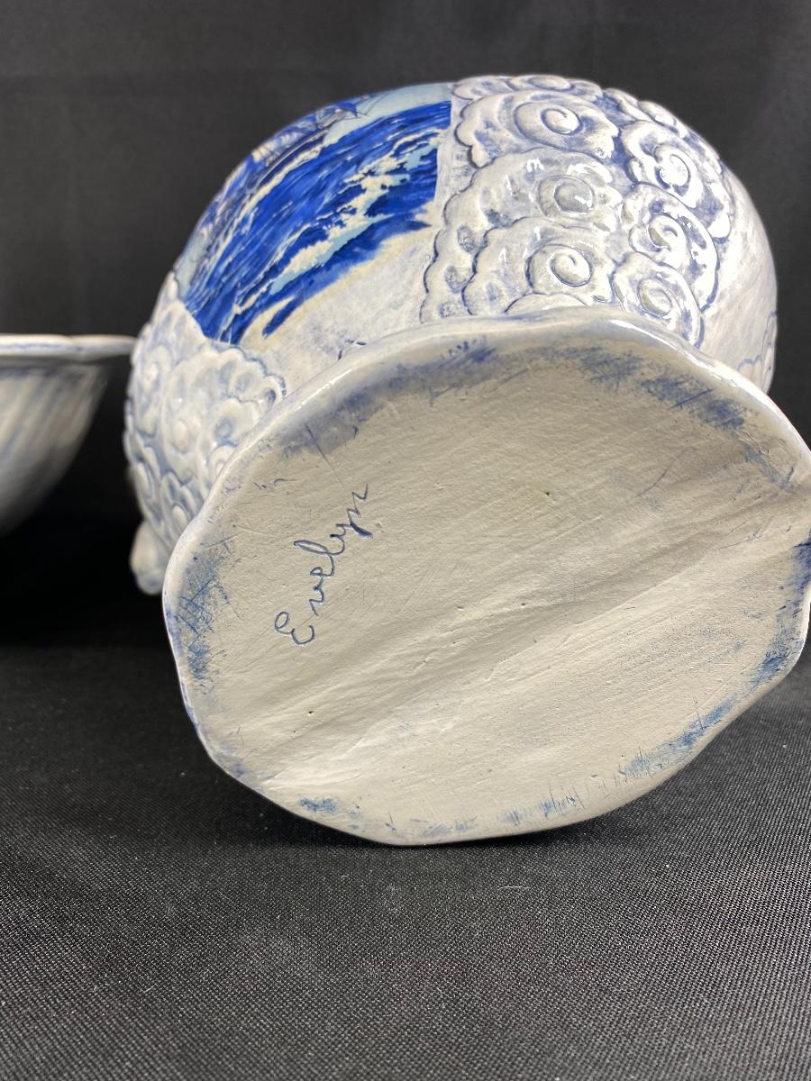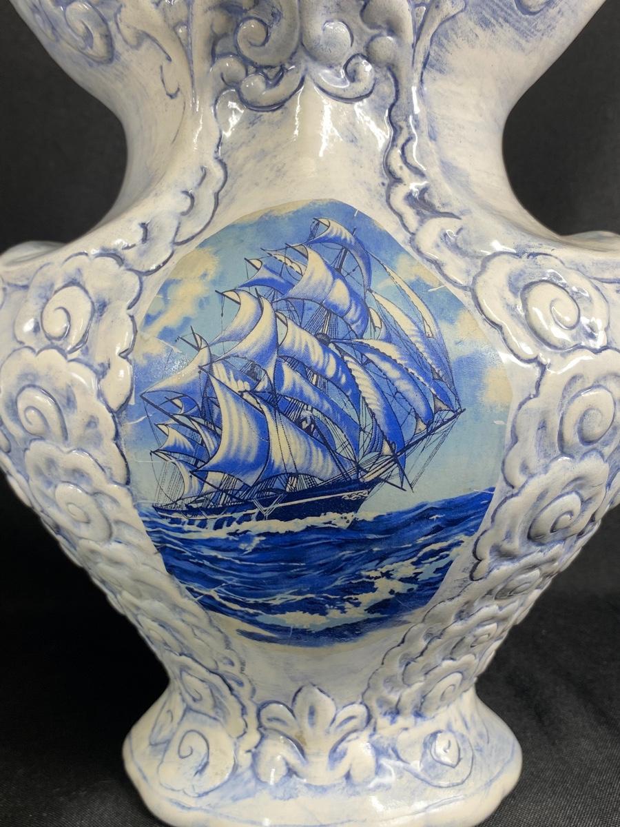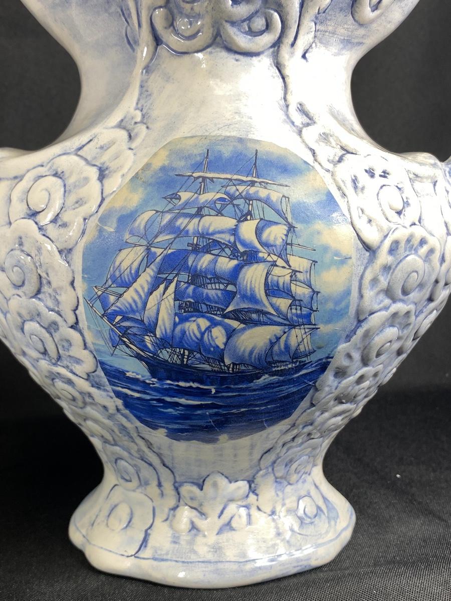 Large white and blue wash basin bowl with pitcher. Has a nautical theme with a sailing ship on the sides of the pitcher. Both pieces are signed by previous owner, who was very crafty. Ship images look decoupaged when looked at up close. Good condition, did not notice any chips. Large size, bowl is almost 12" wide and pitcher is about 10" tall.